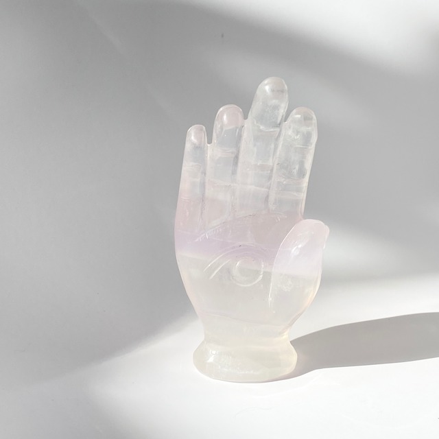 フローライトで丁寧に彫刻された、手のひらモチーフの可愛らしいオブジェです。 ほんのりピンクを帯びた優しい色合いが、空間にやわらかな光を添えてくれます。 手のひら部分には小さな“お目目”のカービングが施されており、持つ人をそっと見守るような、ユニークで温かな存在感があります。 縦に立てても、横に寝かせても美しく飾れ、 お気に入りの石をそっと添えたり、リーディングスペースに置くのもおすすめです。 size : 約8×4×2cm