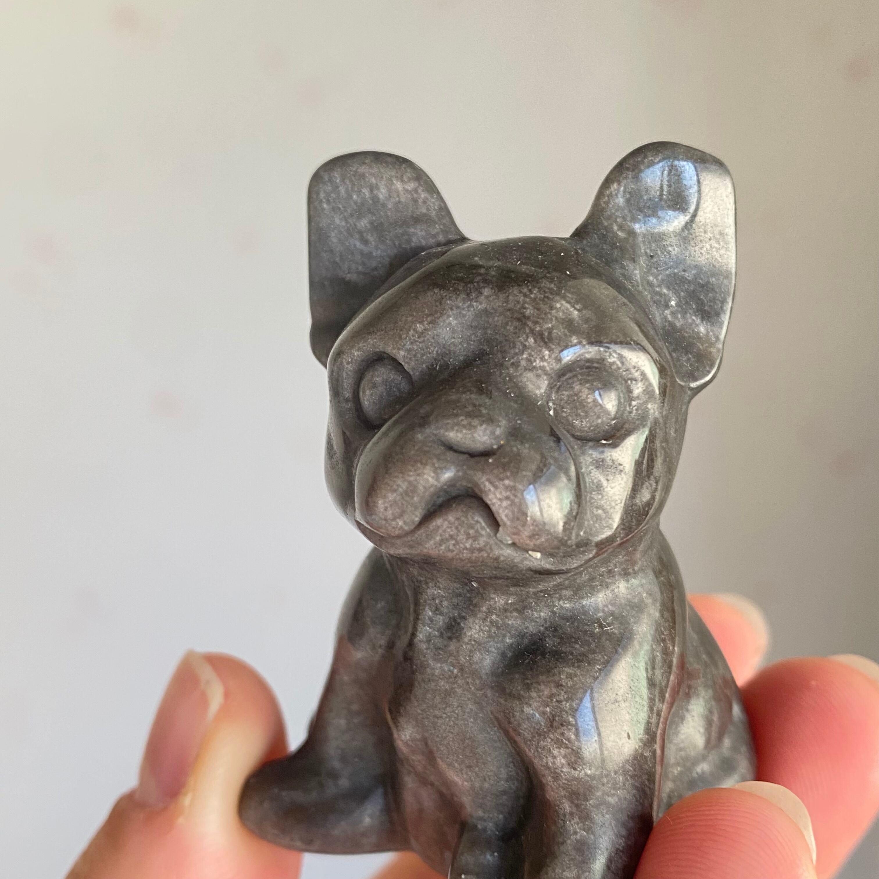 オブシディアンの神秘的な輝きを宿したフレンチブルドッグの置物。漆黒の中にシルバーまたはゴールドの光が浮かび上がり、見る角度によって異なる表情を楽しめます。忠誠心や愛情を象徴するフレンチブルドッグの姿が、空間に安心感と守護のエネルギーをもたらします。