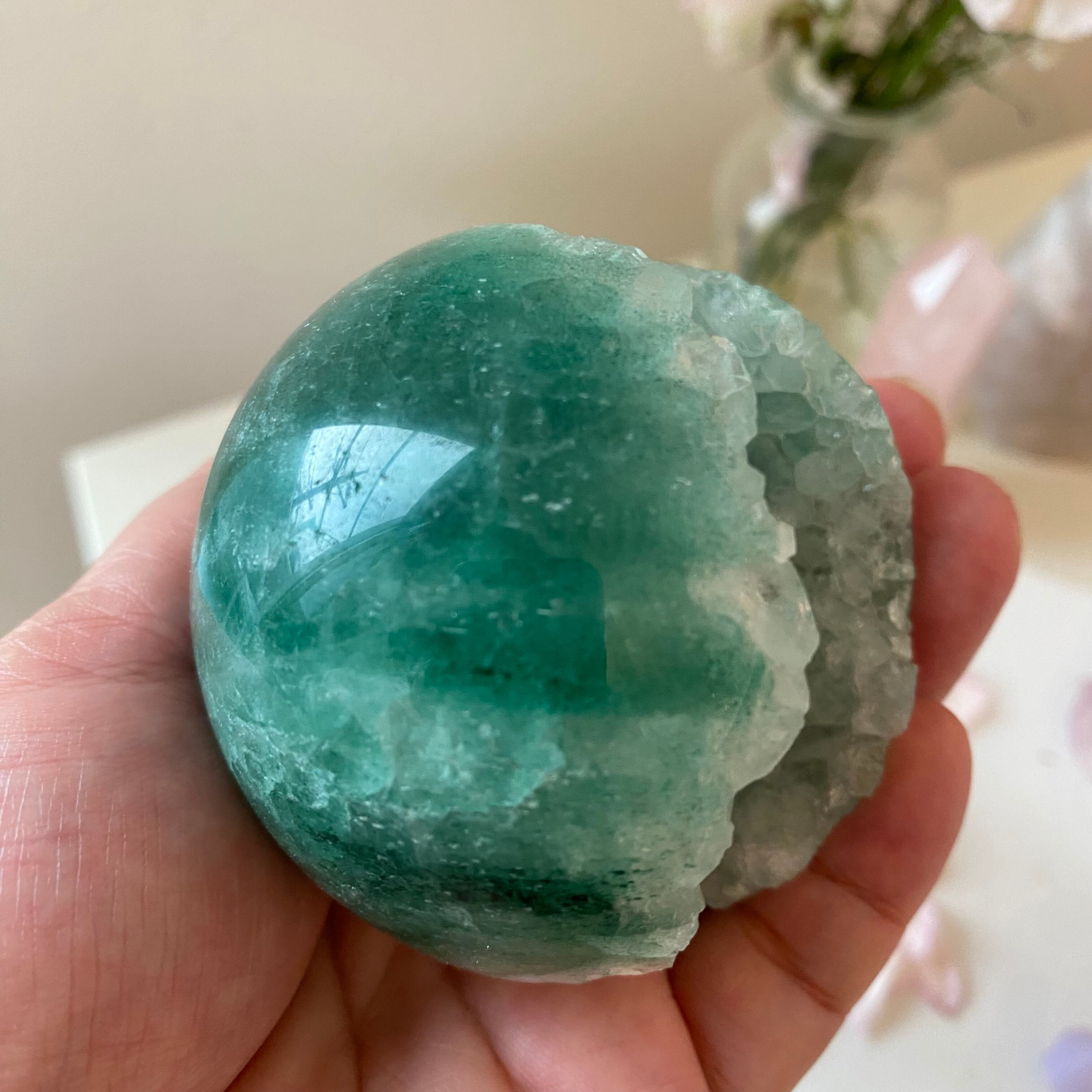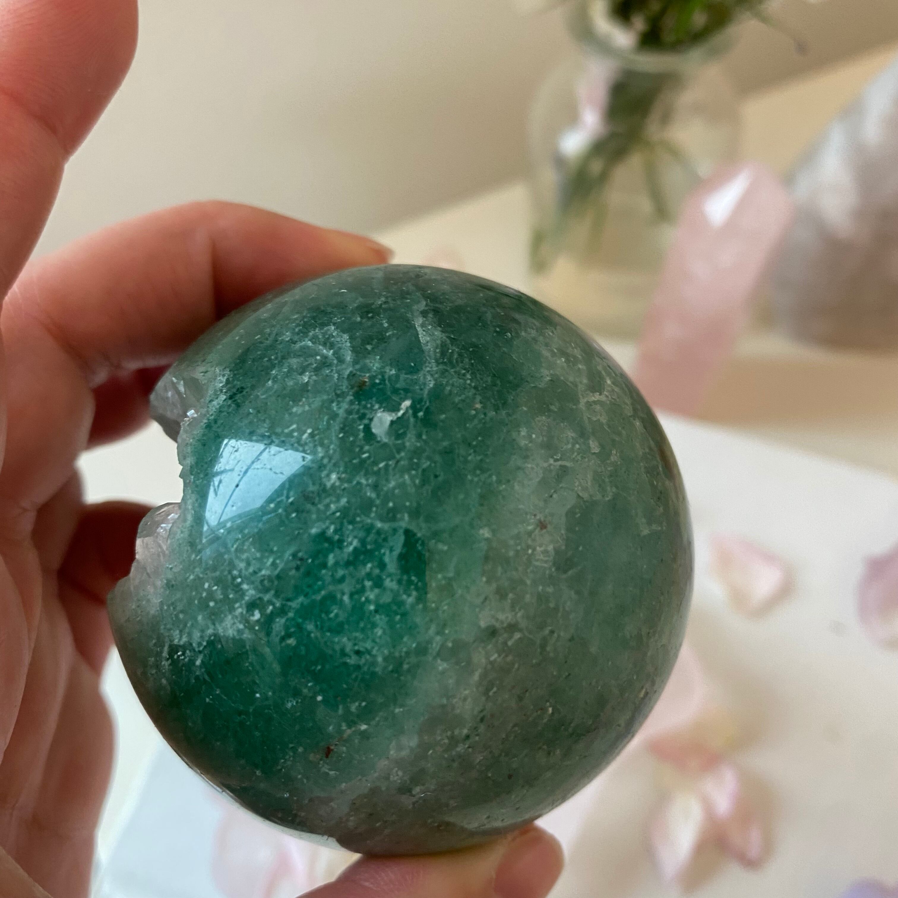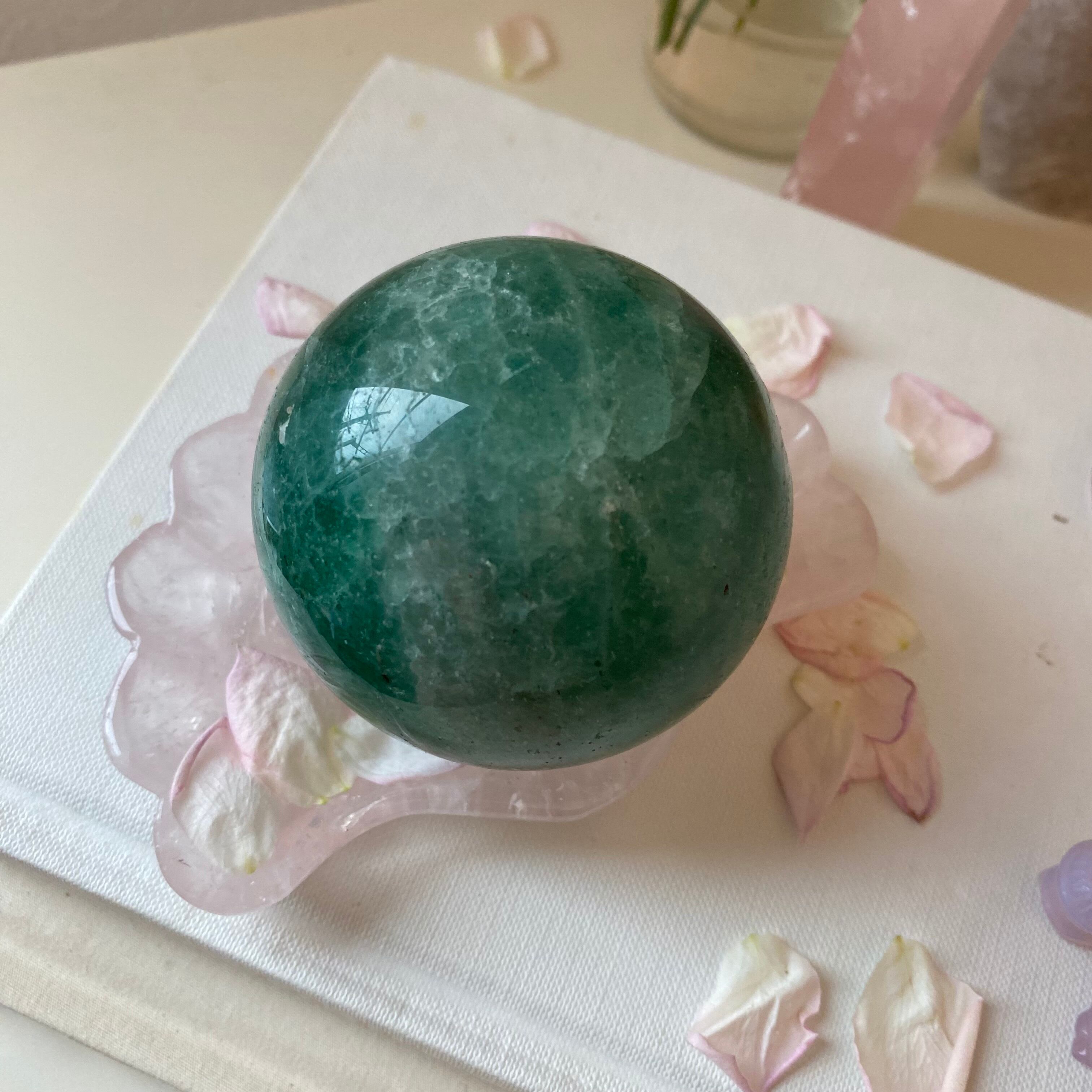 美しいグリーンの輝きを持つ、グリーンストロベリークォーツのスフィアです。