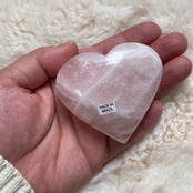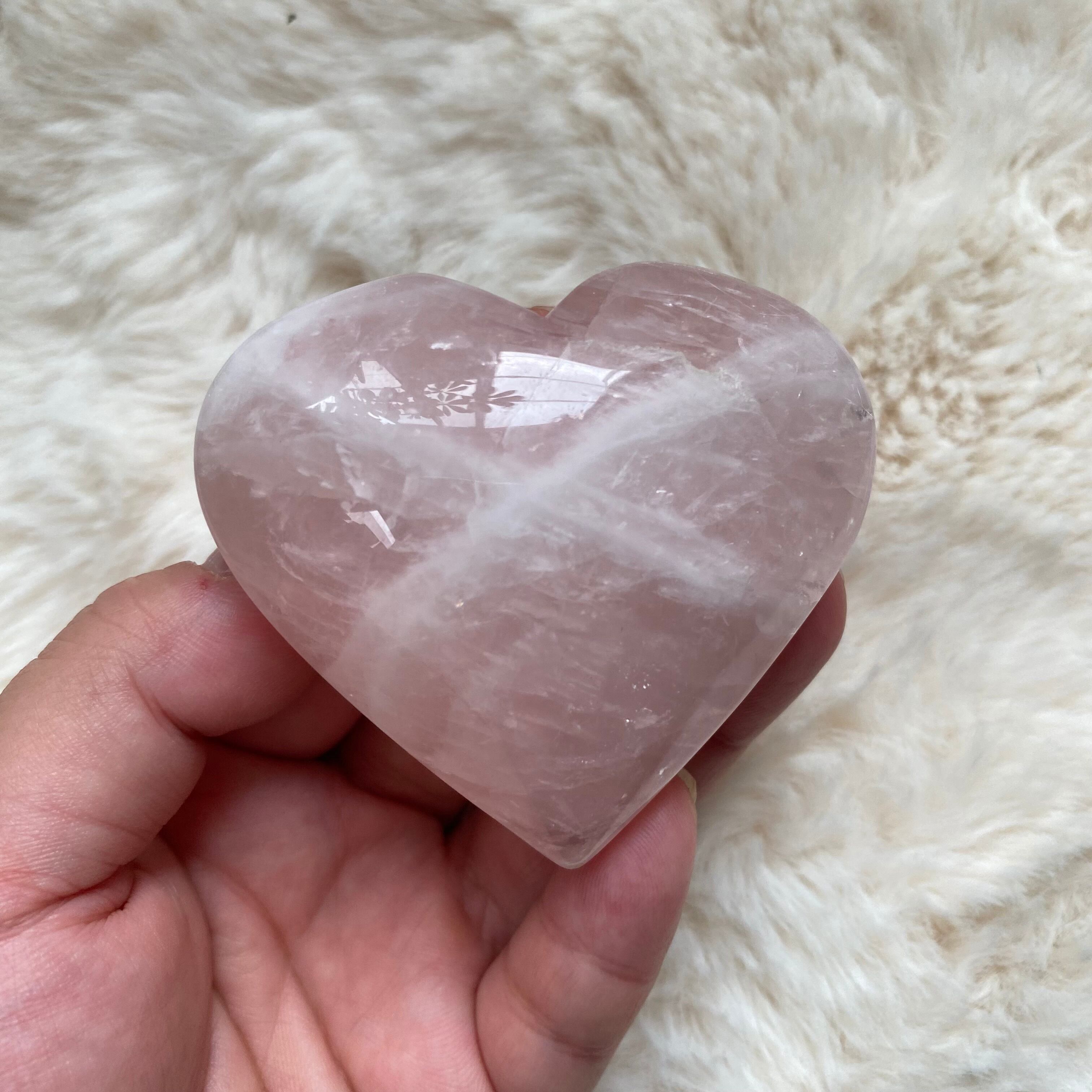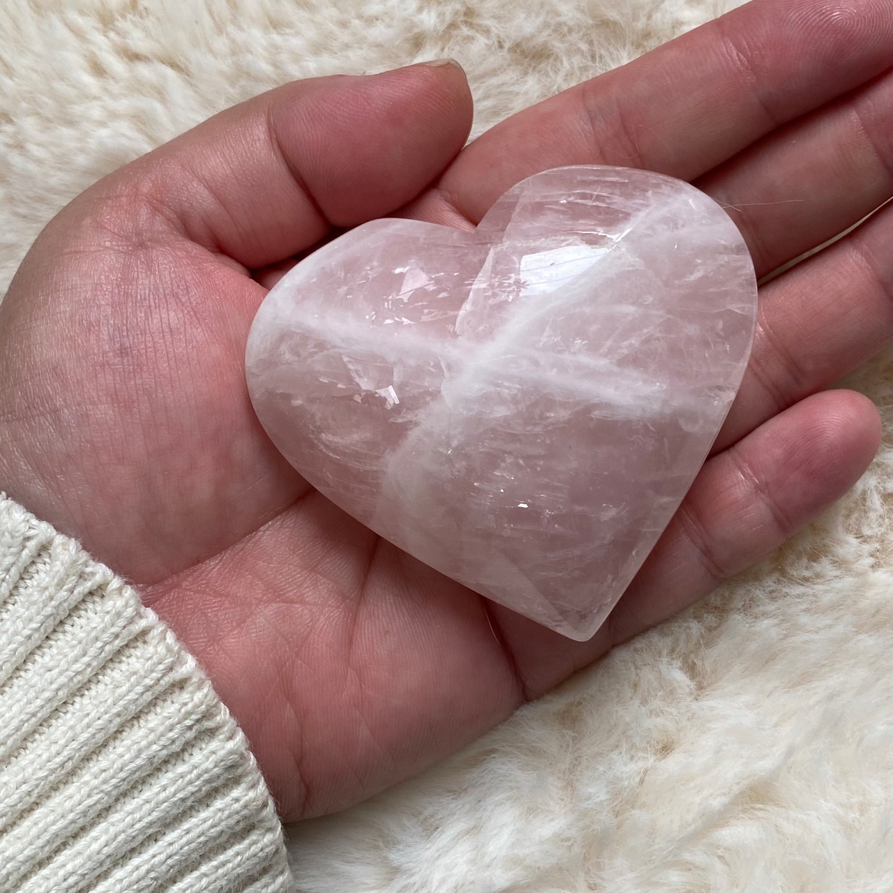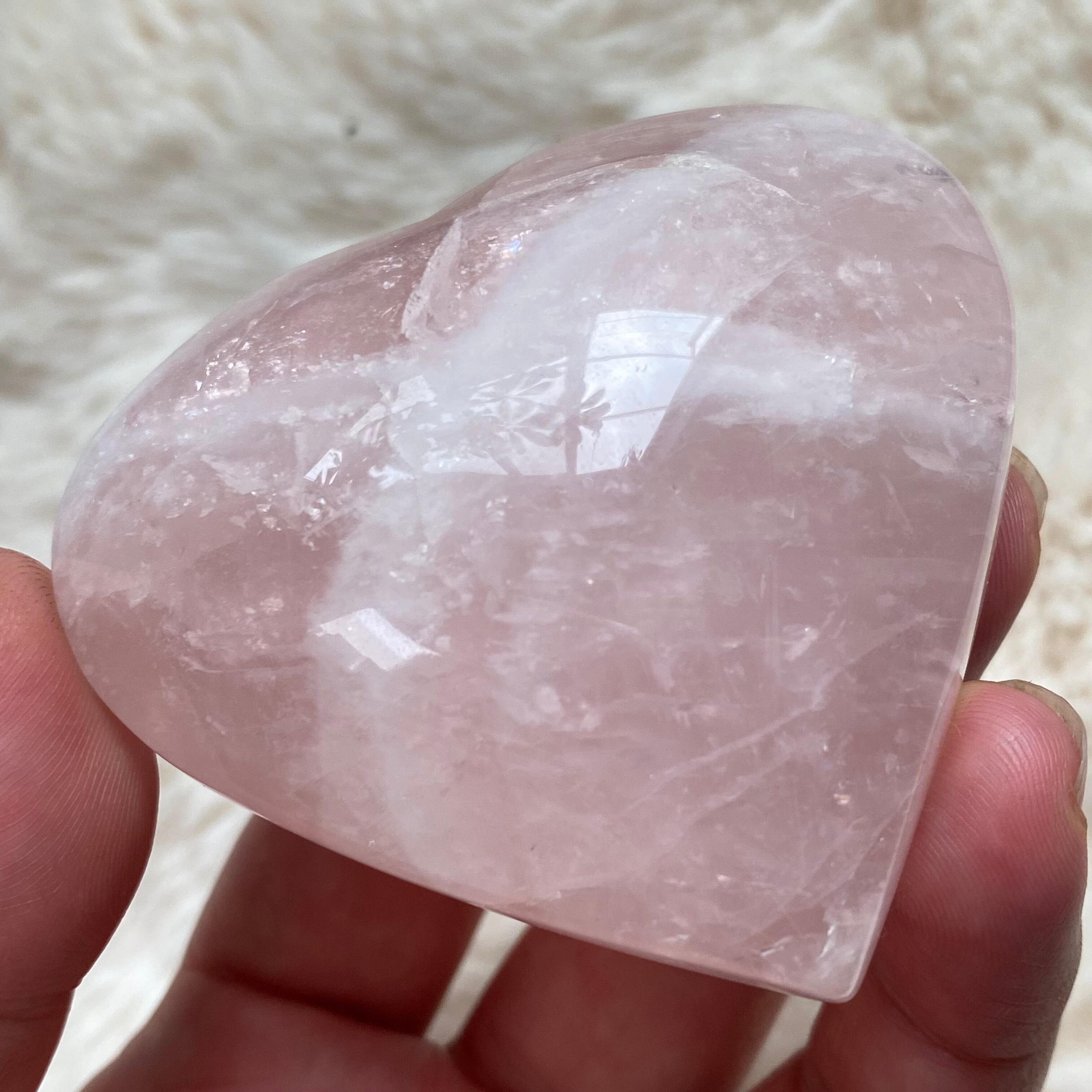 手のひらにすっぽりとおさまる、しっかりとした存在感のローズクォーツハート。