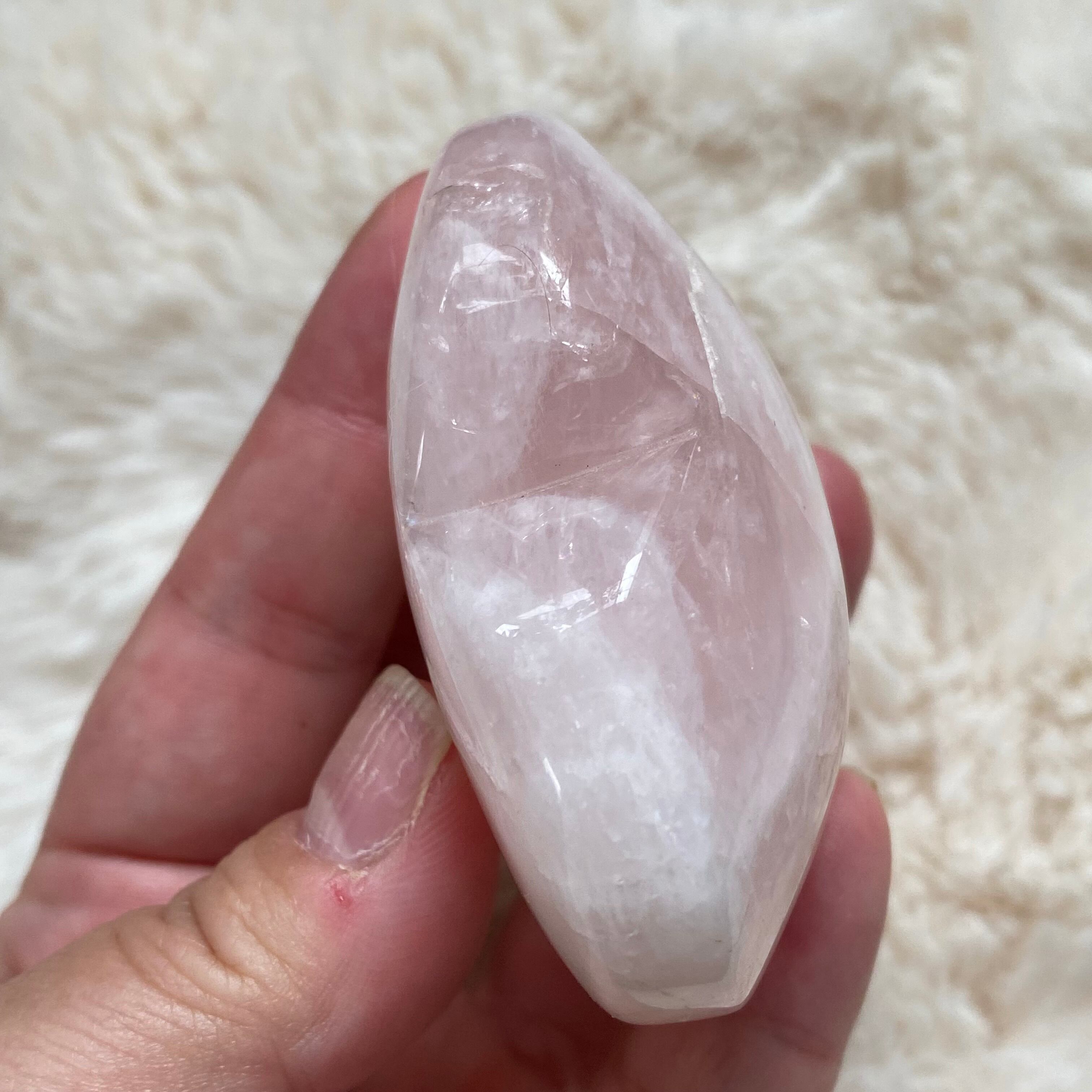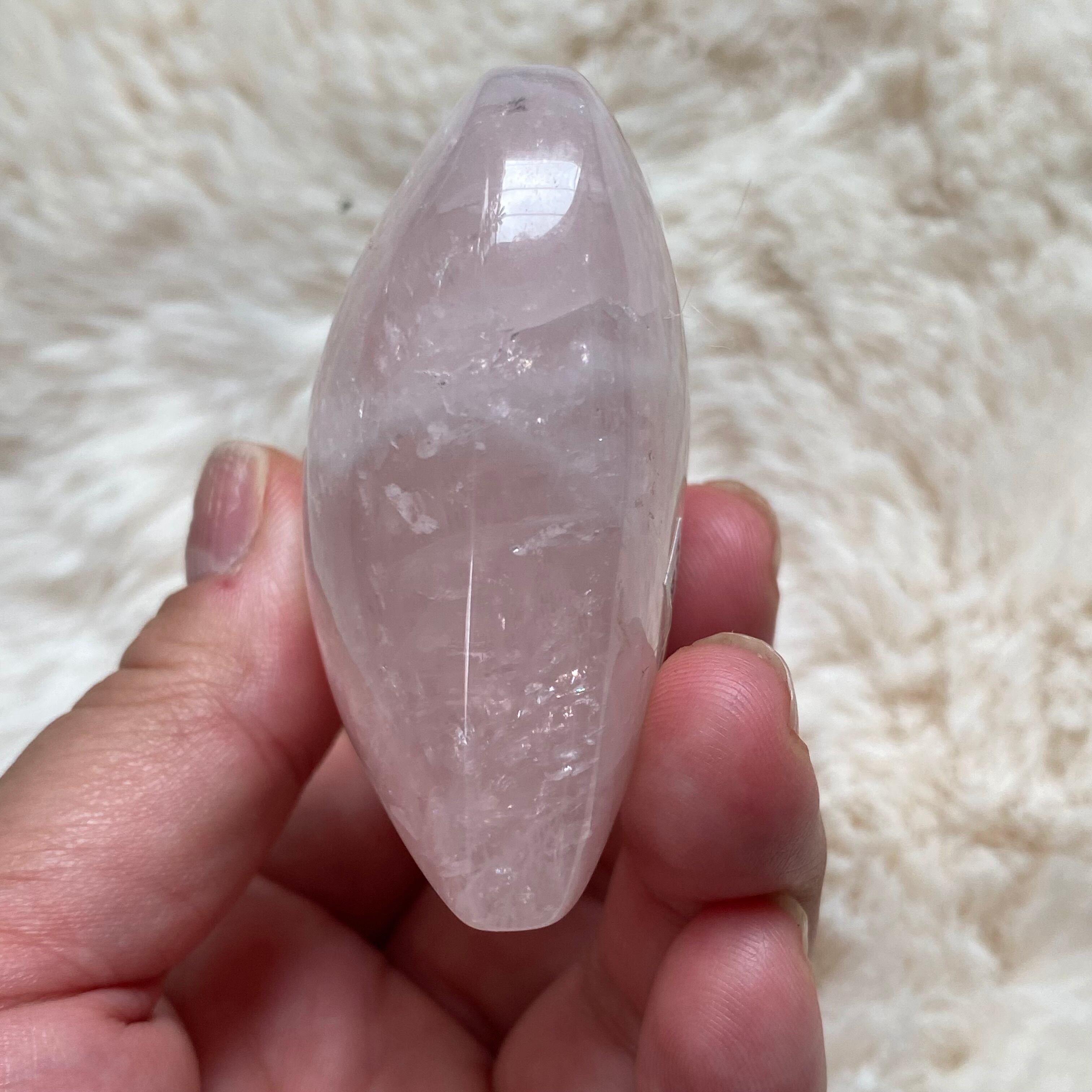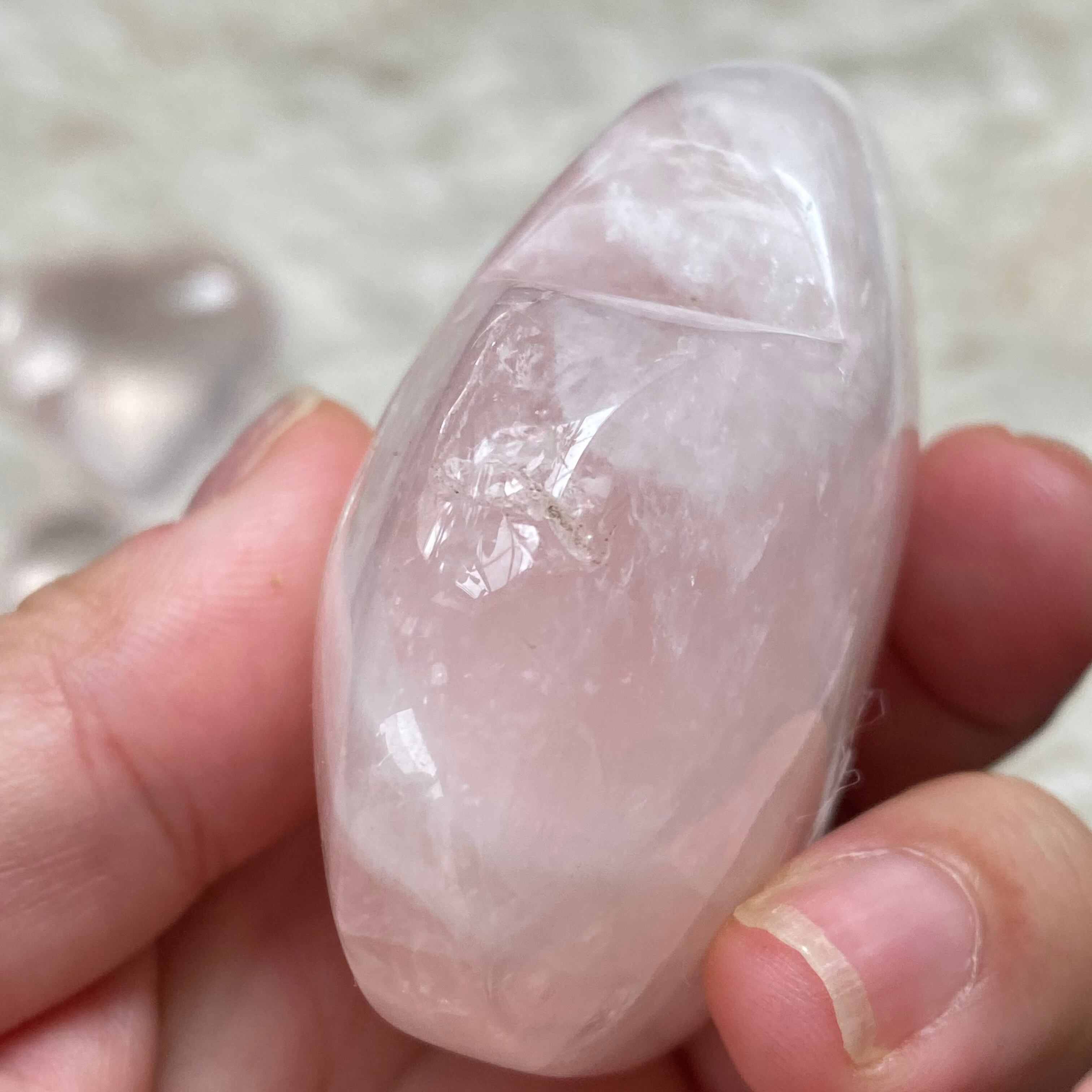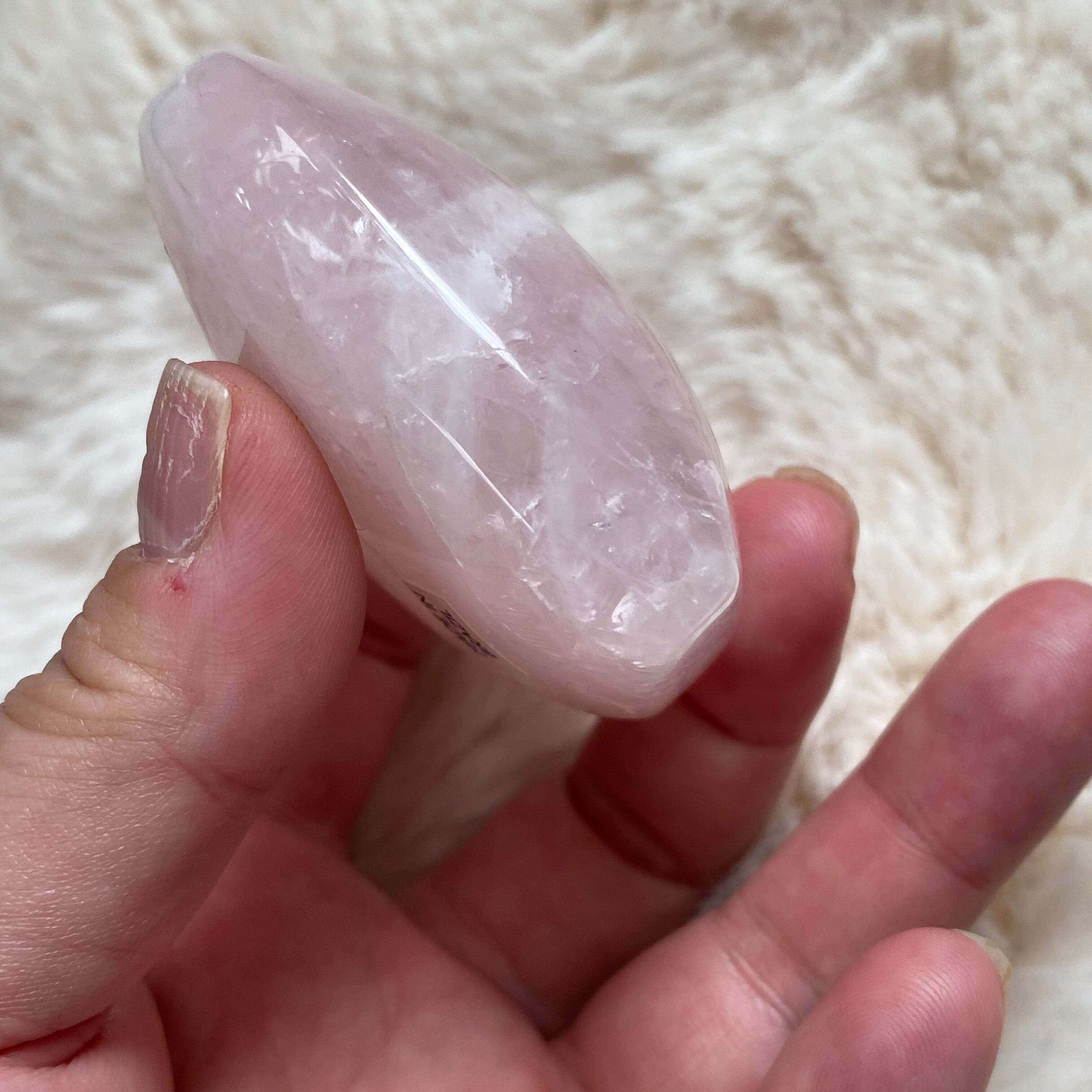 手のひらにすっぽりとおさまる、しっかりとした存在感のローズクォーツハート。