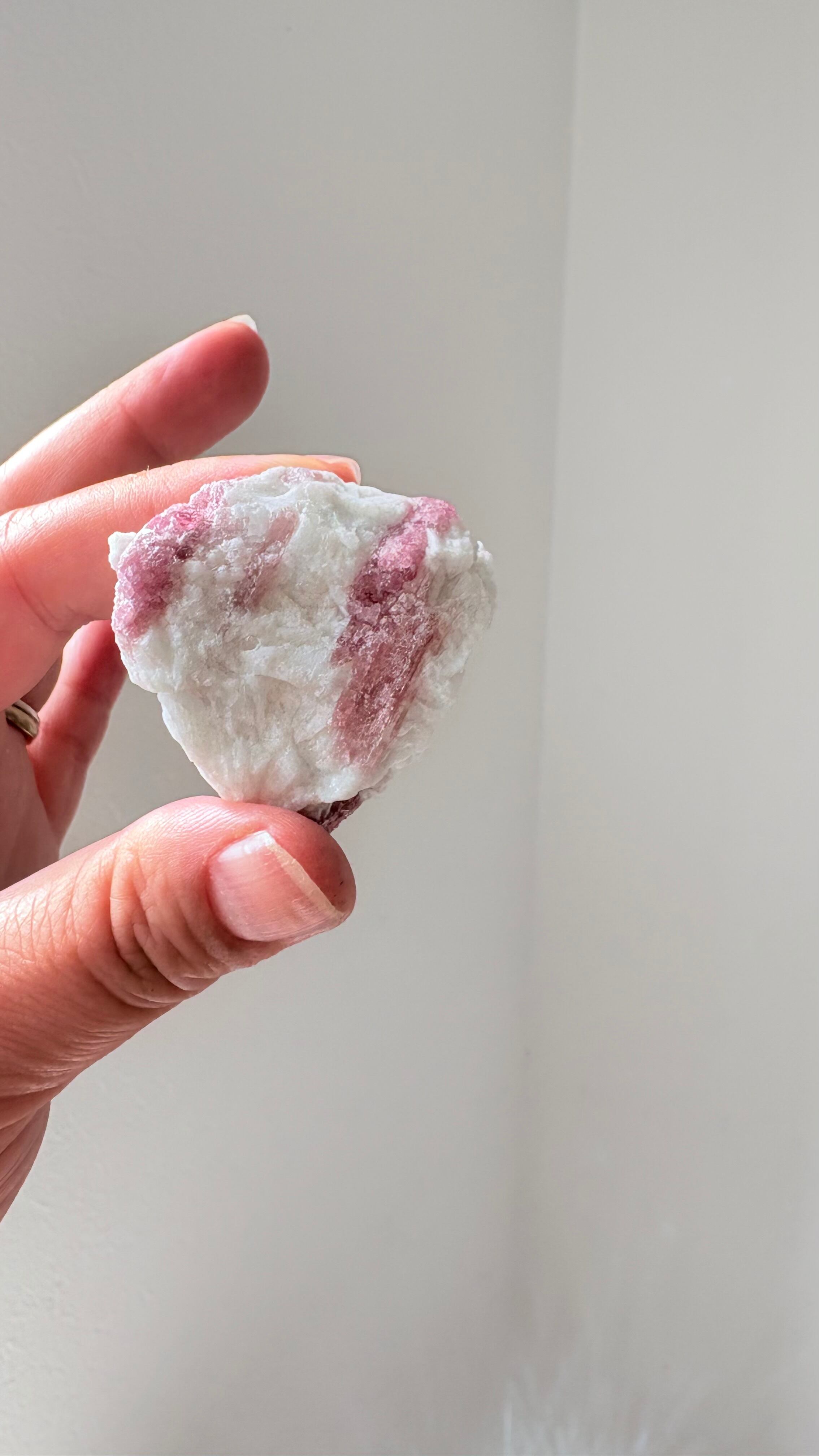 白い母岩に寄り添うように育ったピンクトルマリンは、まるで“純粋な想い”がそのまま結晶化したかのよう。