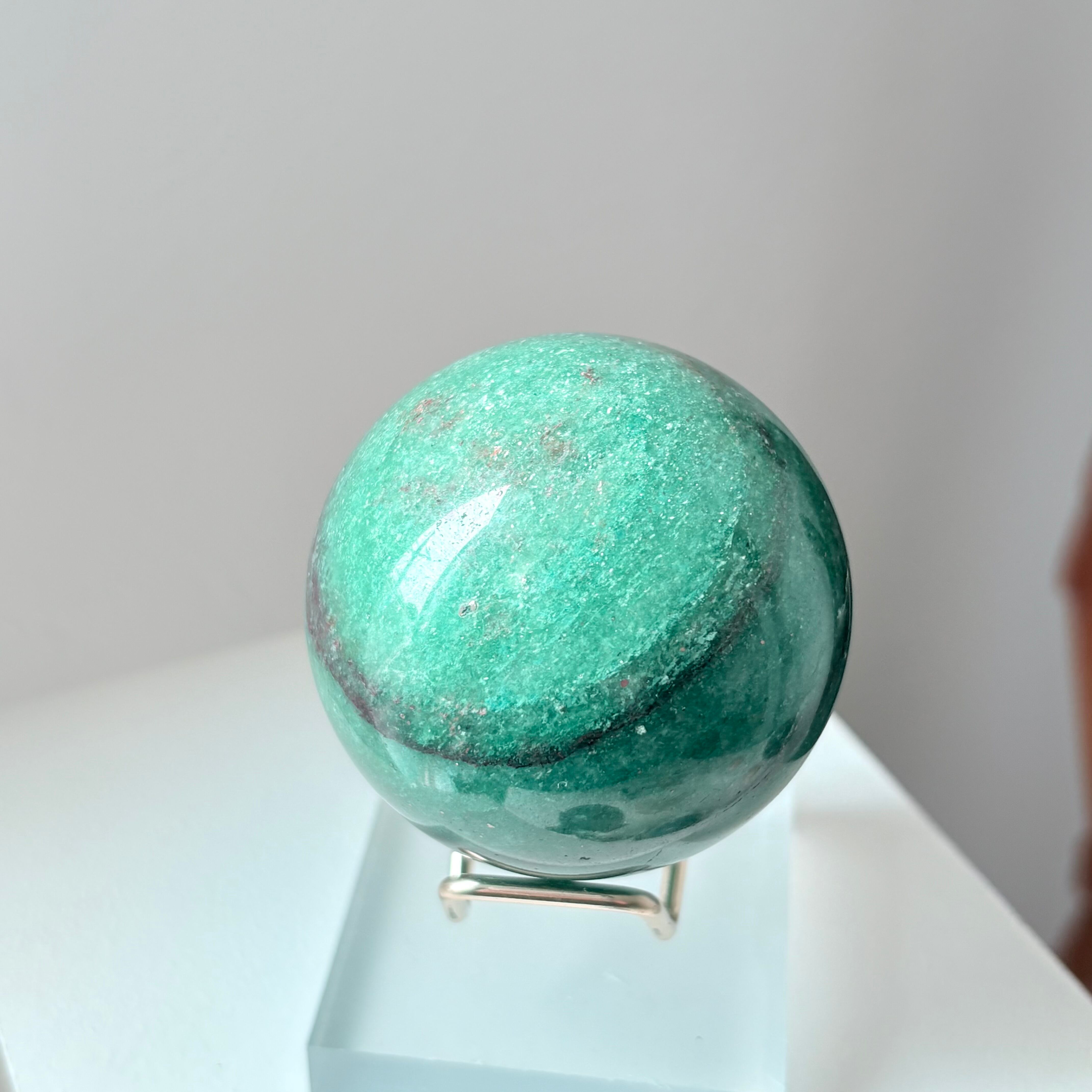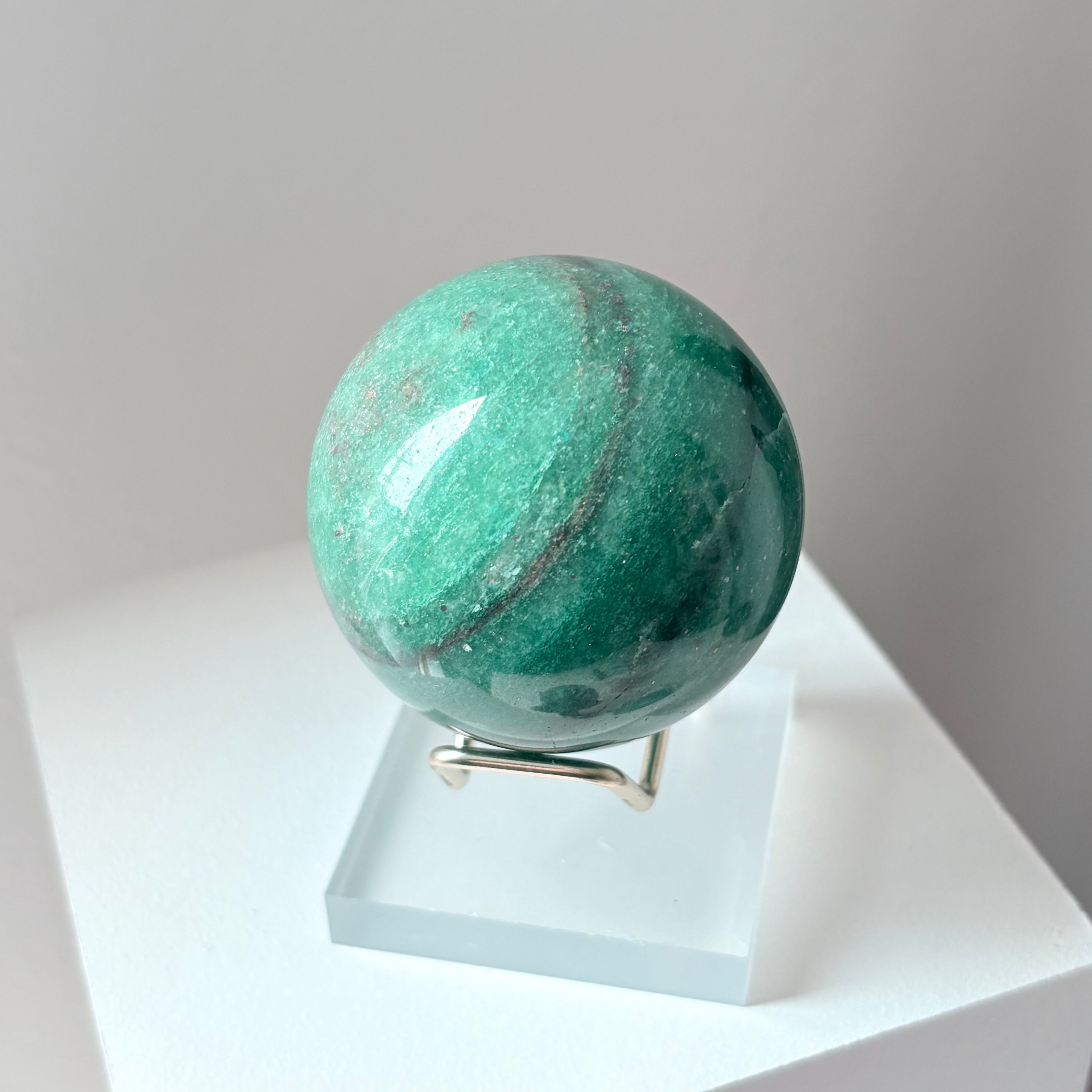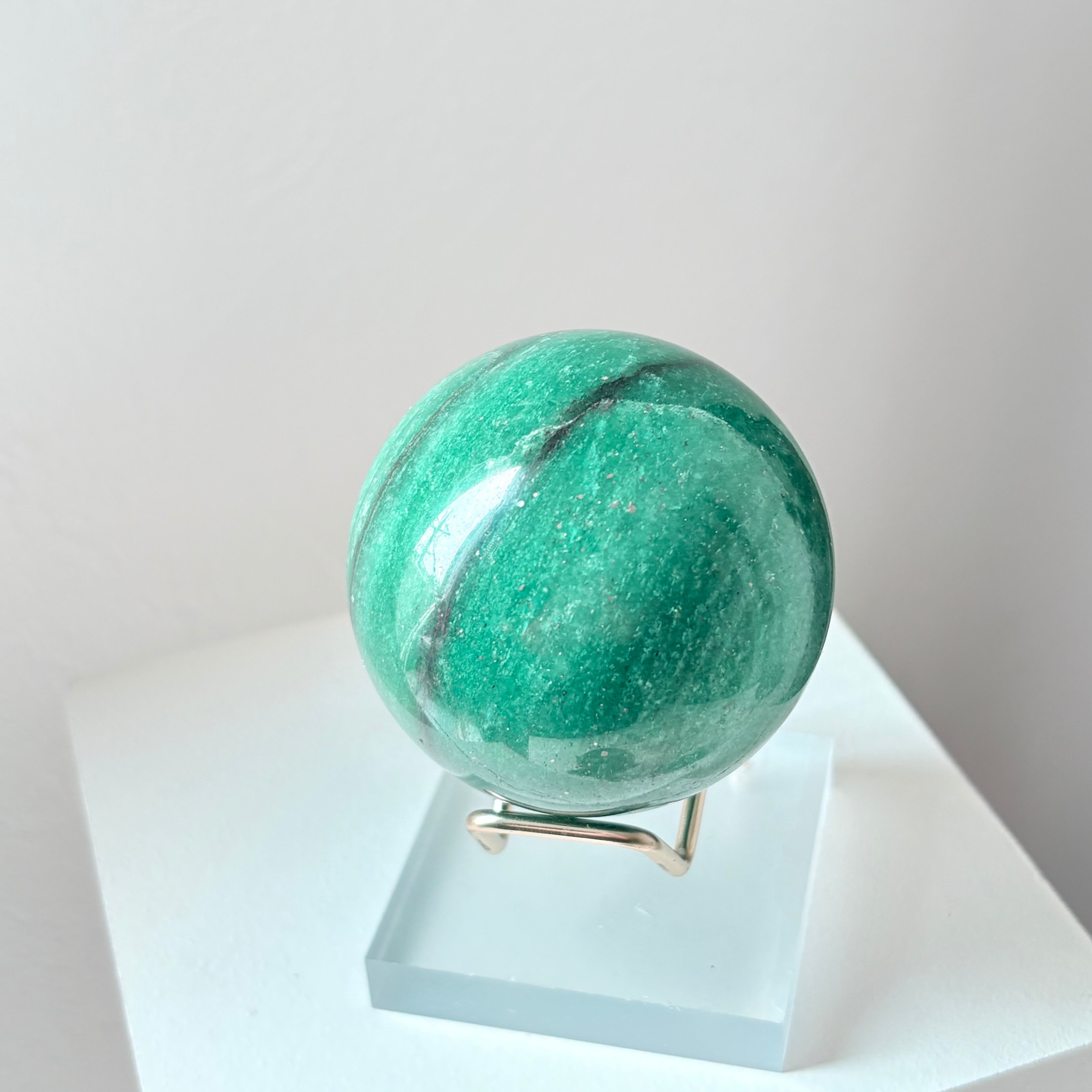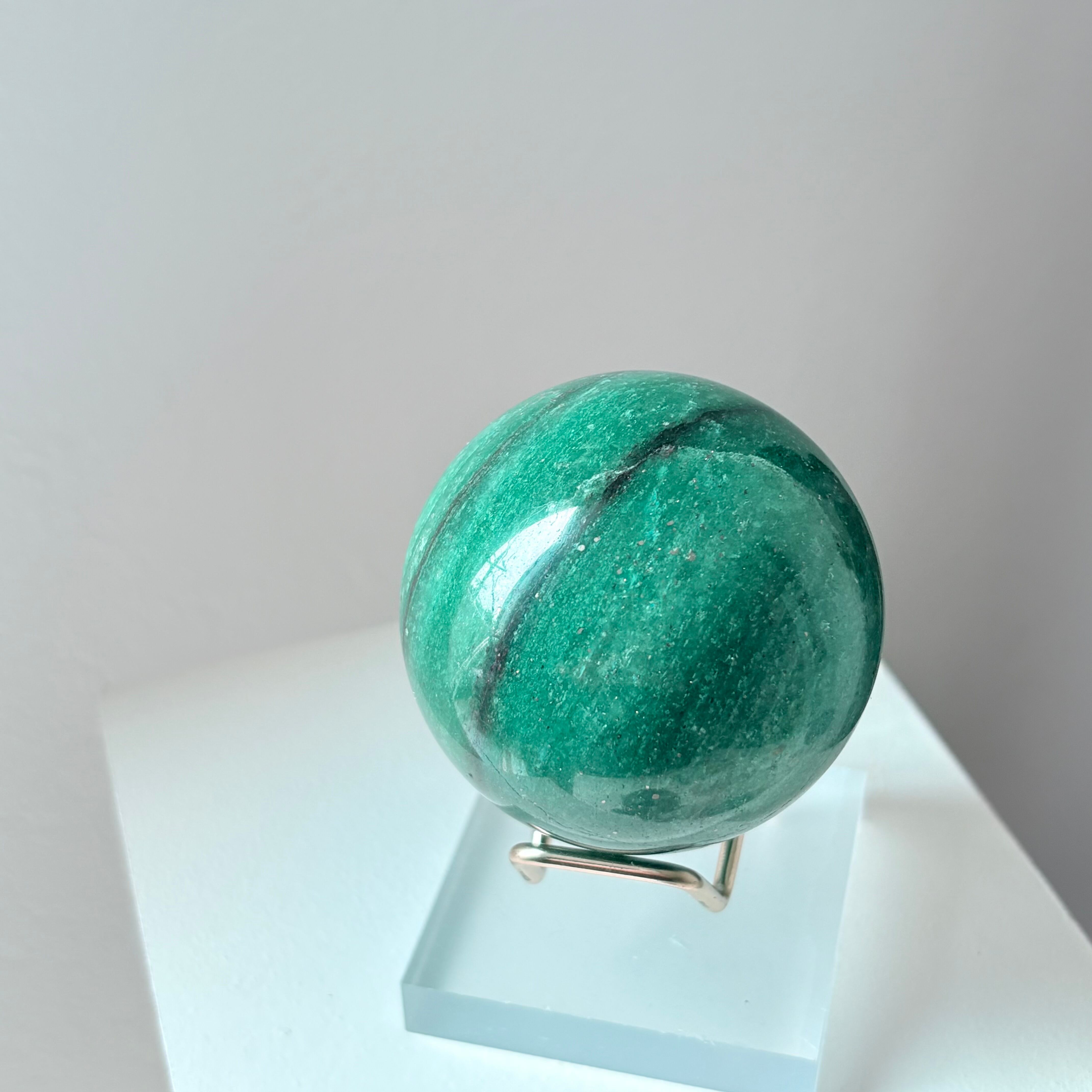 グリーンアベンチュリンの優しい癒しの波動と、パイライトの芯のあるエネルギーが共鳴する、稀少な共生スフィアです。