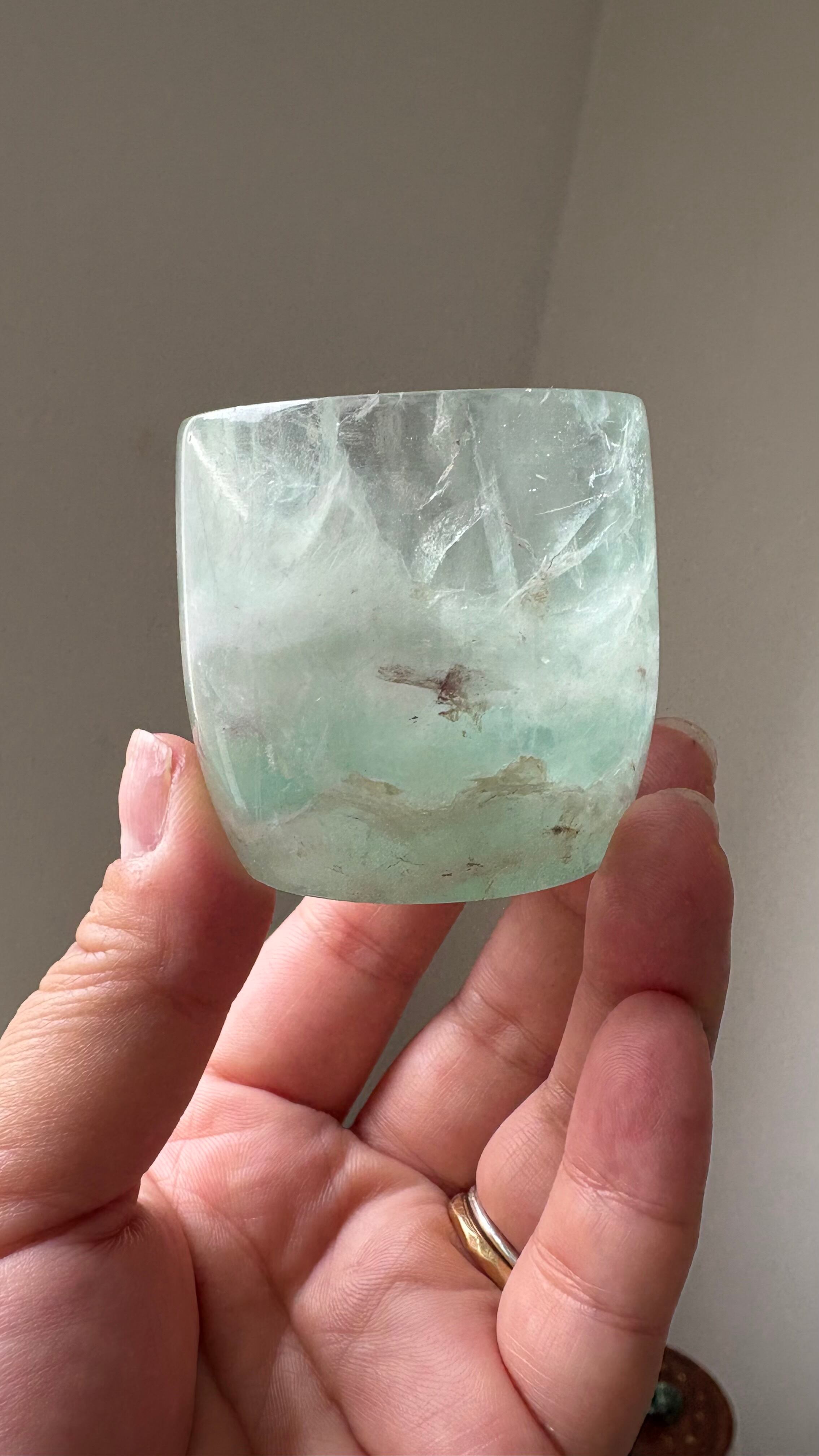 柔らかく透き通るようなグリーンやバイカラーのフローライトを、丁寧に削り出して仕上げた、ぐい呑みサイズのカップです。
