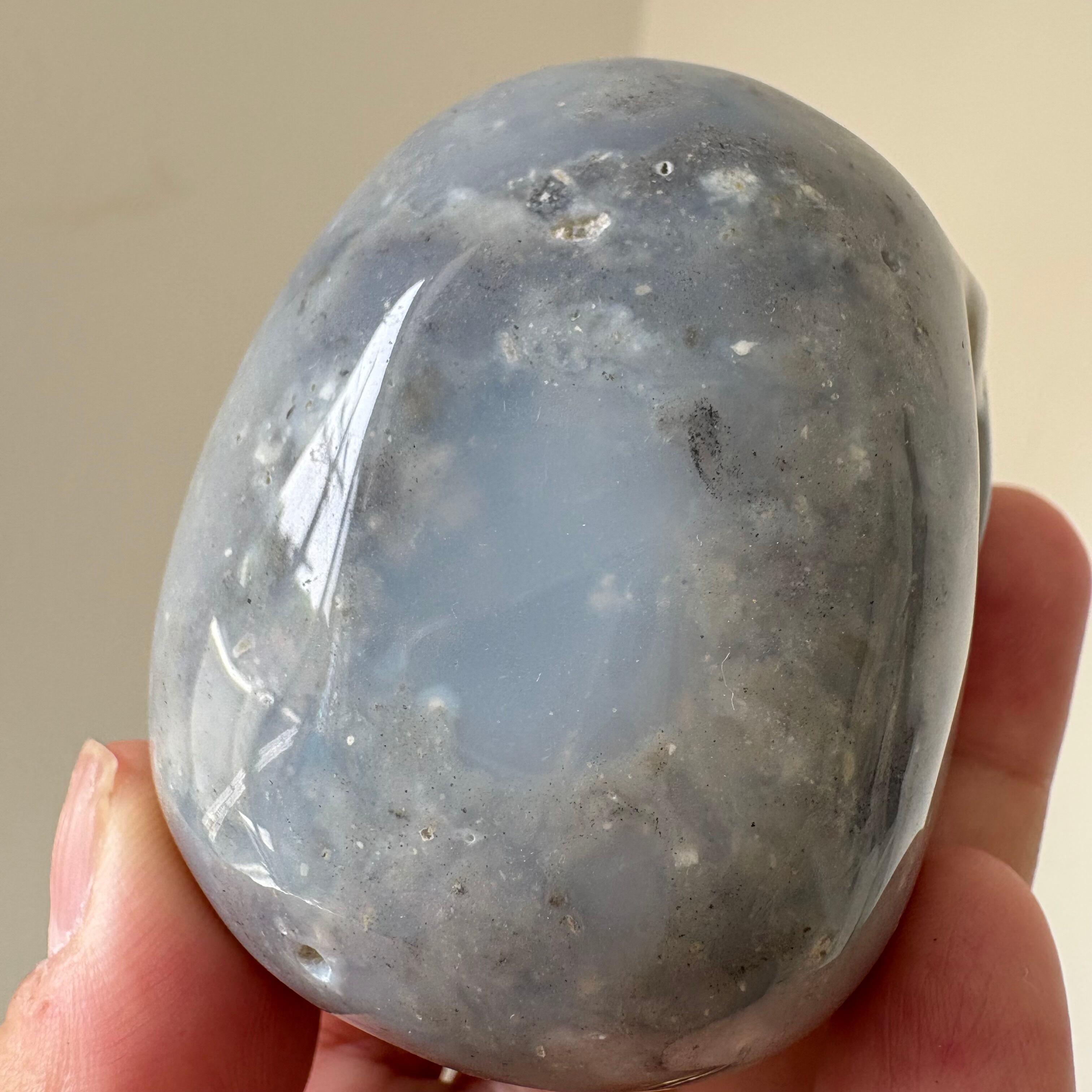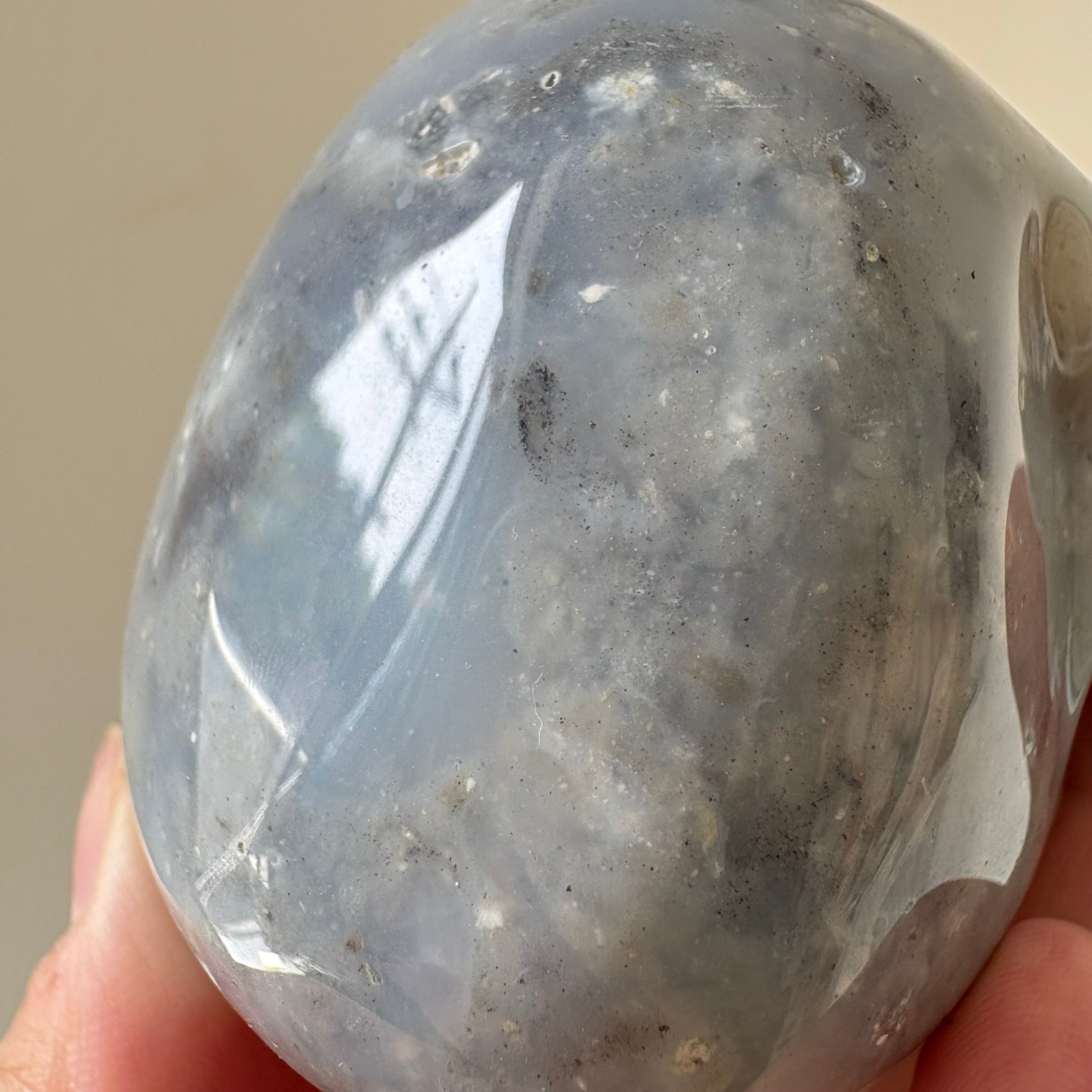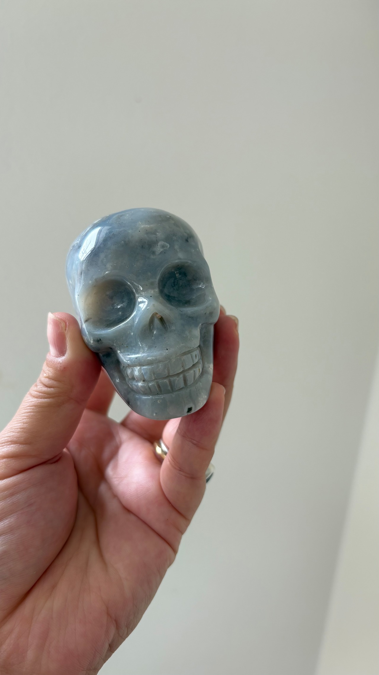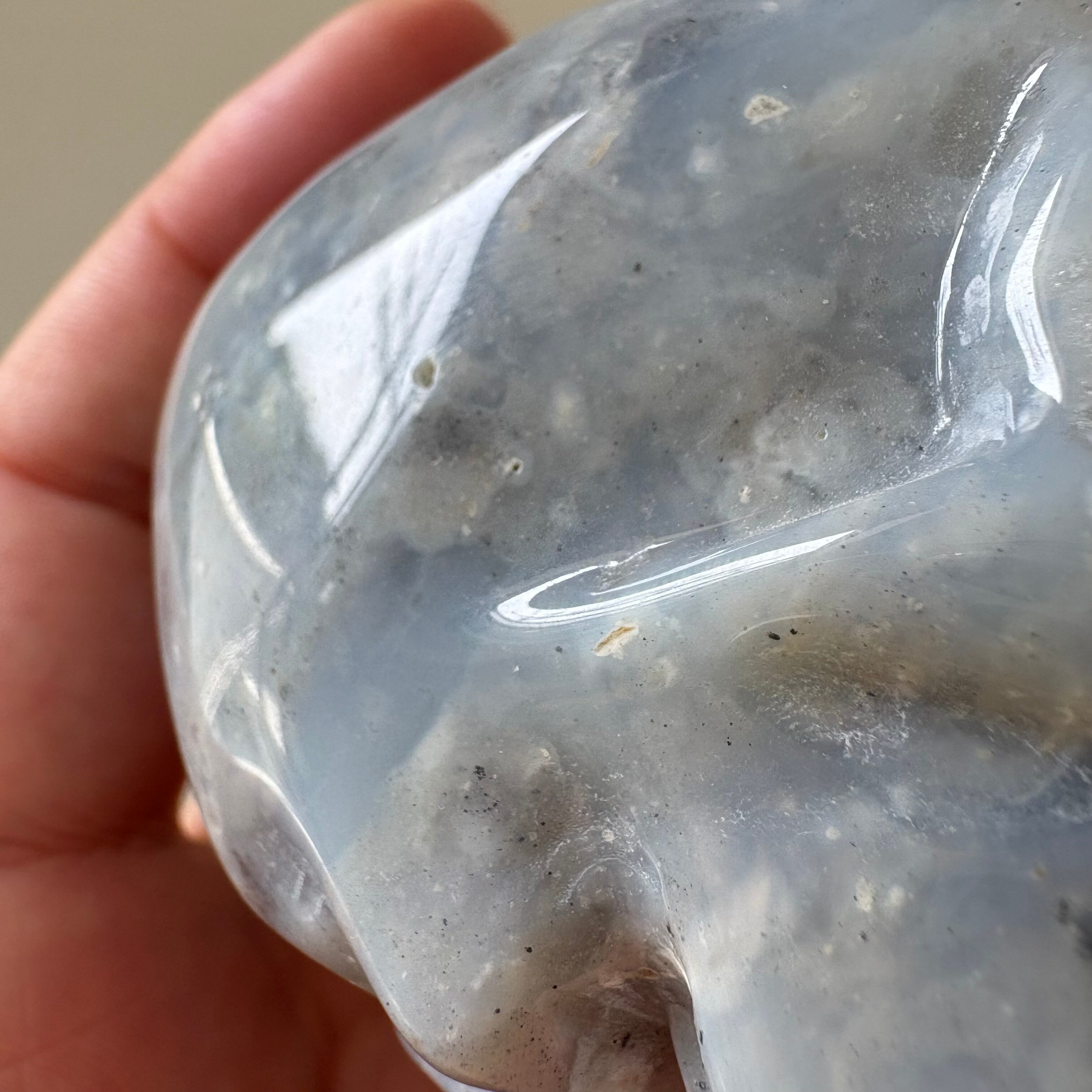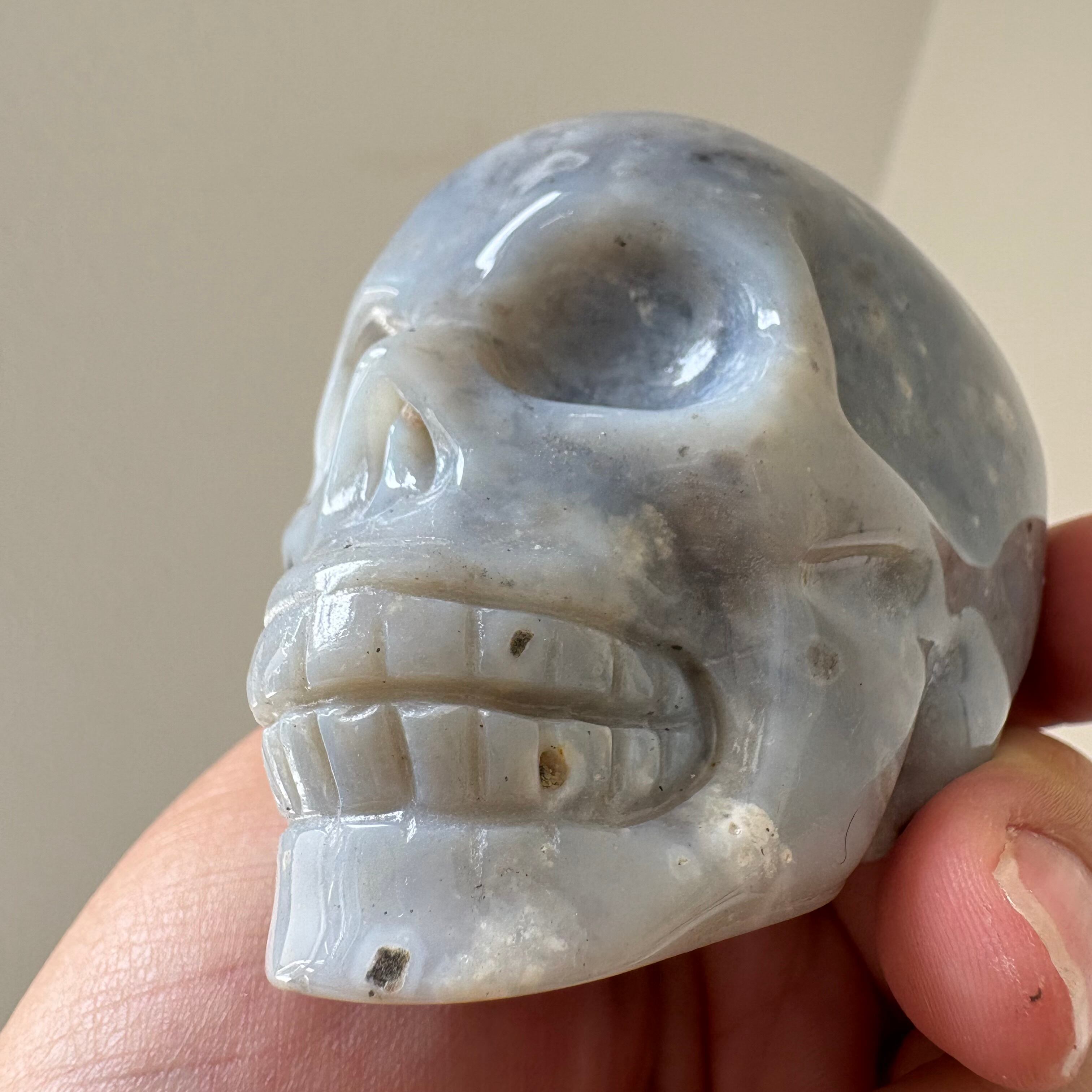 静かなる知性と深淵の叡智を秘めたような、ブルーグレーの表情が美しいアゲート製スカル。