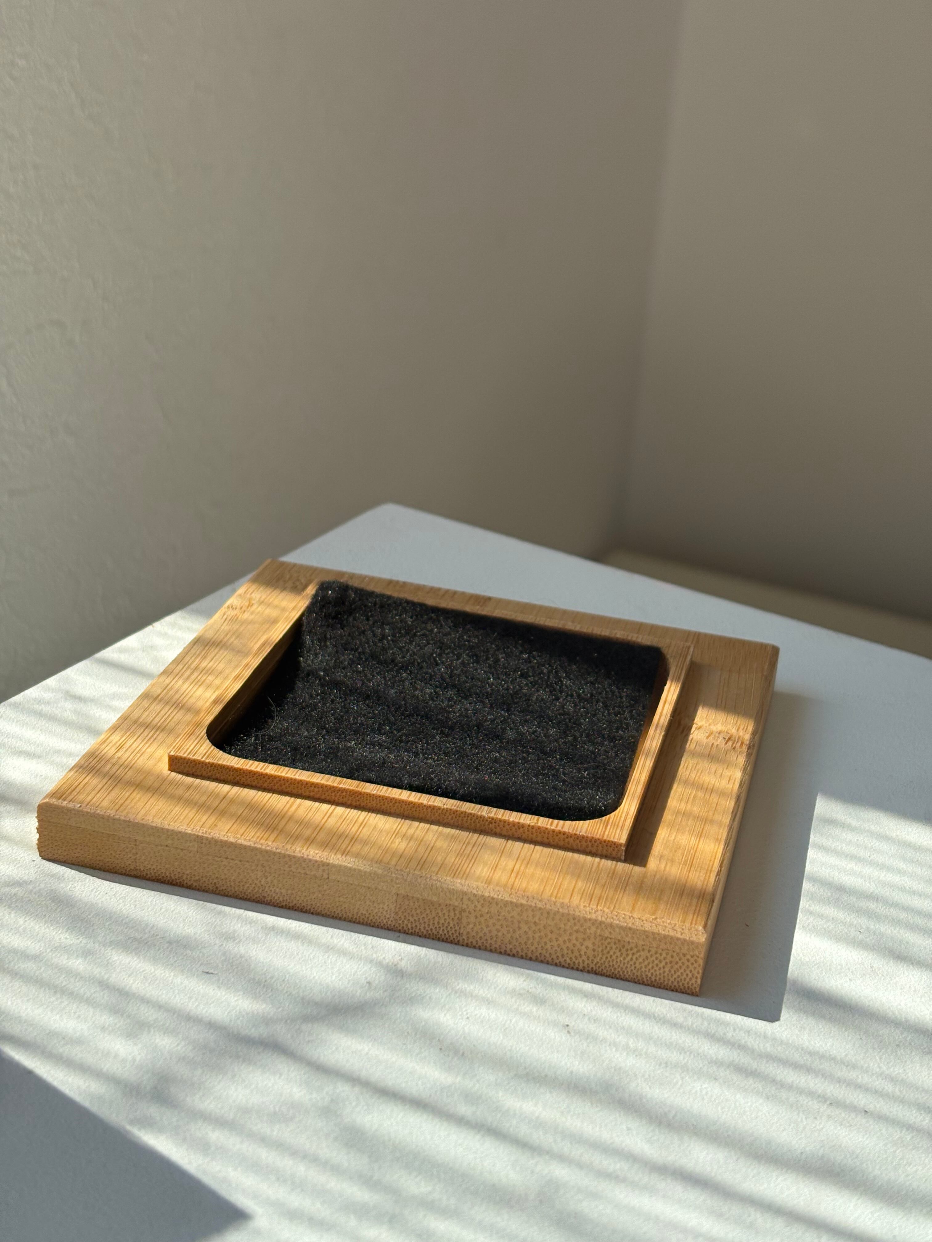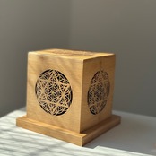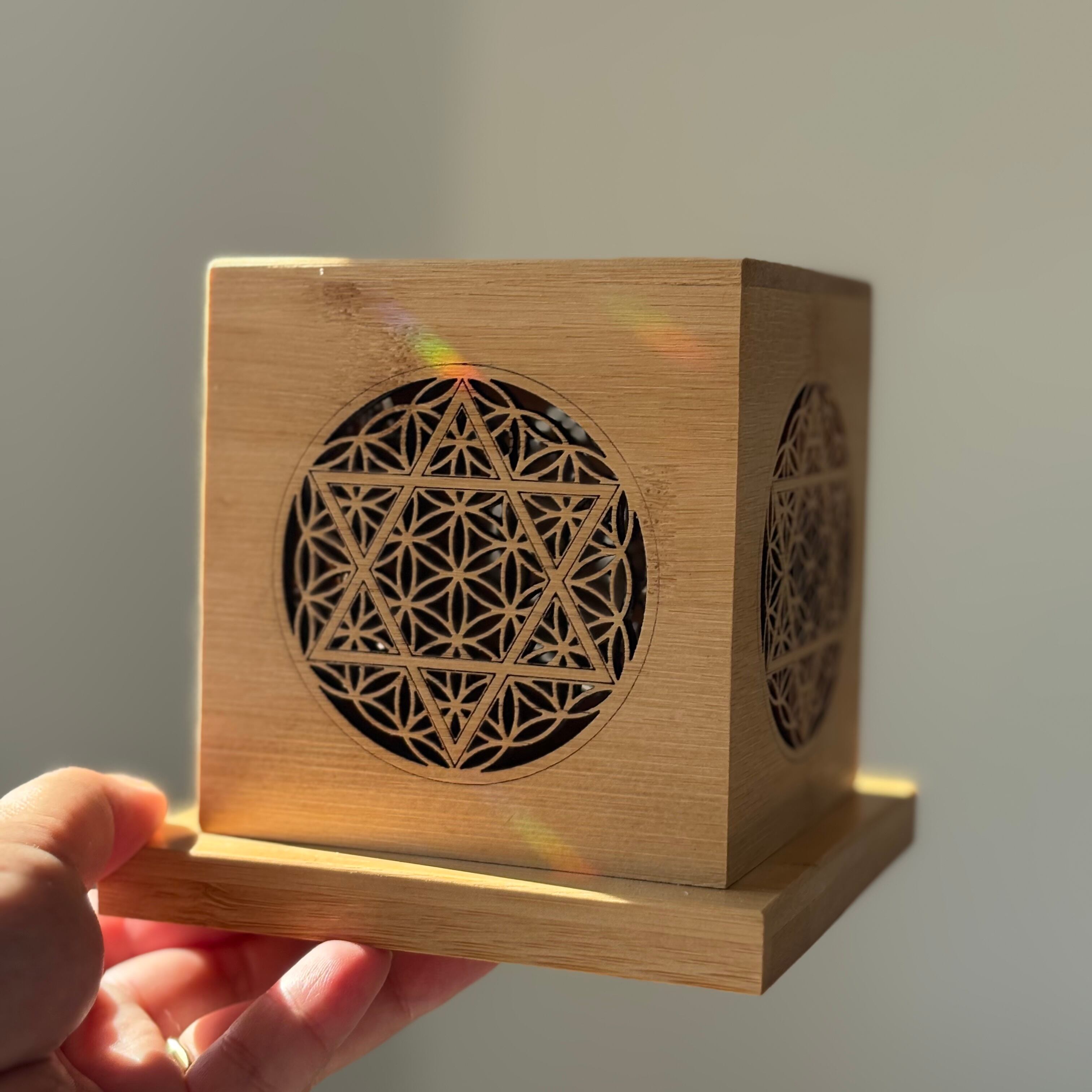 その2つの神聖幾何学を、レーザー加工により竹の面へ精緻に彫り込んだ香炉です。