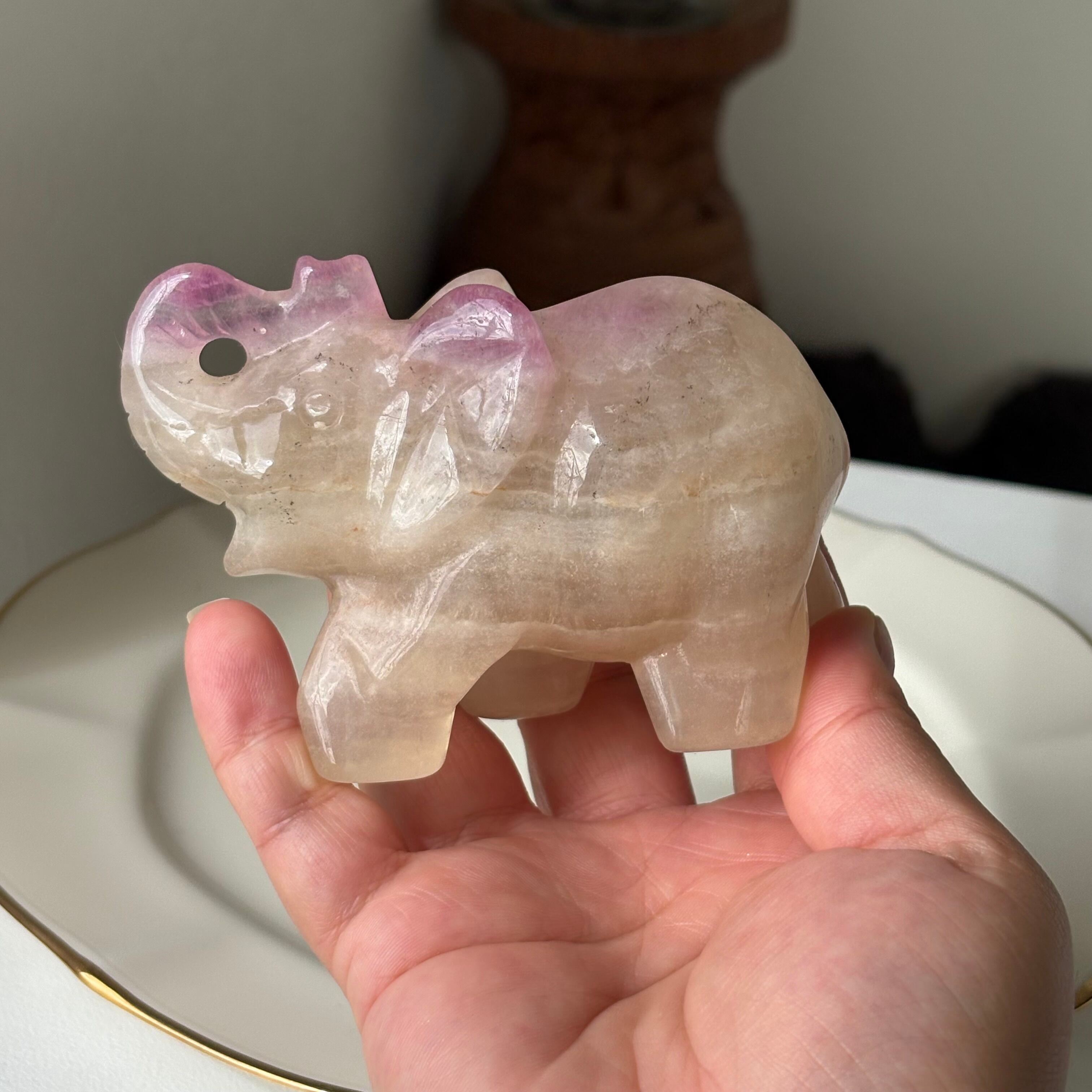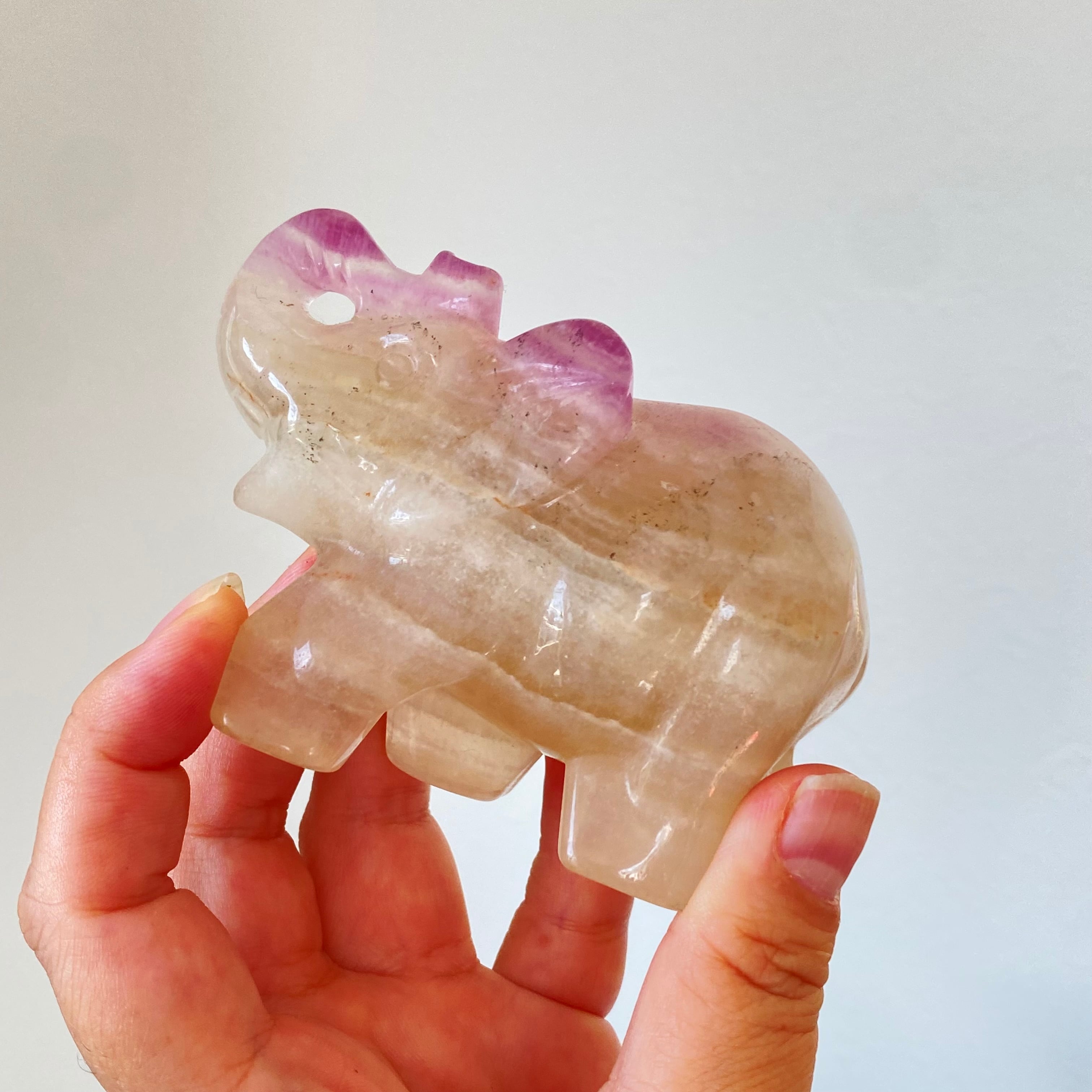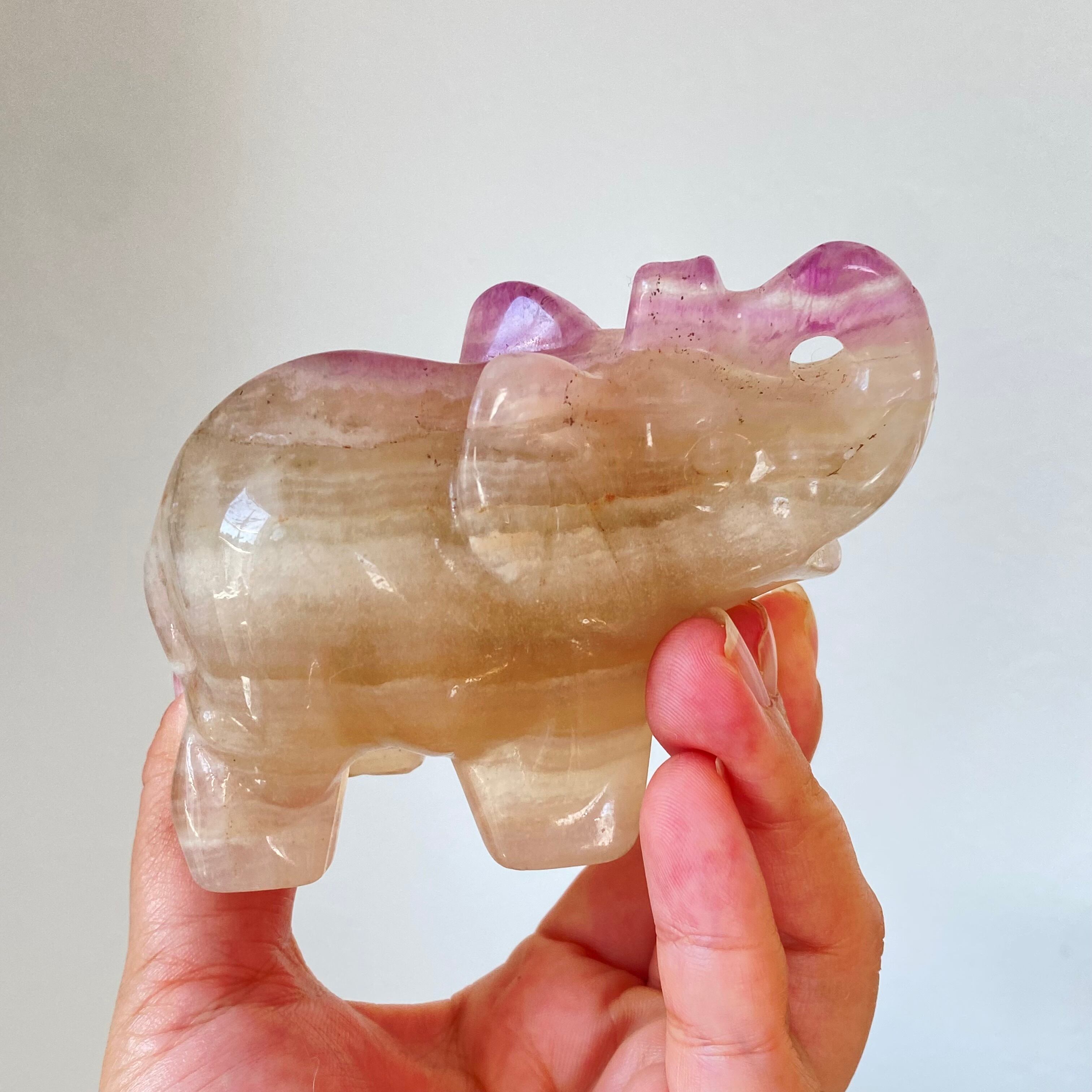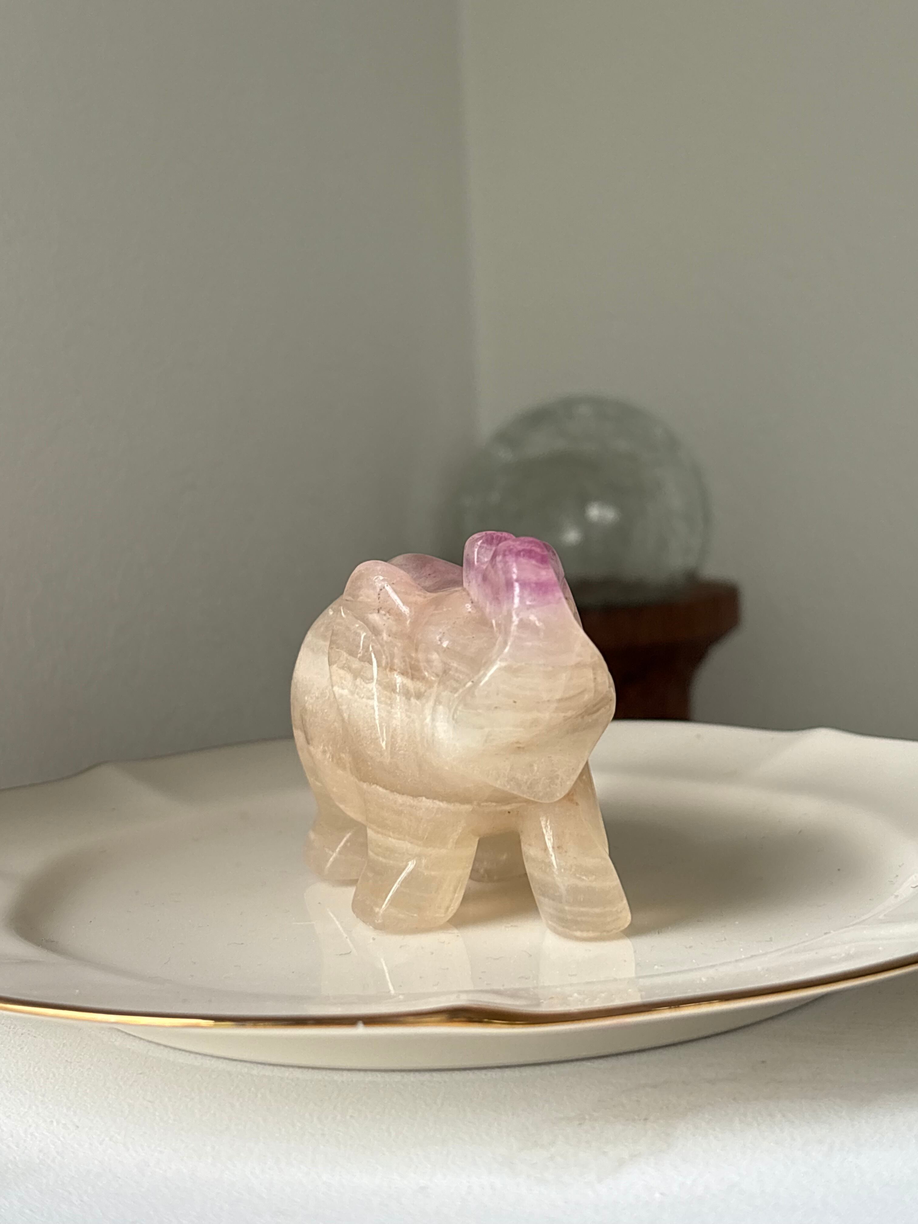 うっすらと透明感のあるベースに、紫〜ピンクのグラデーションが浮かび上がる、幻想的なフローライトのゾウさん。