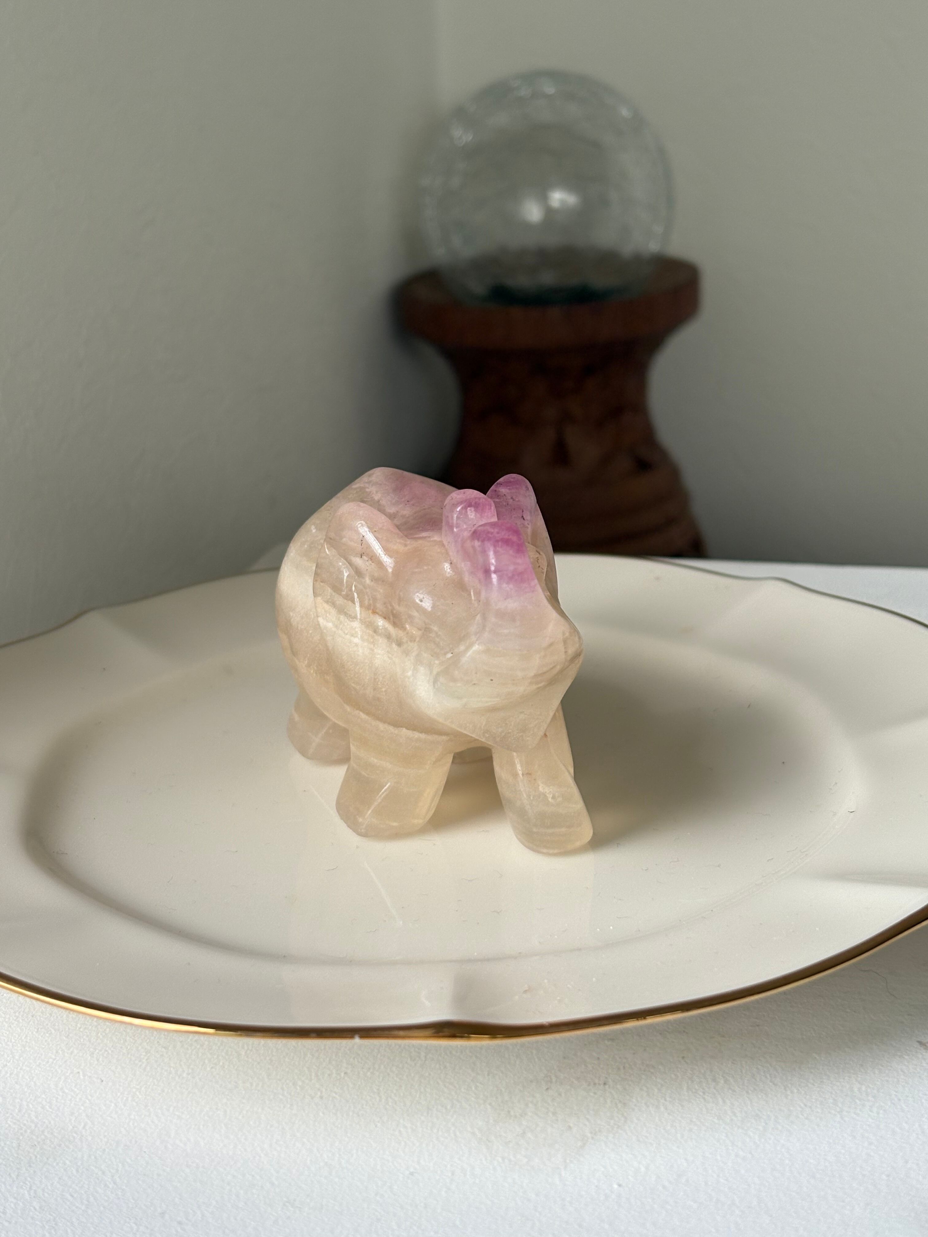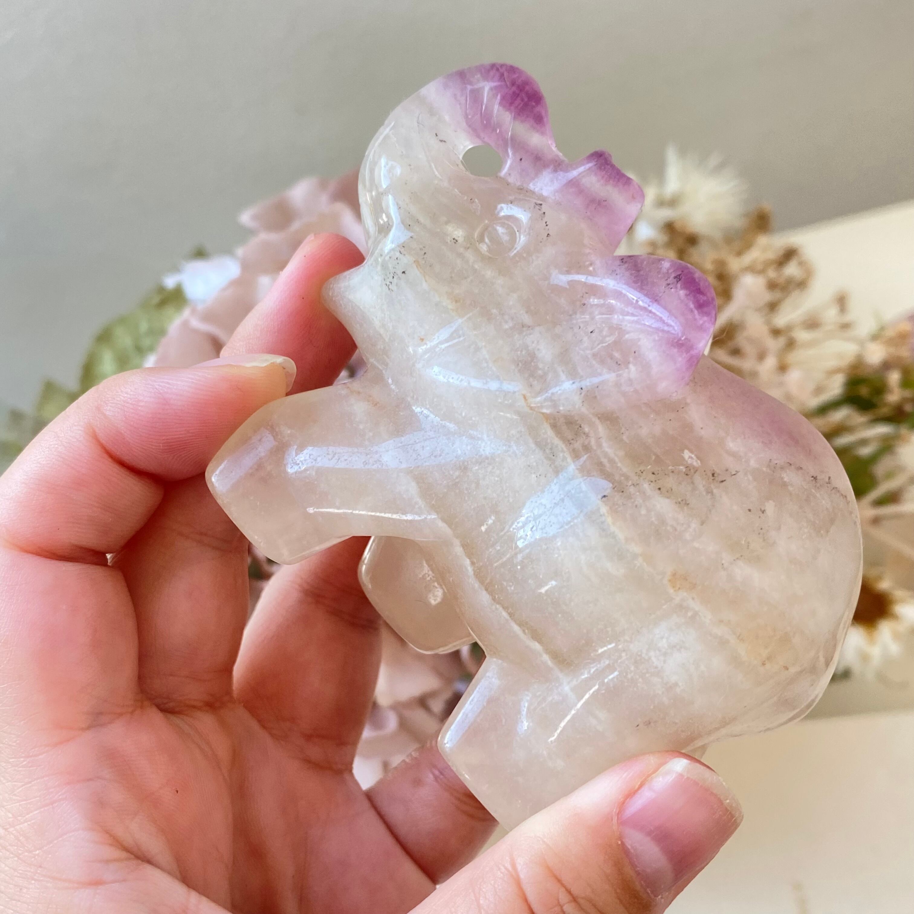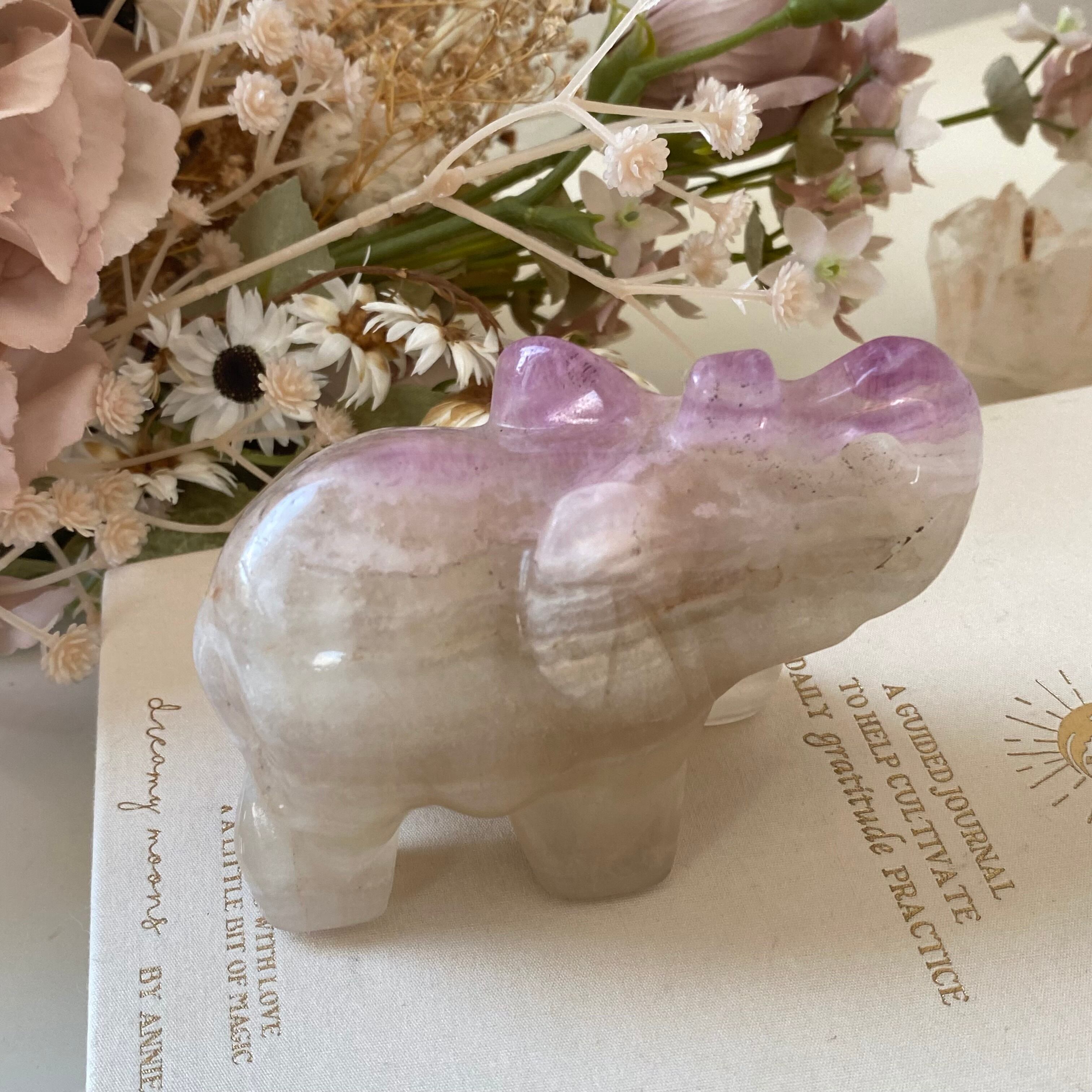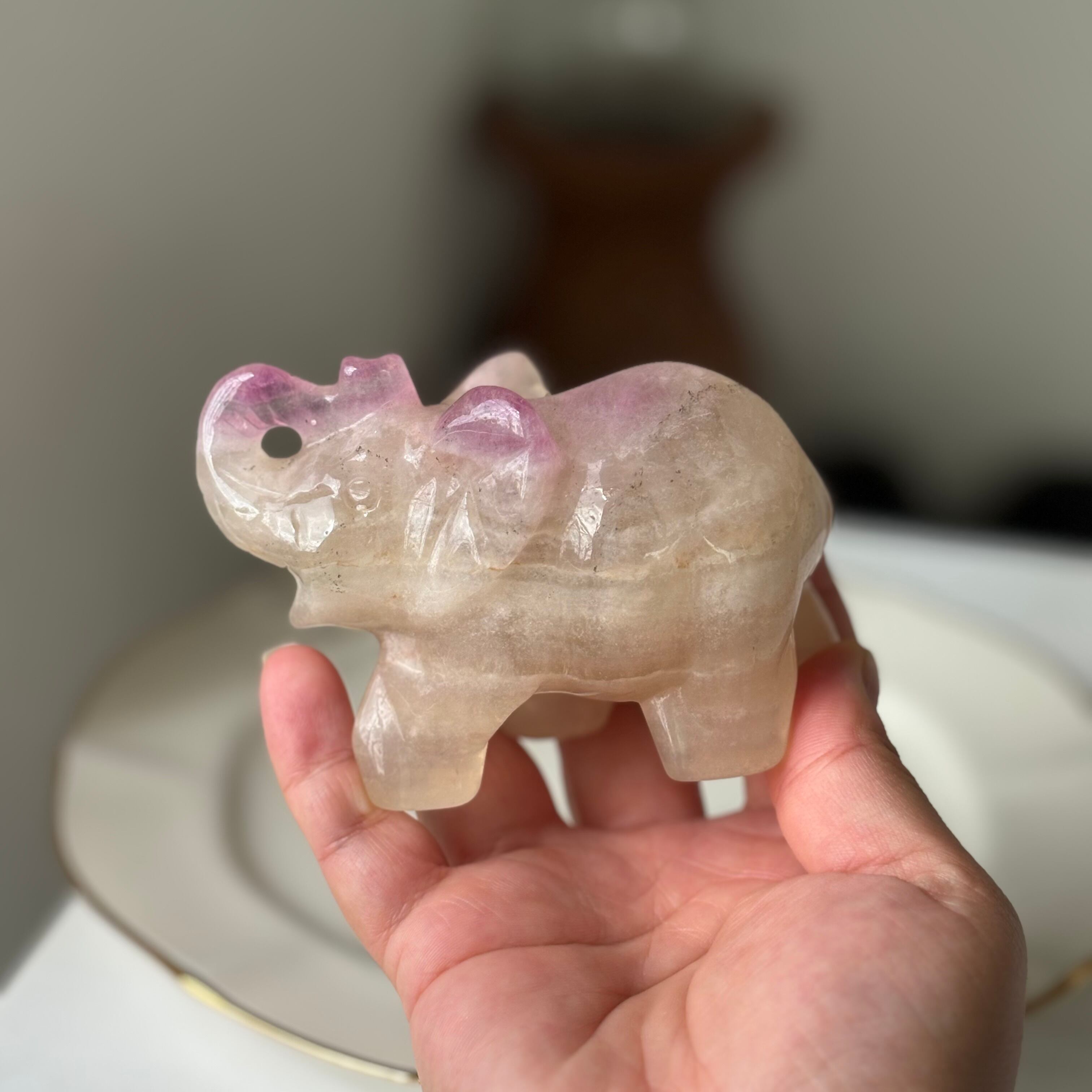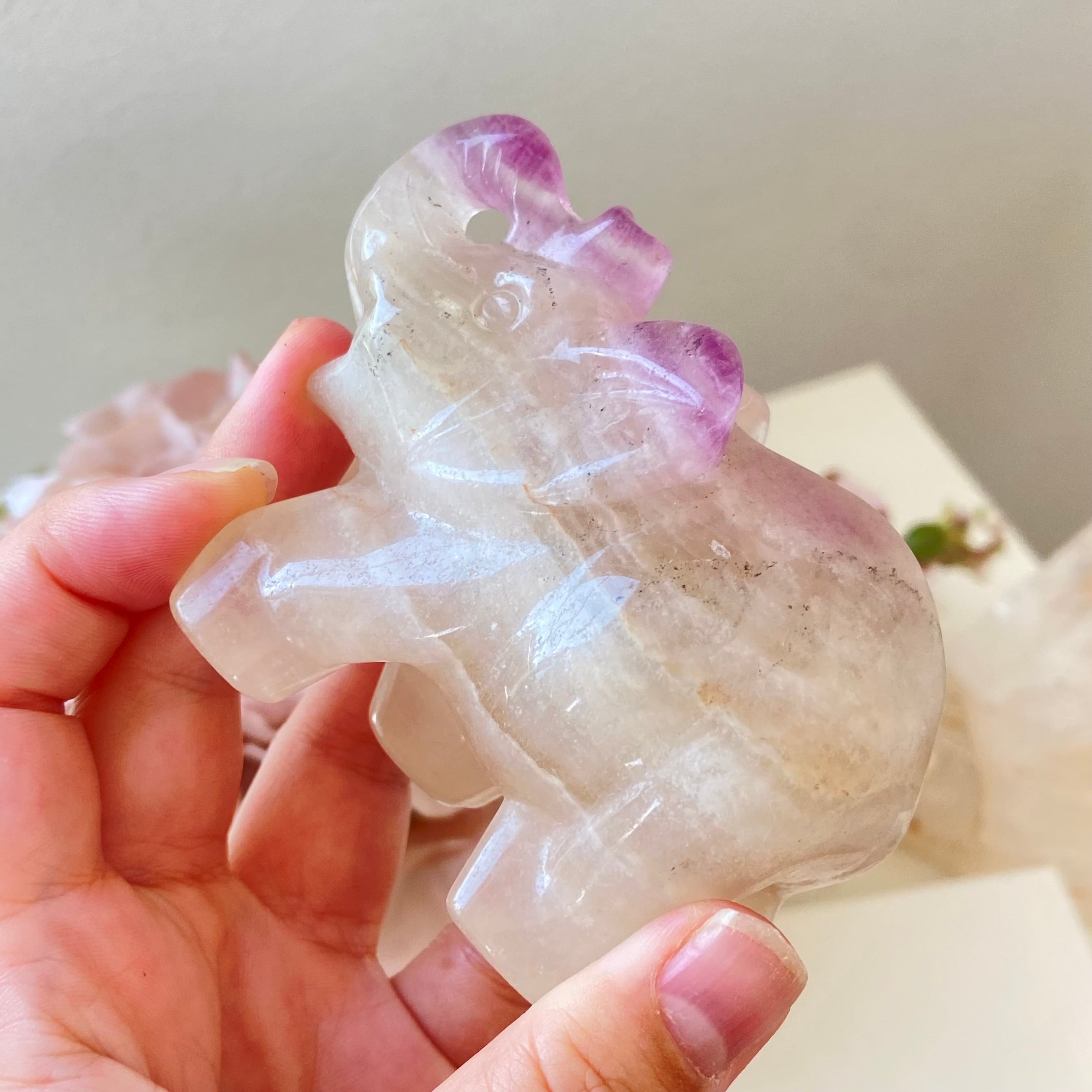 うっすらと透明感のあるベースに、紫〜ピンクのグラデーションが浮かび上がる、幻想的なフローライトのゾウさん。