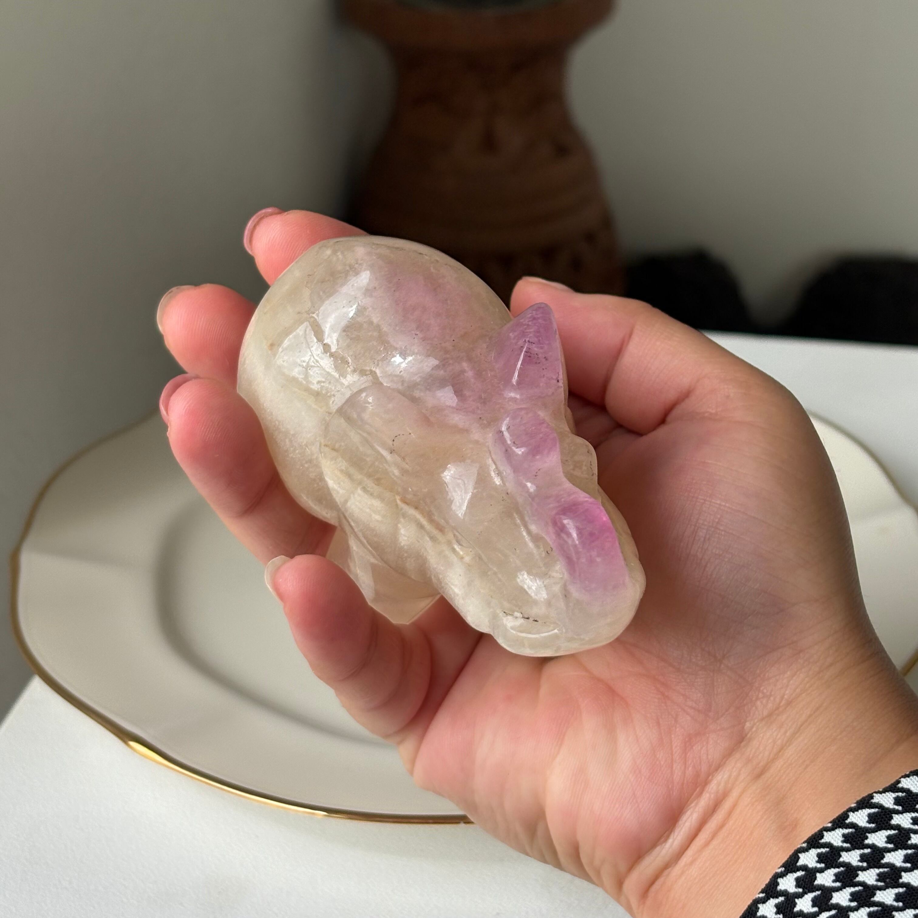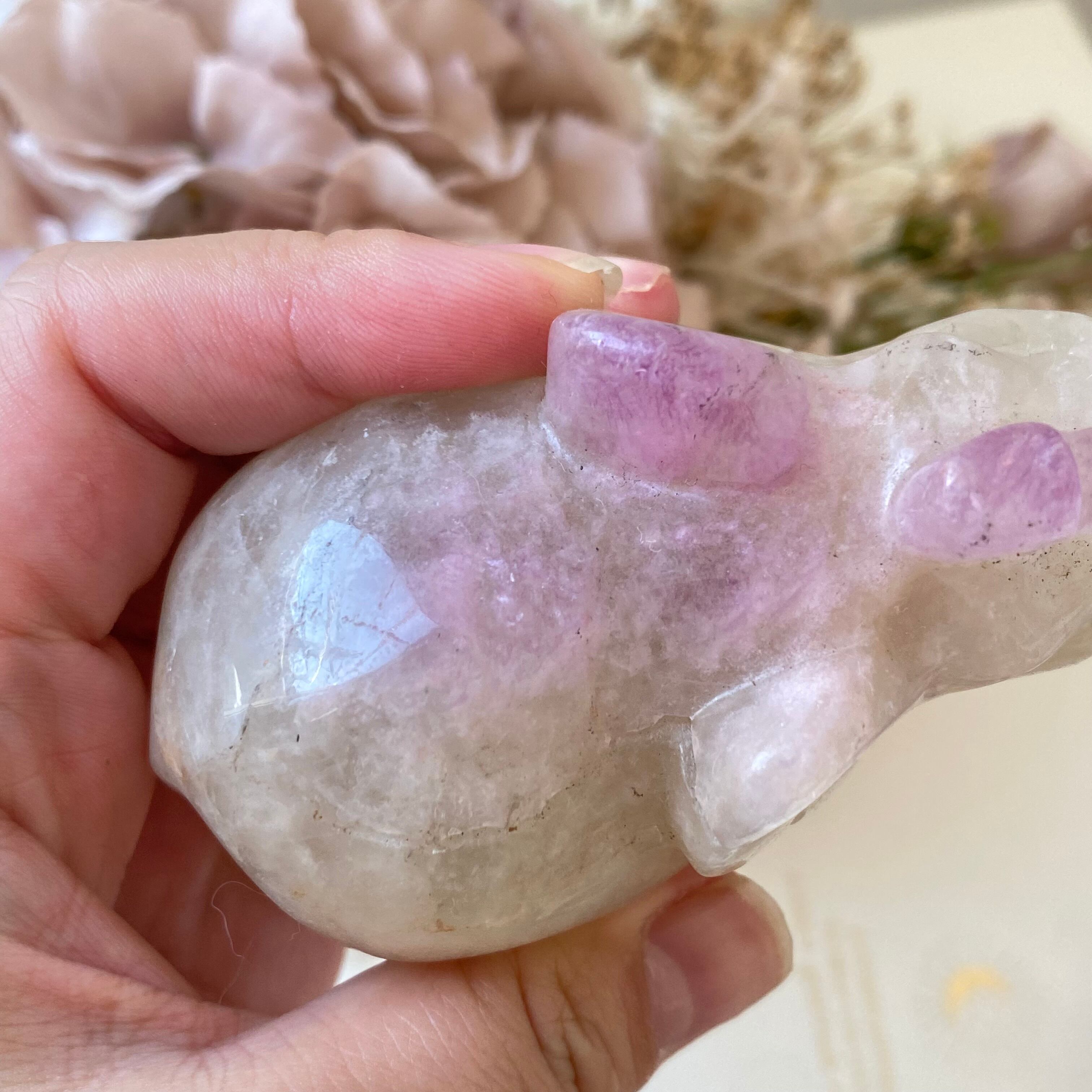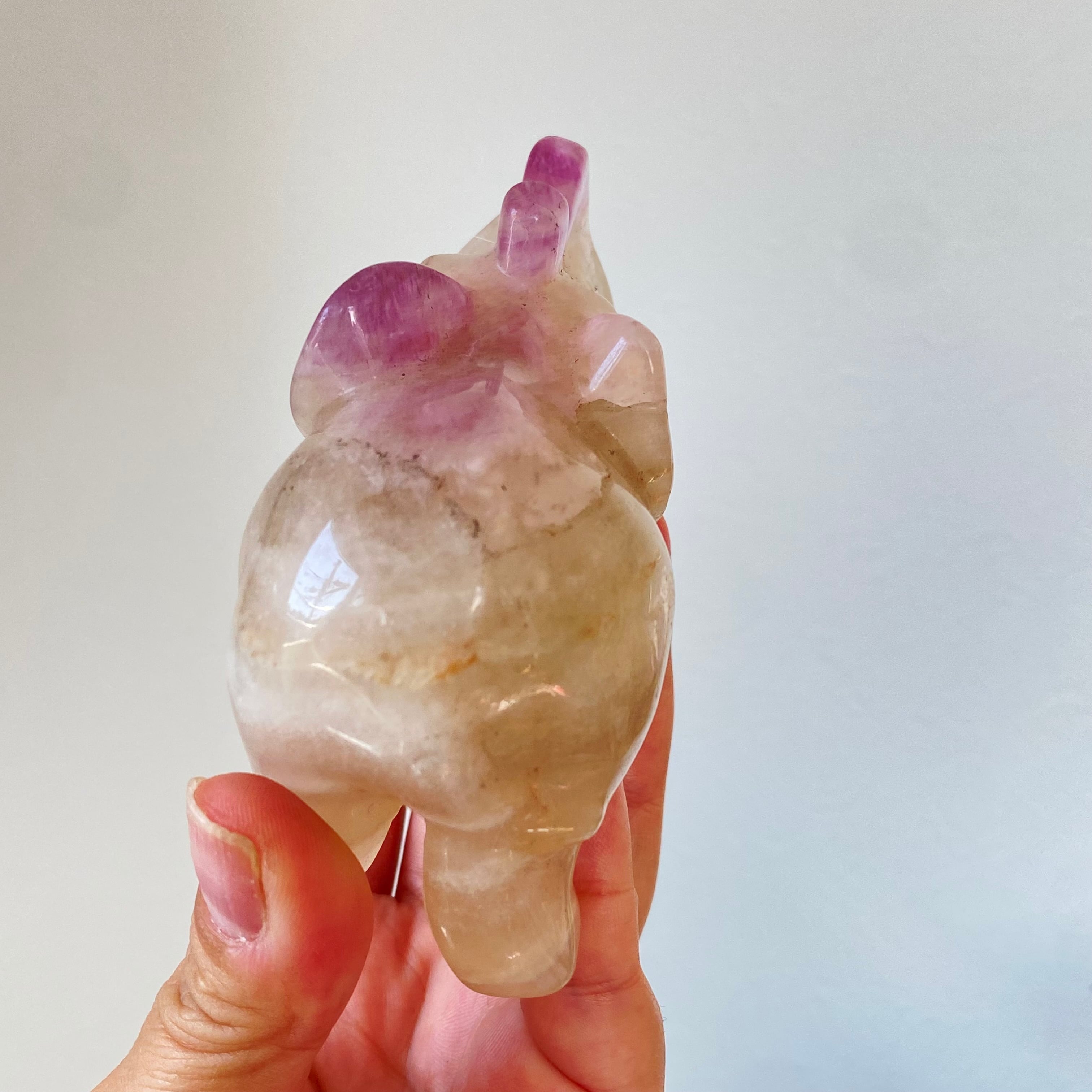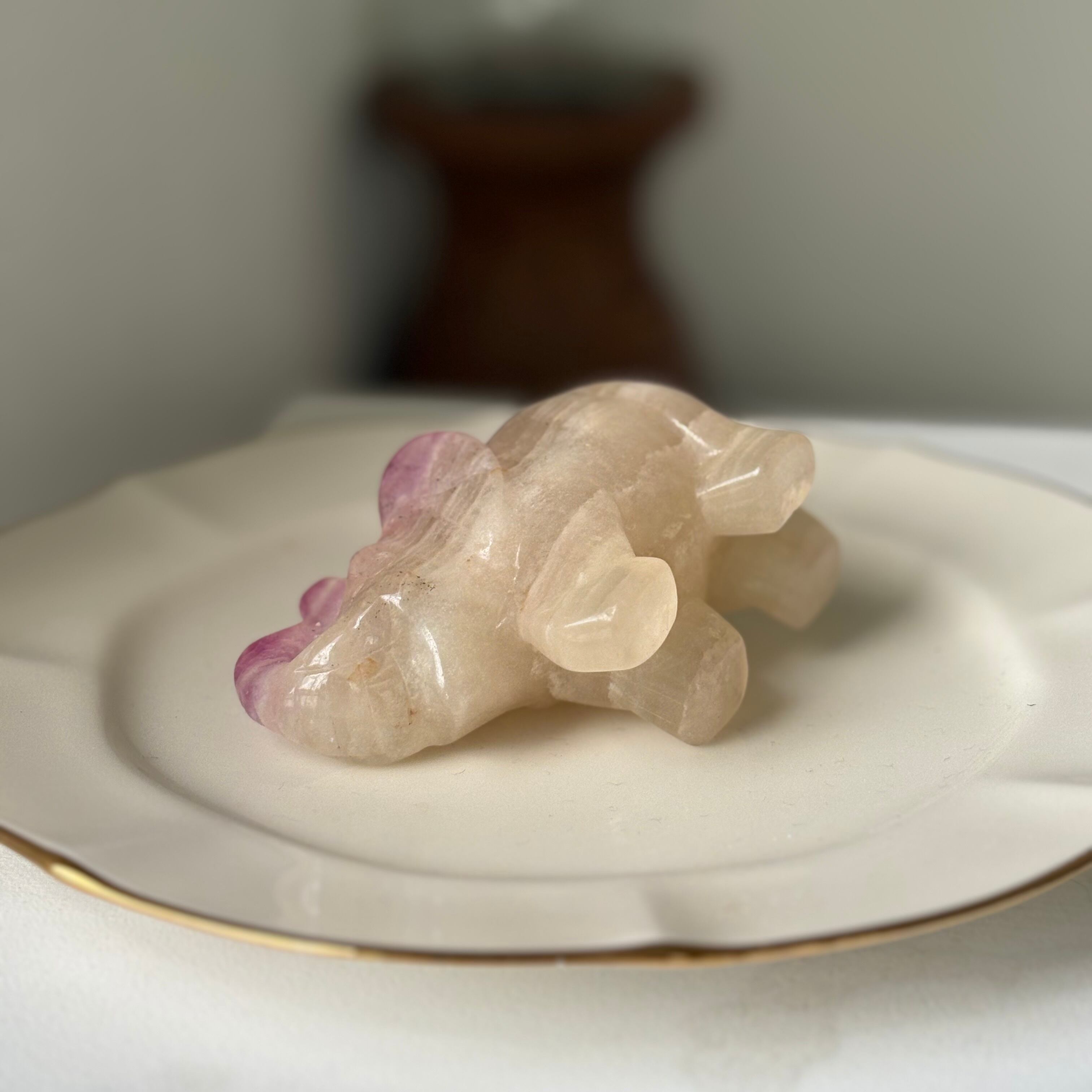 うっすらと透明感のあるベースに、紫〜ピンクのグラデーションが浮かび上がる、幻想的なフローライトのゾウさん。