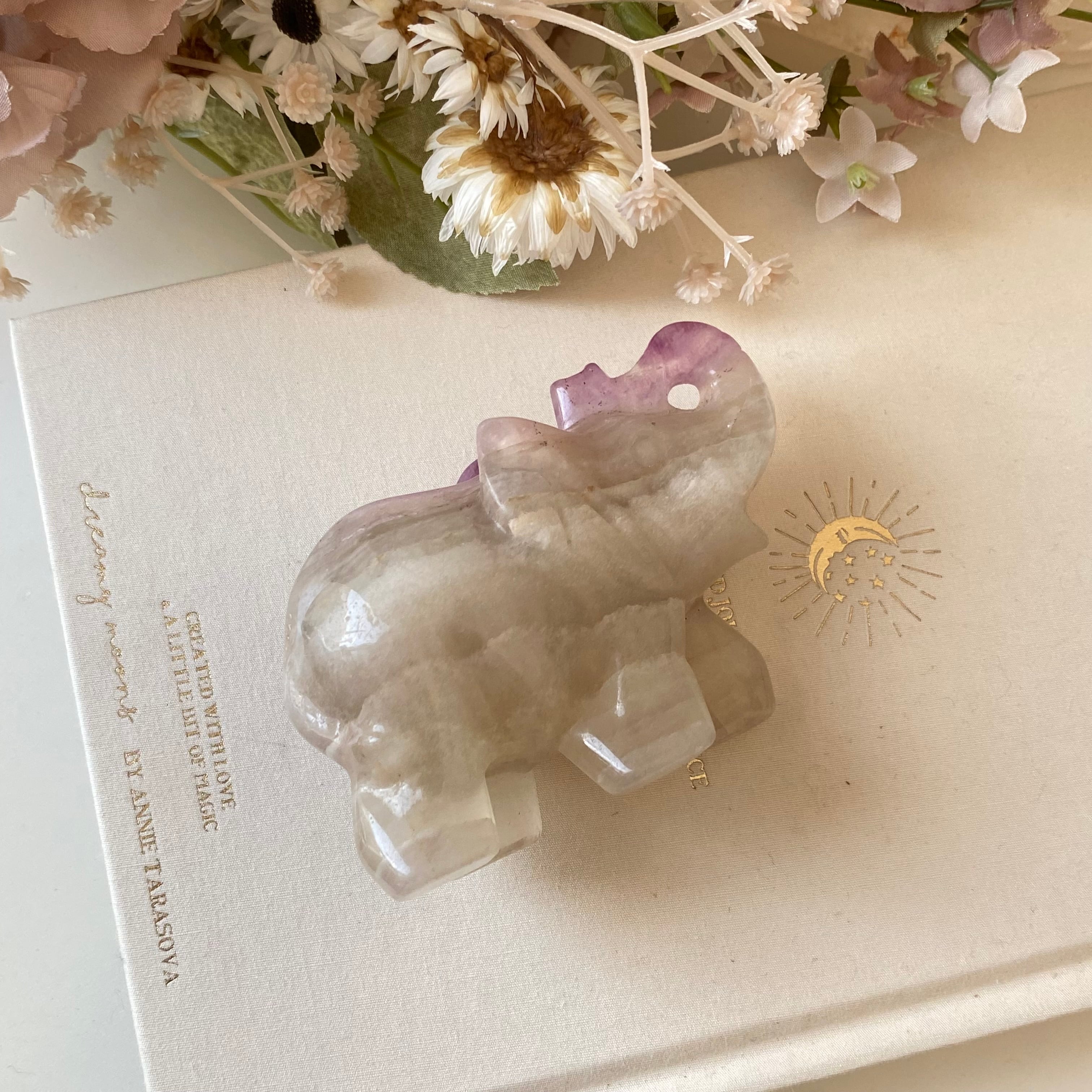 ゾウは幸運・長寿・智慧の象徴とされ、そこにフローライトの浄化・思考の整理・直感の明晰さというエネルギーが重なることで、