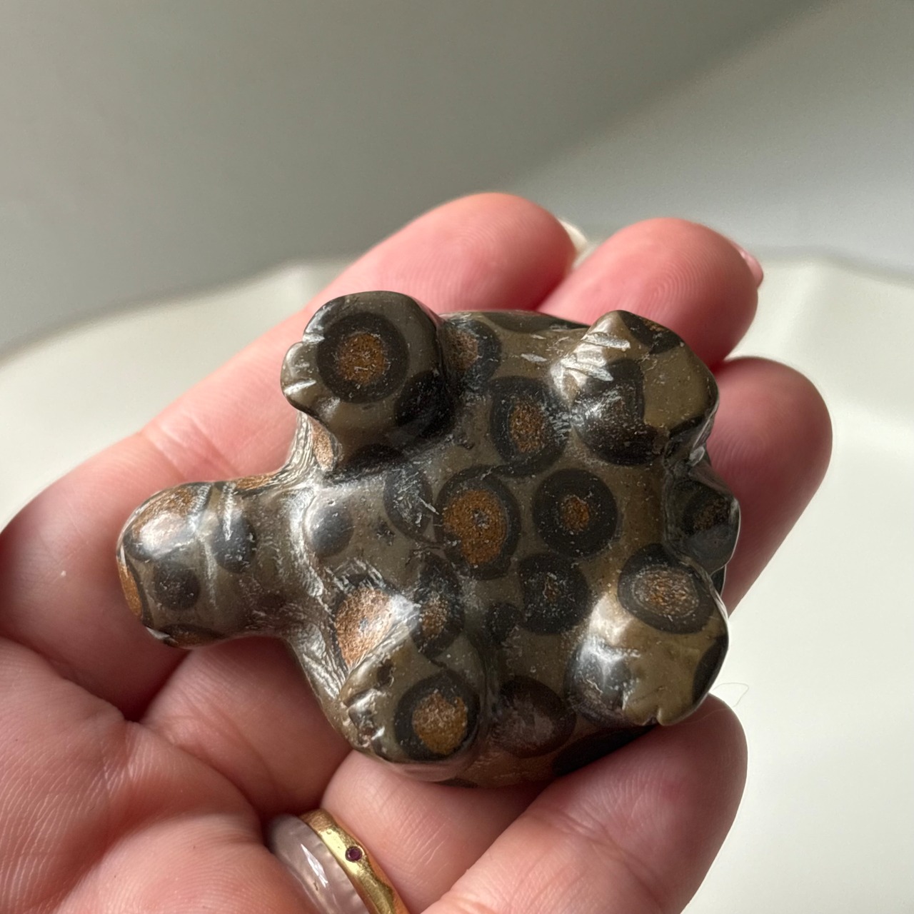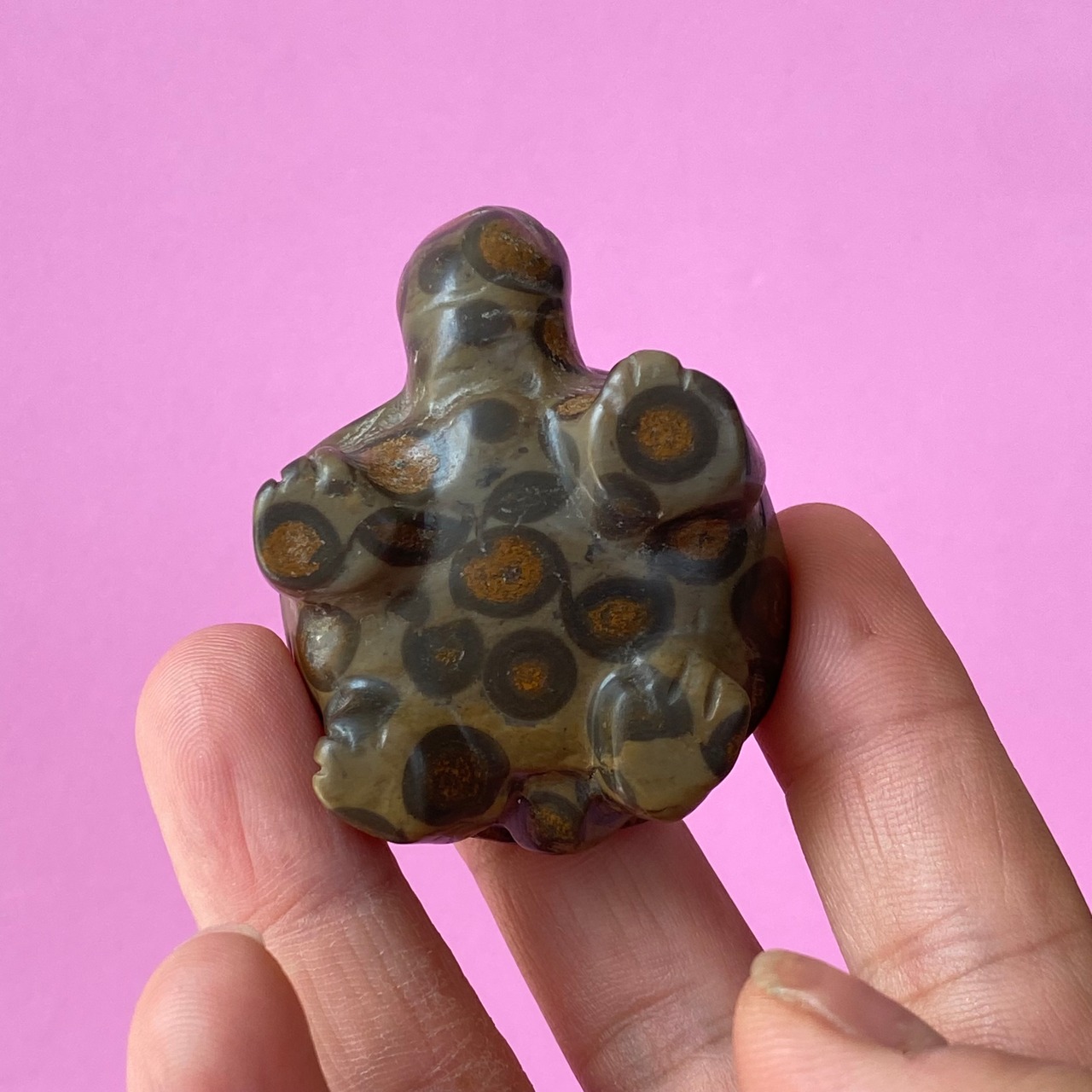 マネーアゲート特有の斑点模様が、甲羅全体に美しく浮かび、