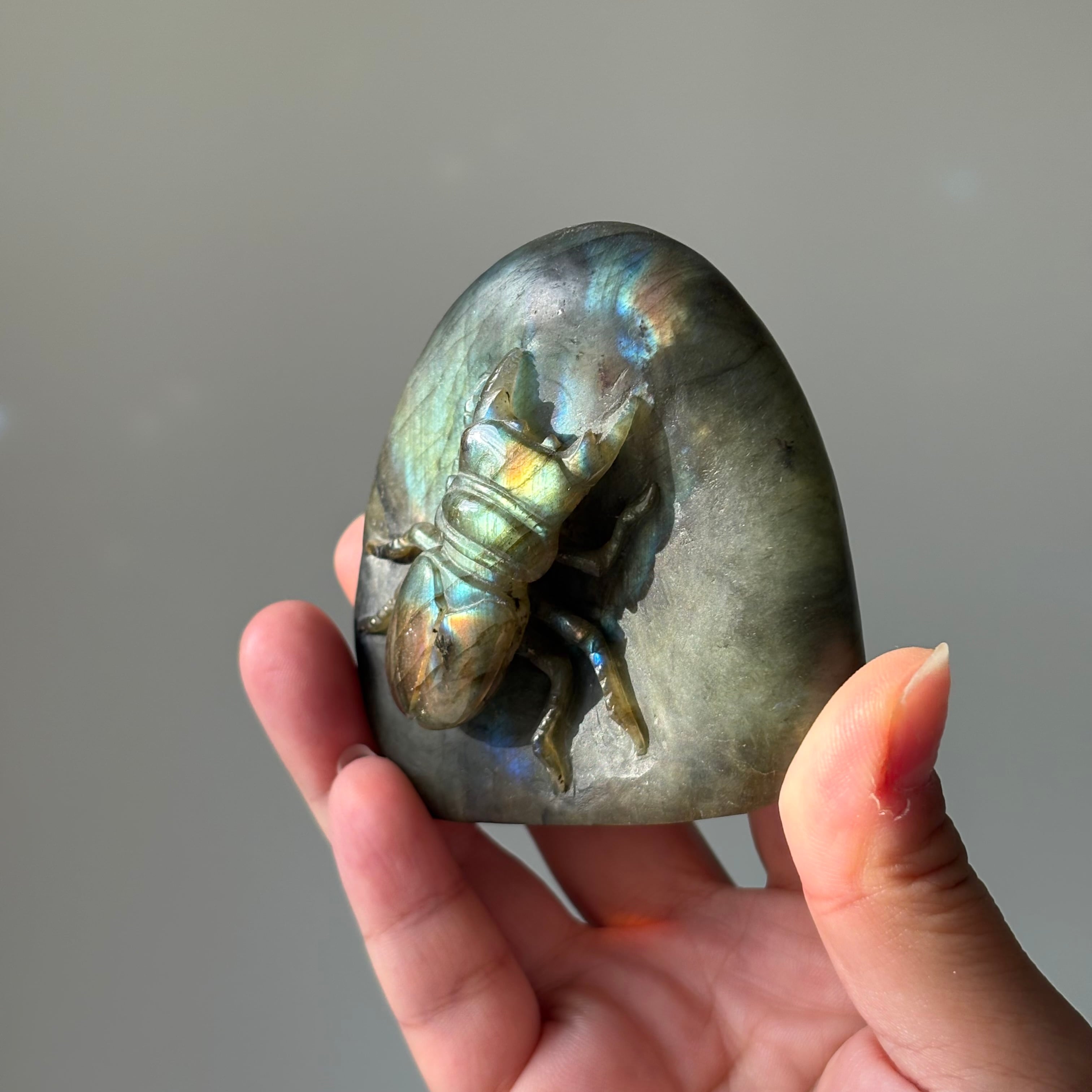 ラブラドライトの奥深い輝きに、力強く彫り込まれたクワガタ。