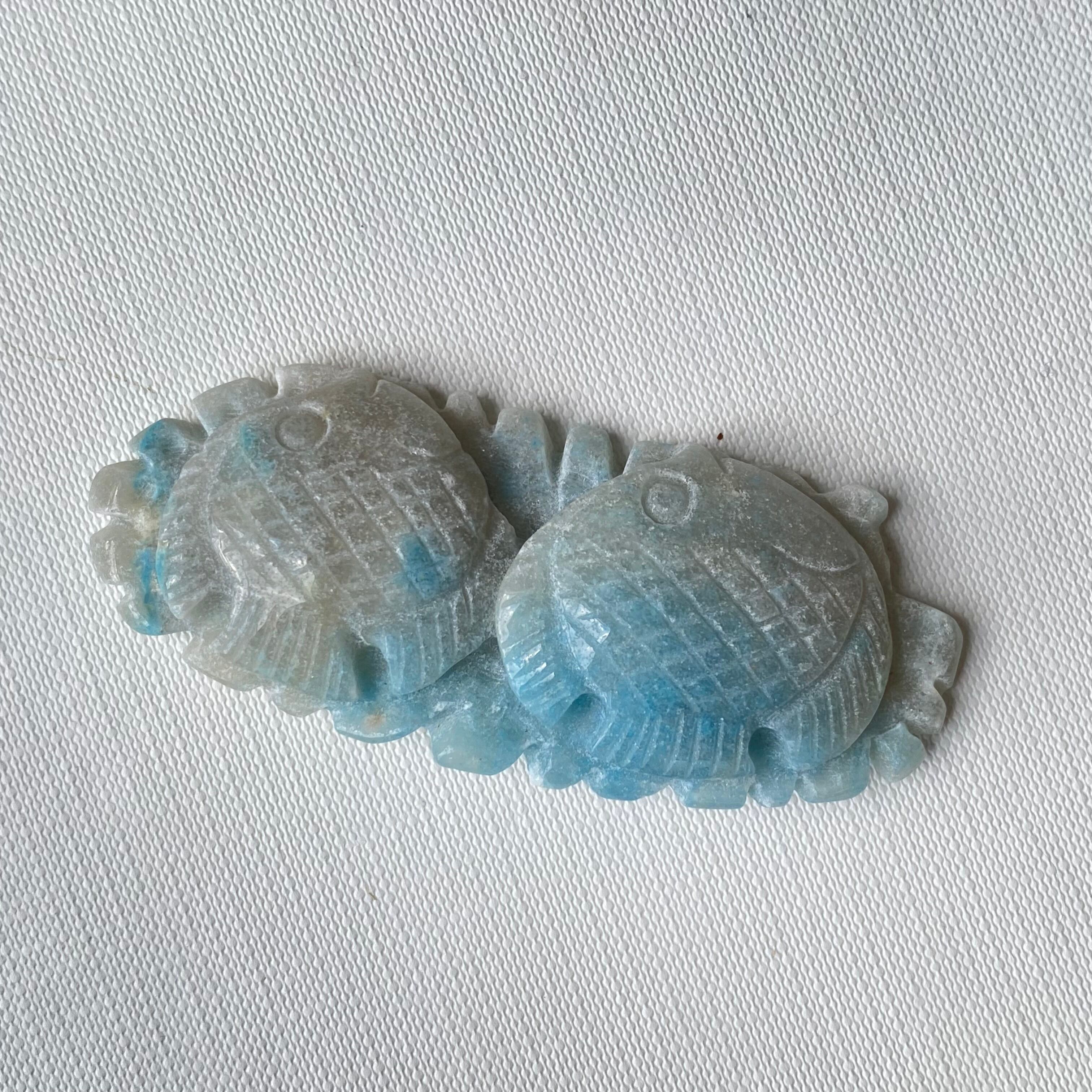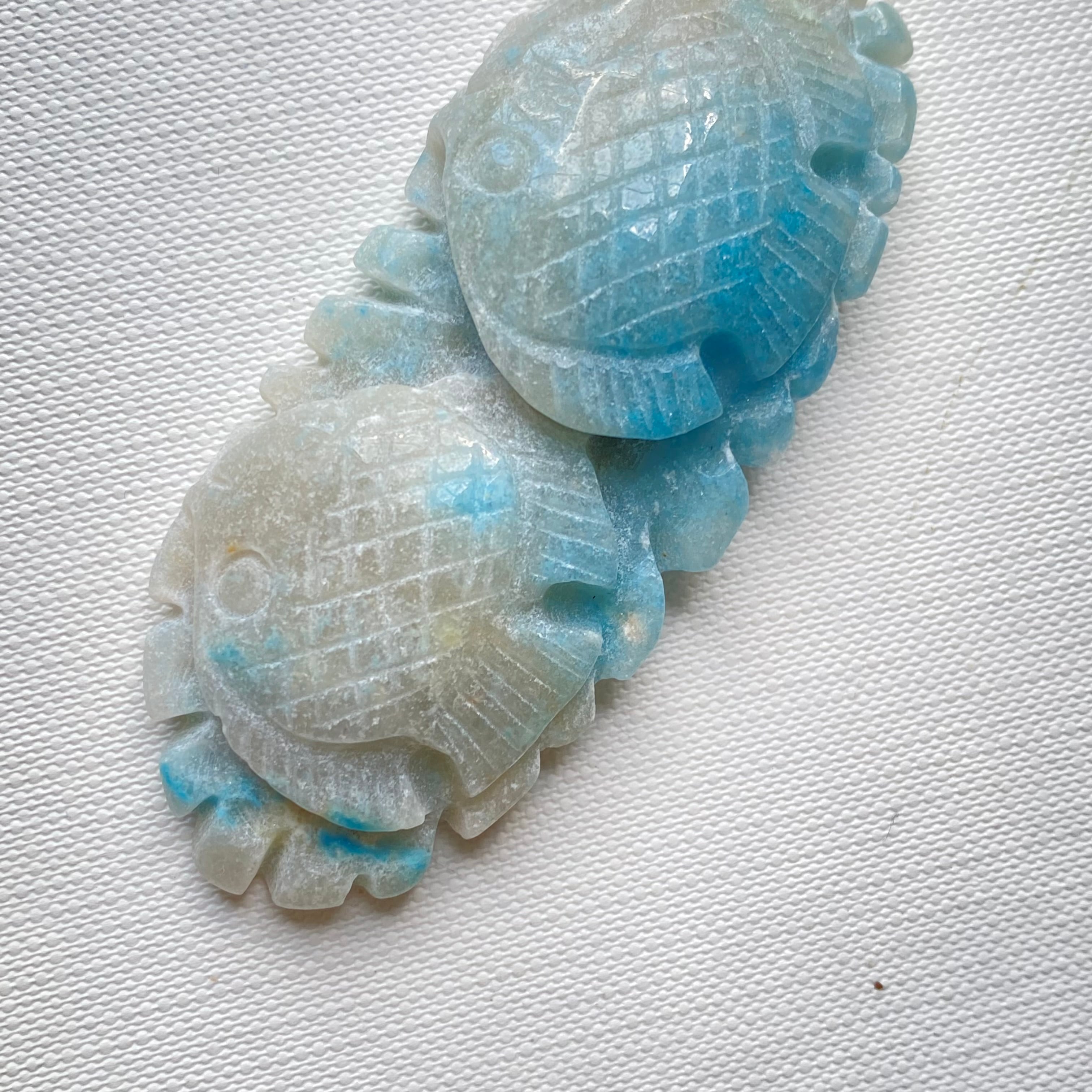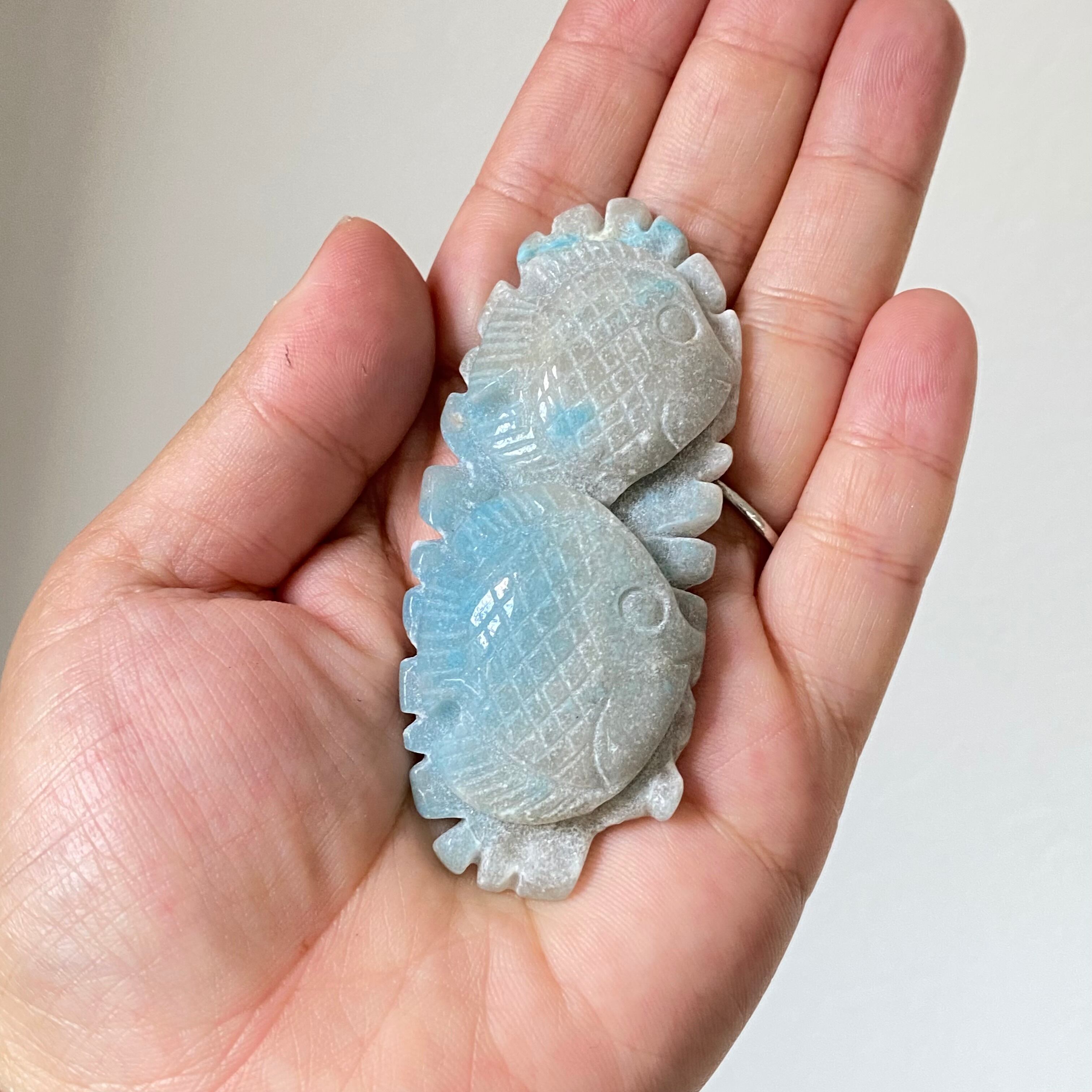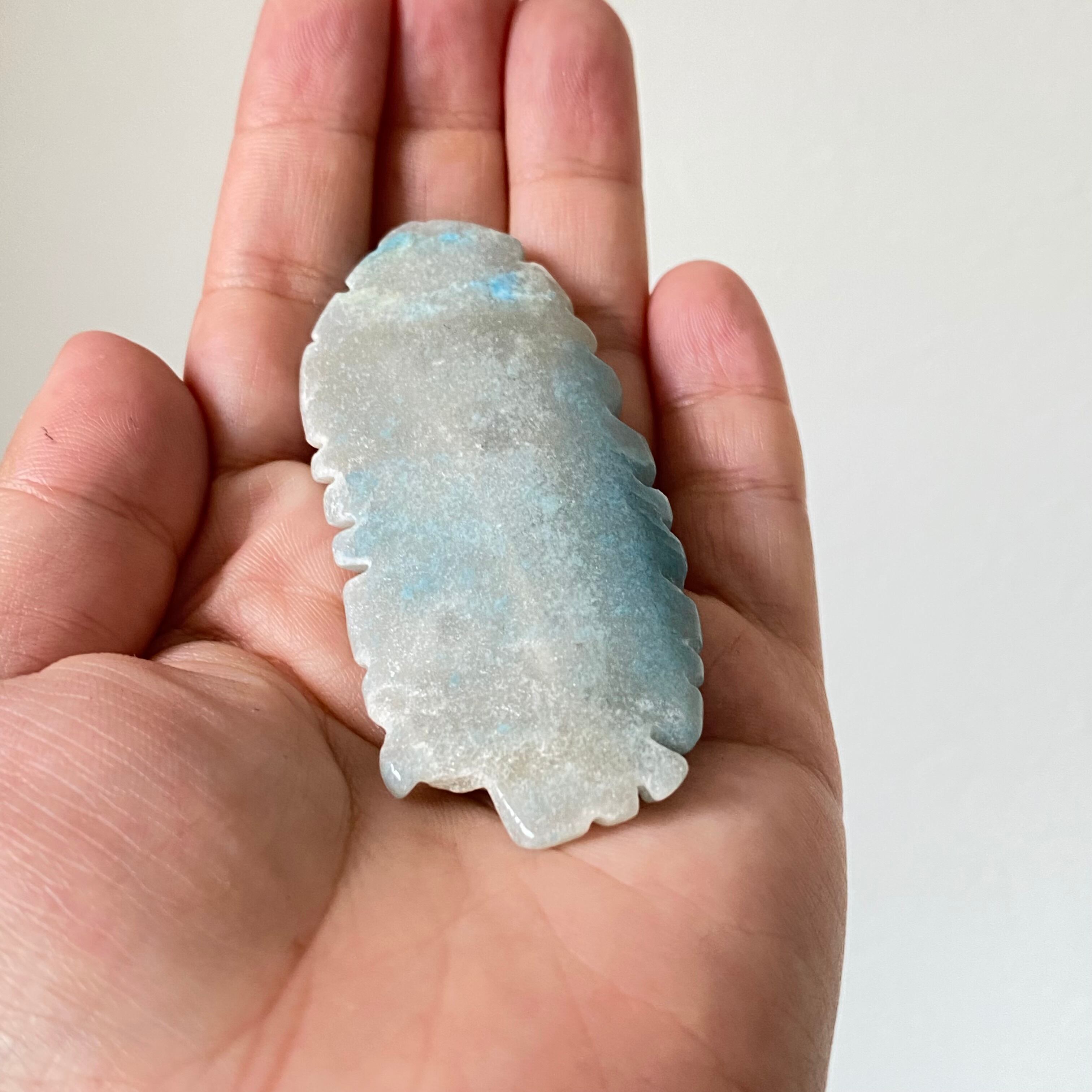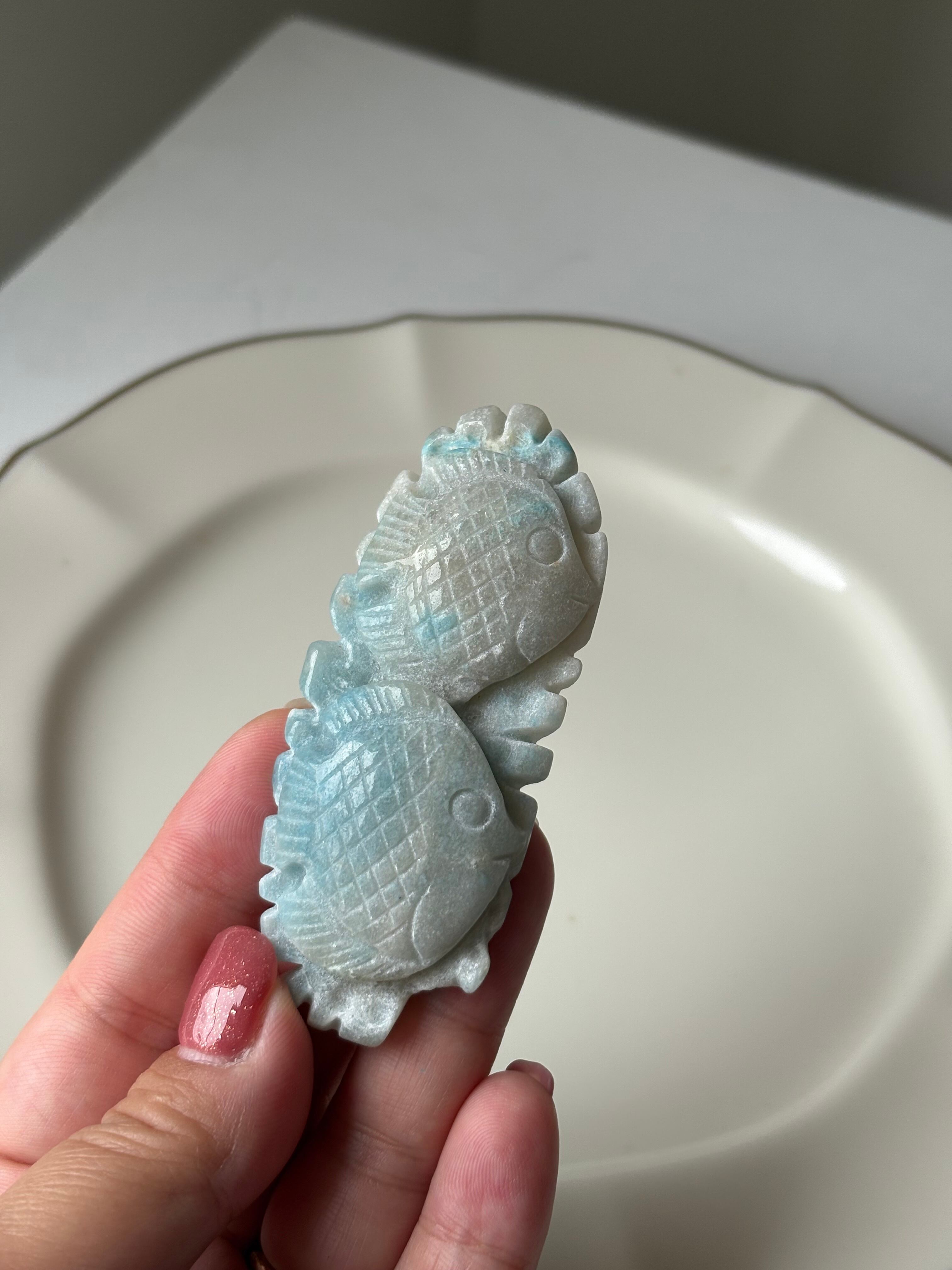 幻想的なブルーグレーのグラデーションが美しい、トロレアイトインクォーツのお魚カービング。