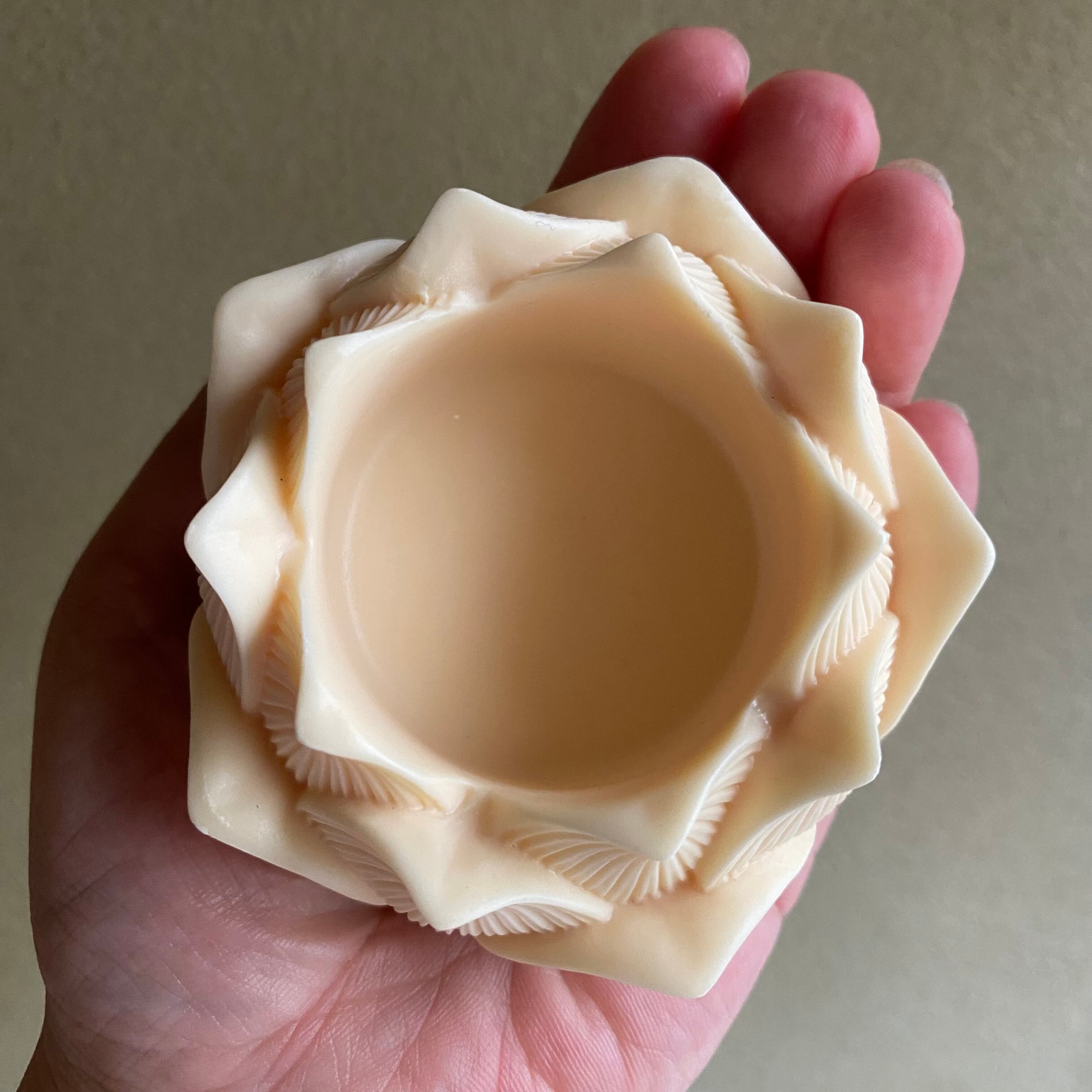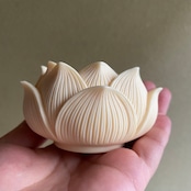 手のひらサイズながら、柔らかな表情や細やかな蓮弁の彫刻に、職人の丁寧な手仕事と祈りが宿っています。ほんのりミルキーな質感は、見た目にも心を和ませてくれます。