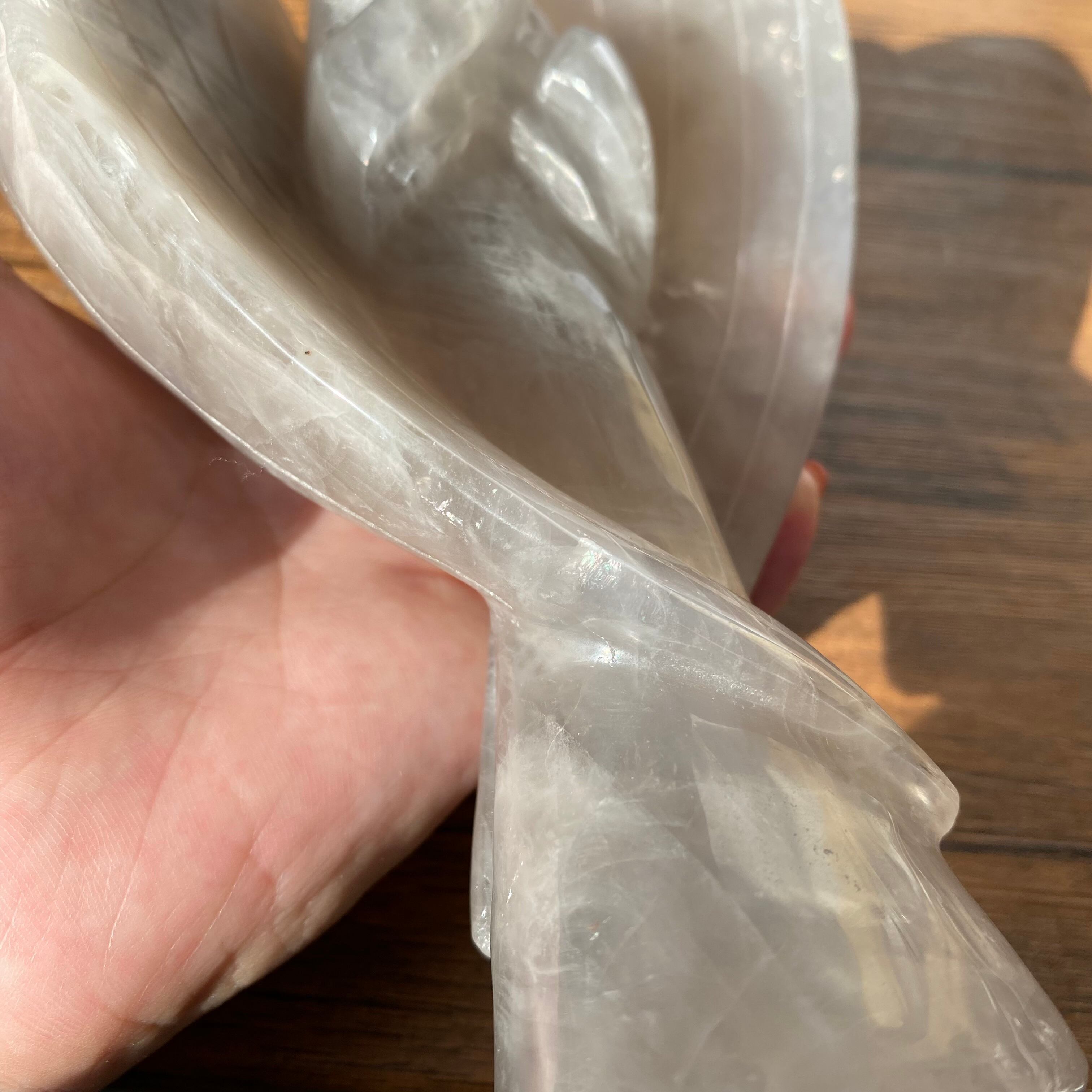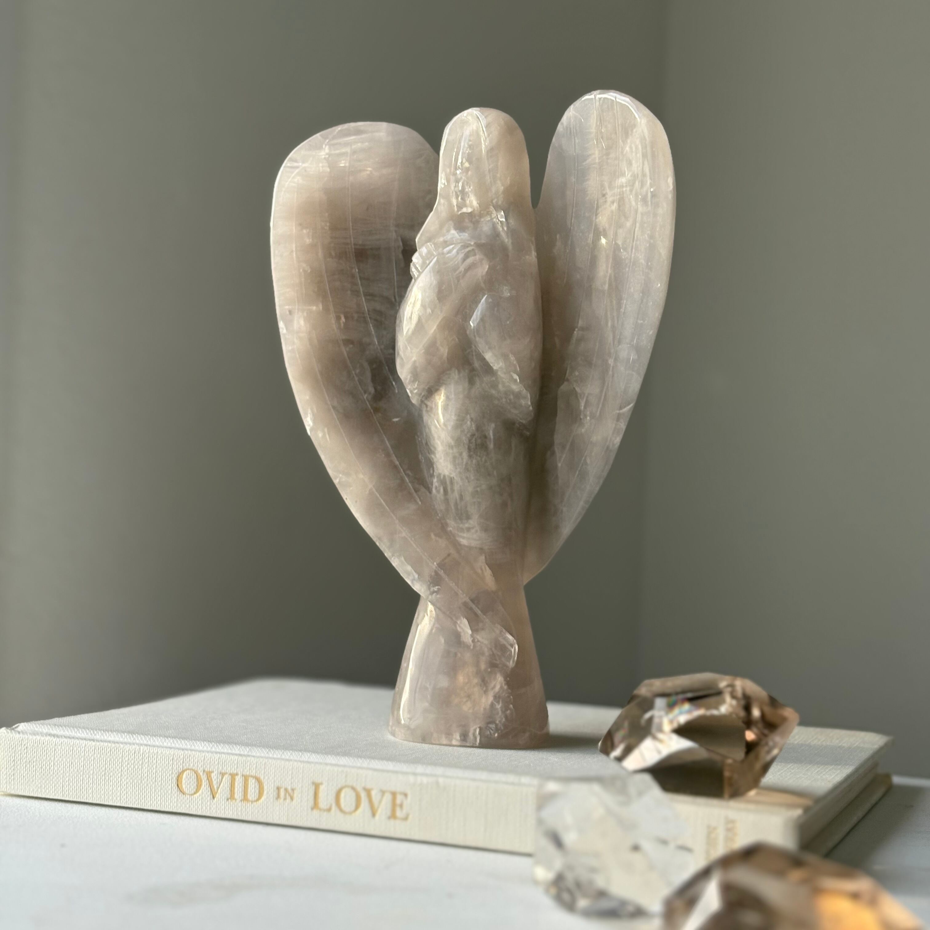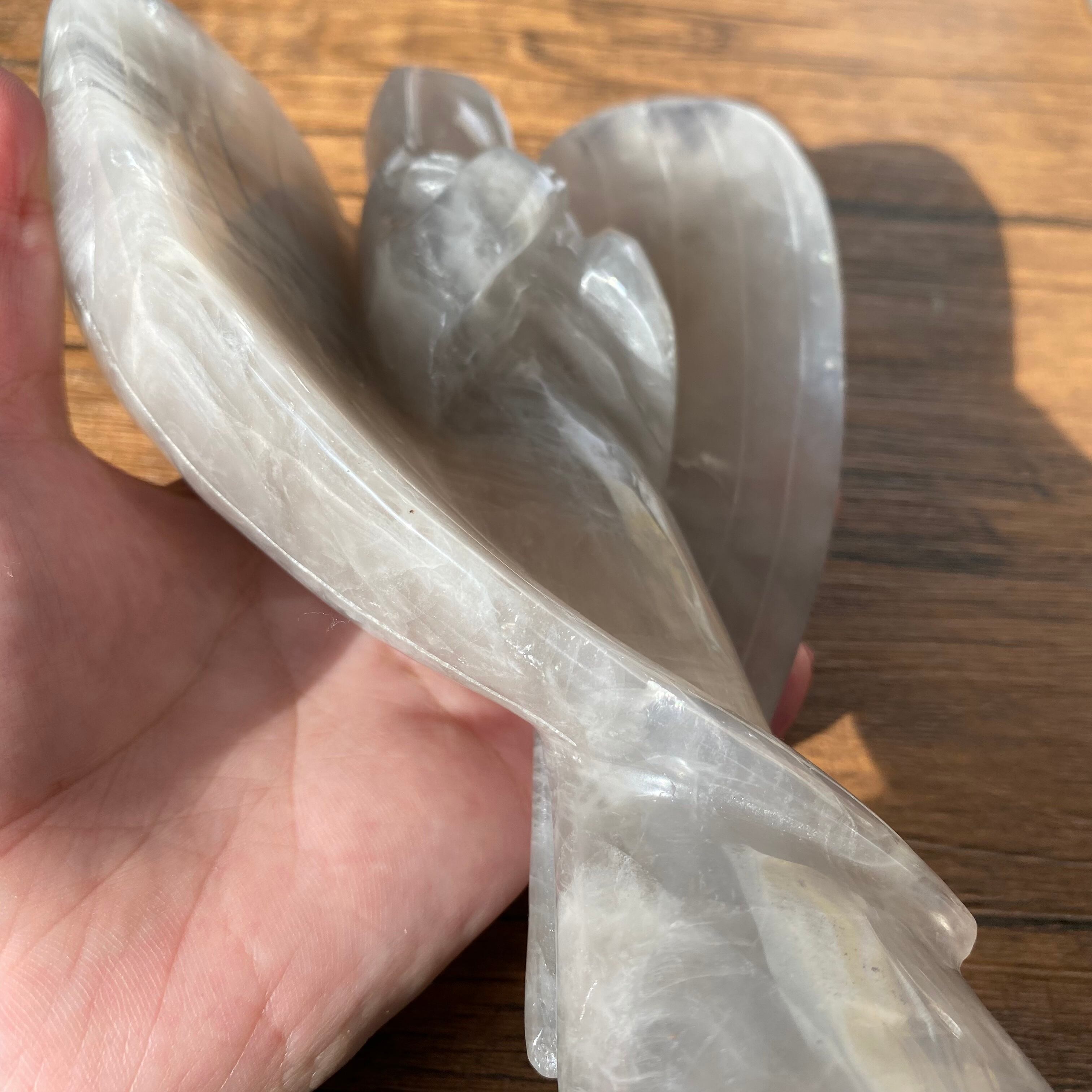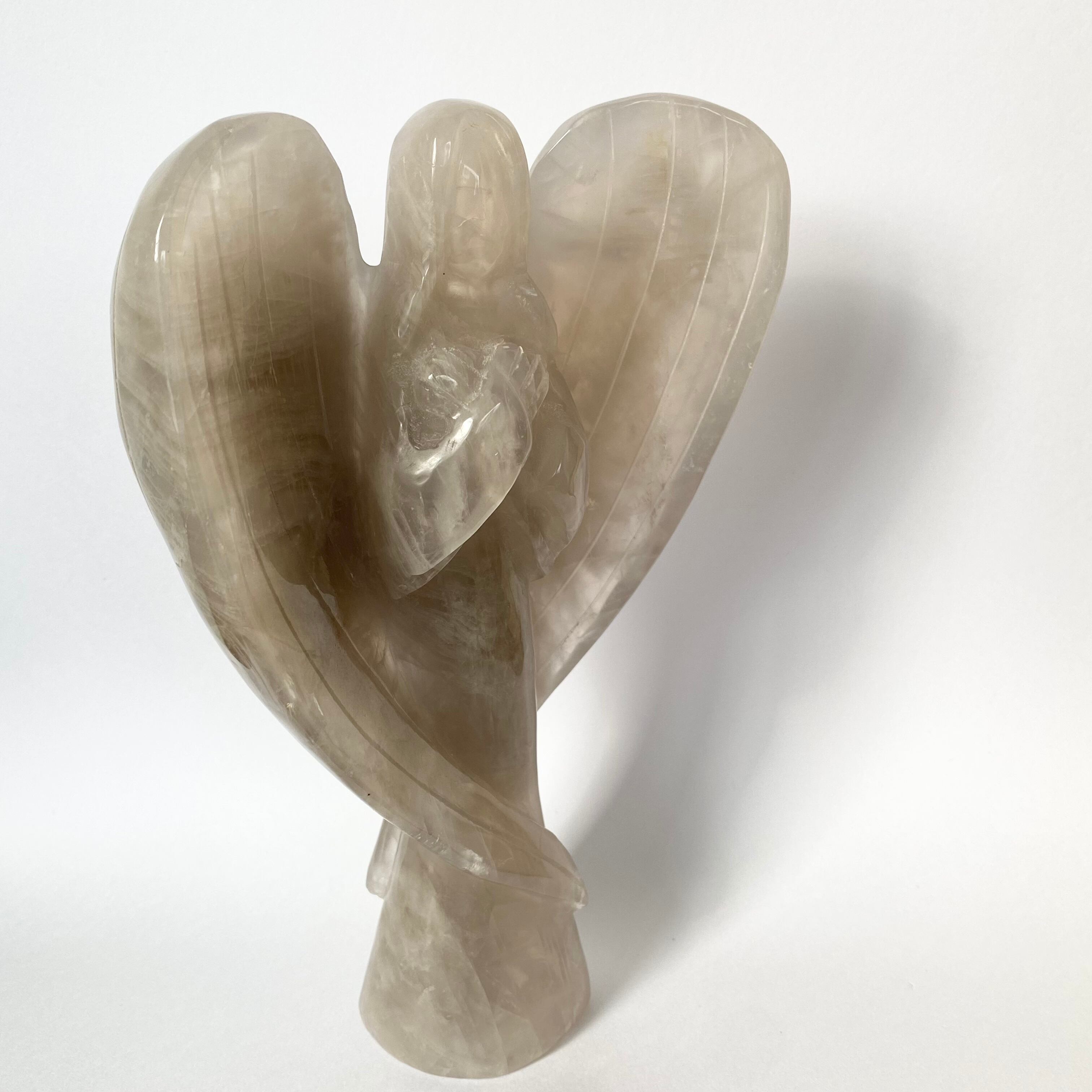 淡いブルーグレーの発色が神秘的な、マダガスカル産のブルーローズクォーツで彫られたエンジェル像です。