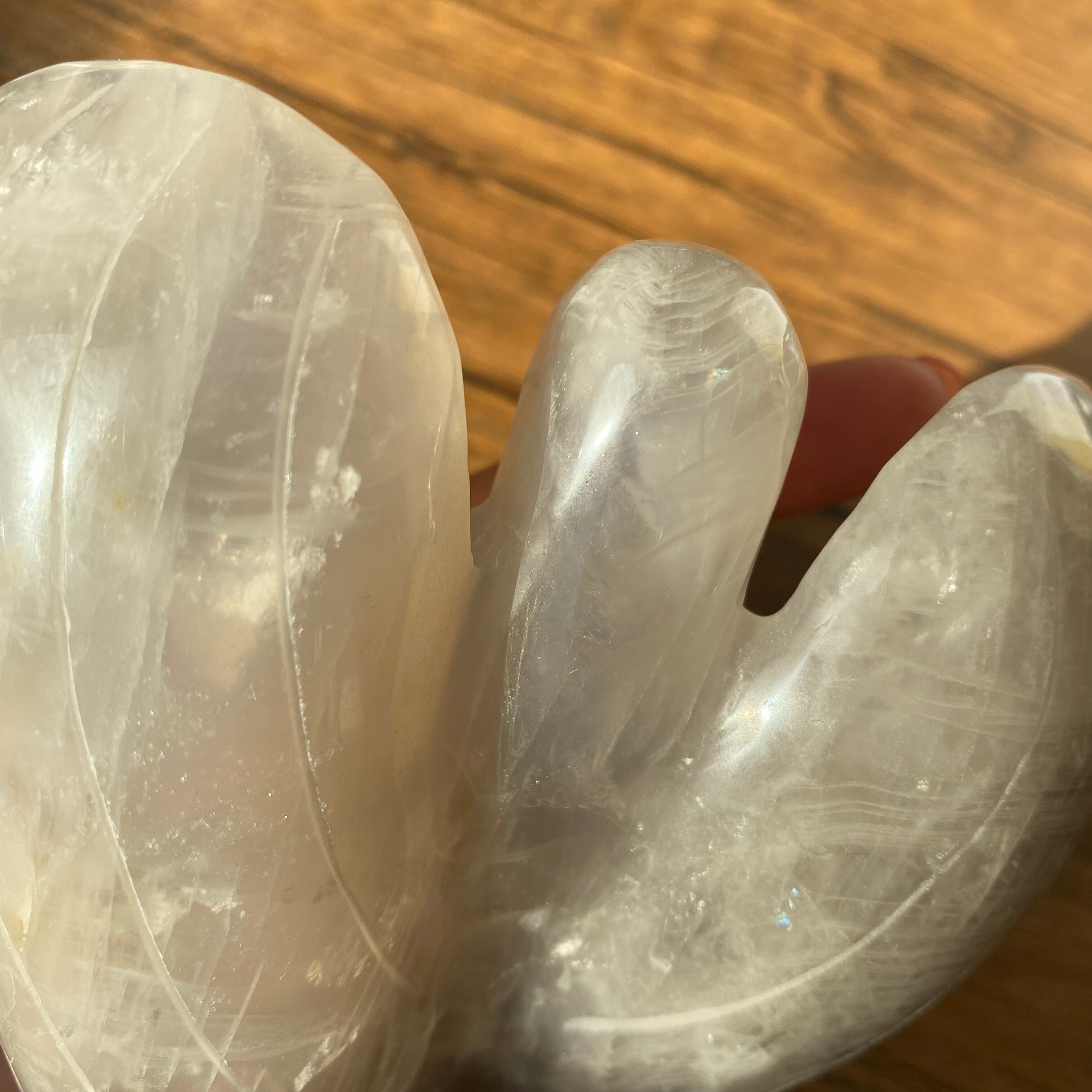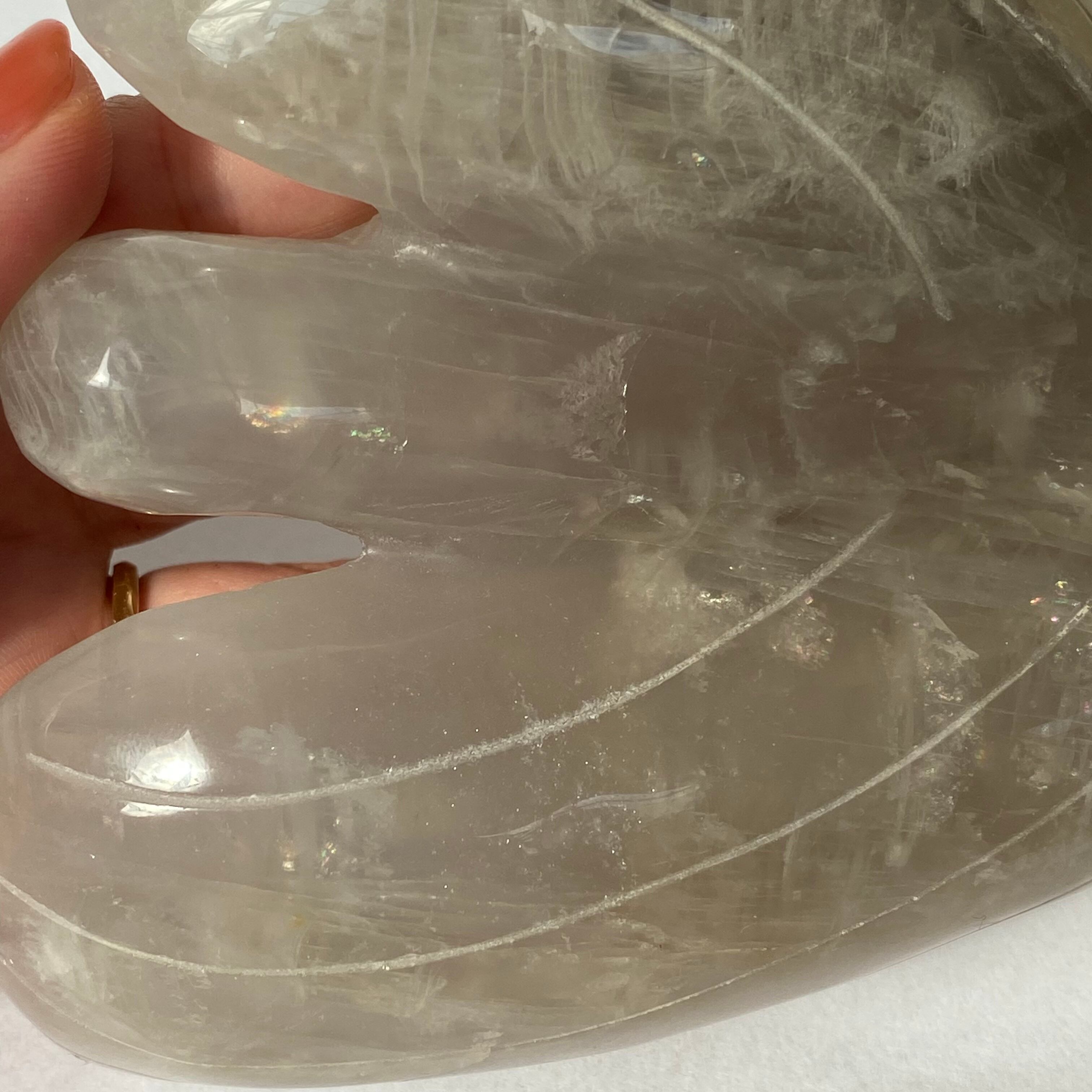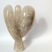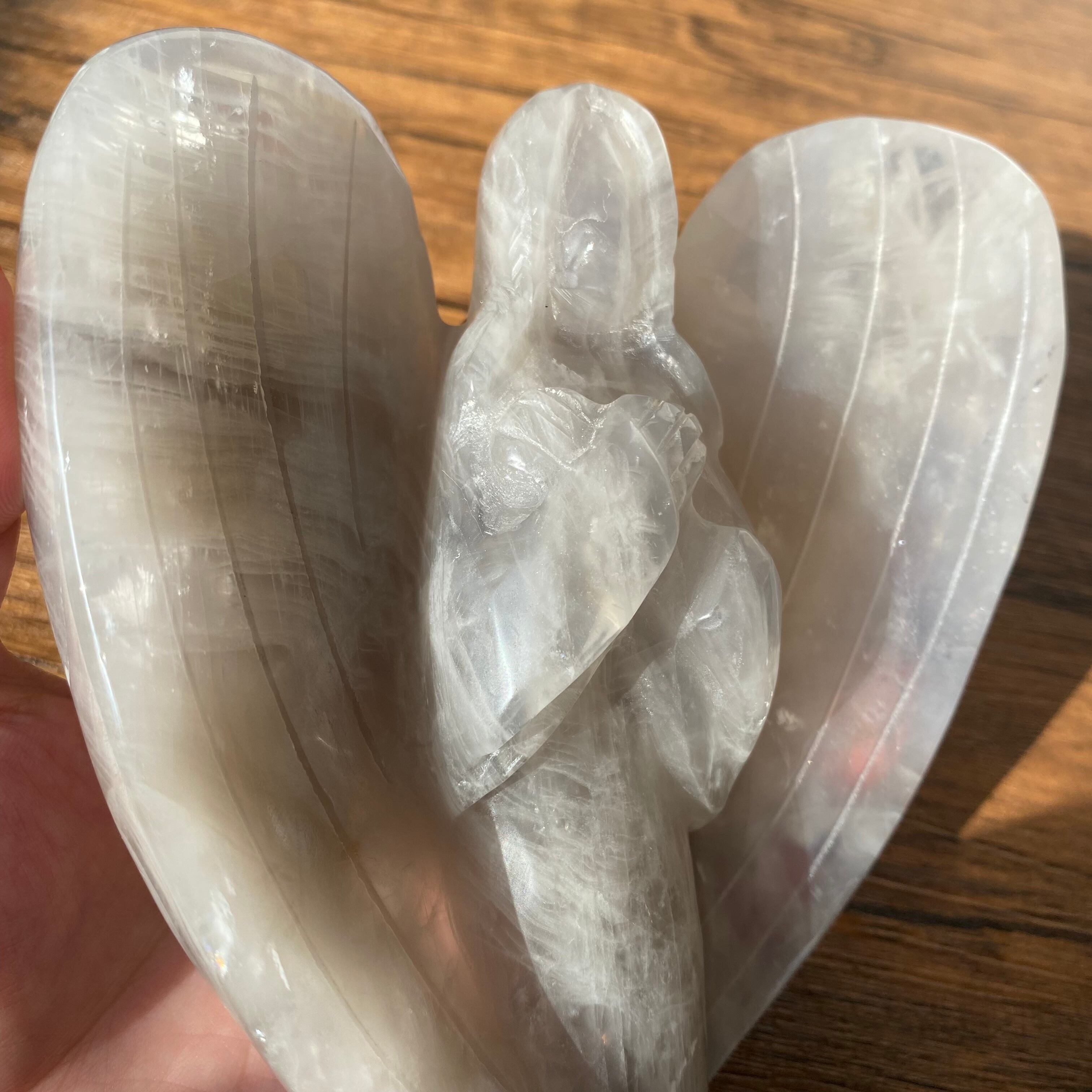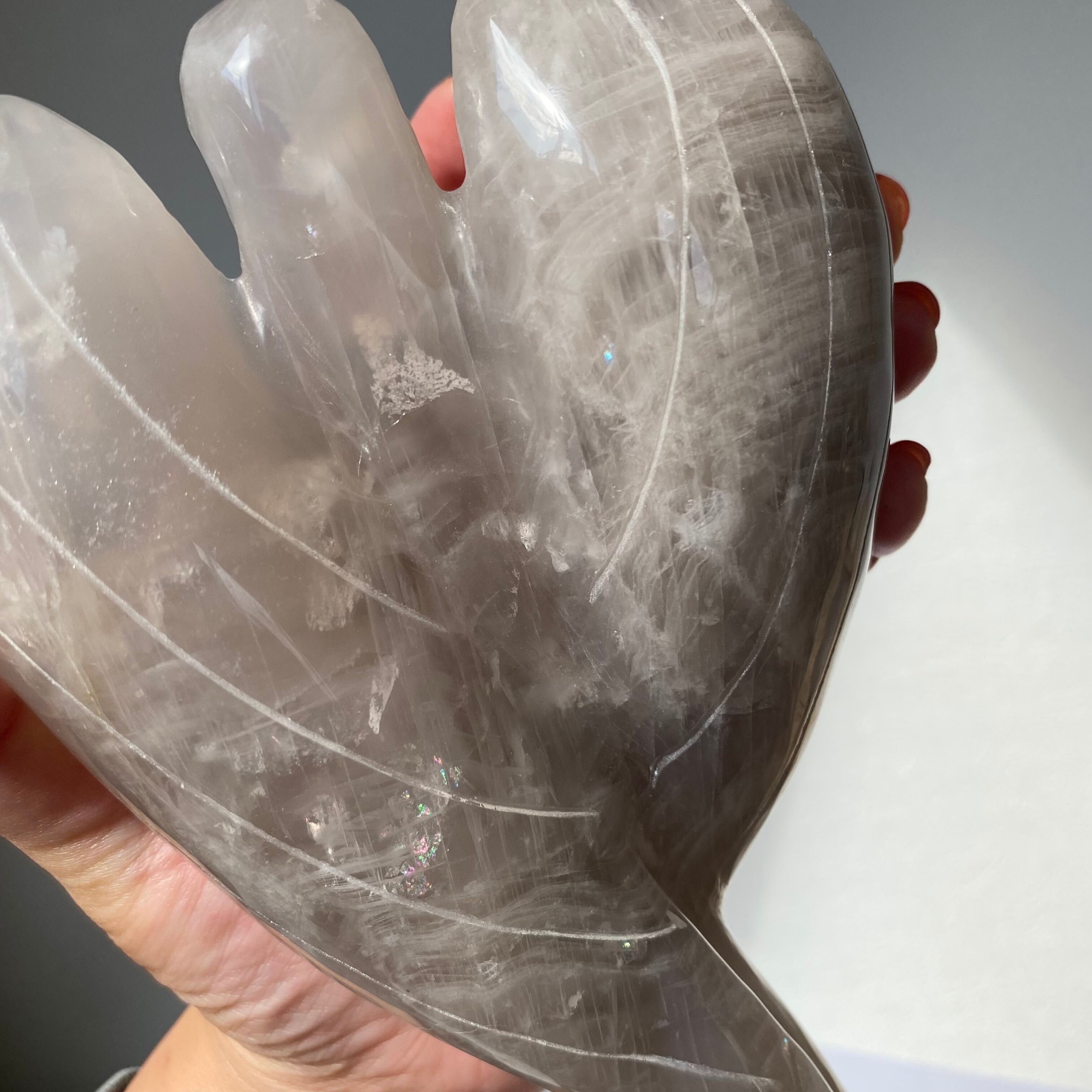 淡いブルーグレーの発色が神秘的な、マダガスカル産のブルーローズクォーツで彫られたエンジェル像です。