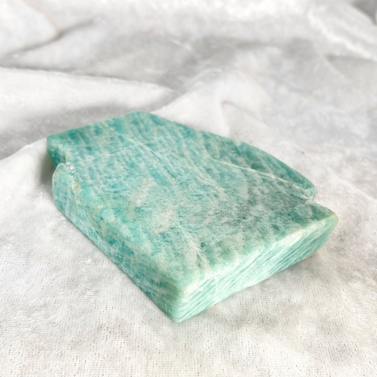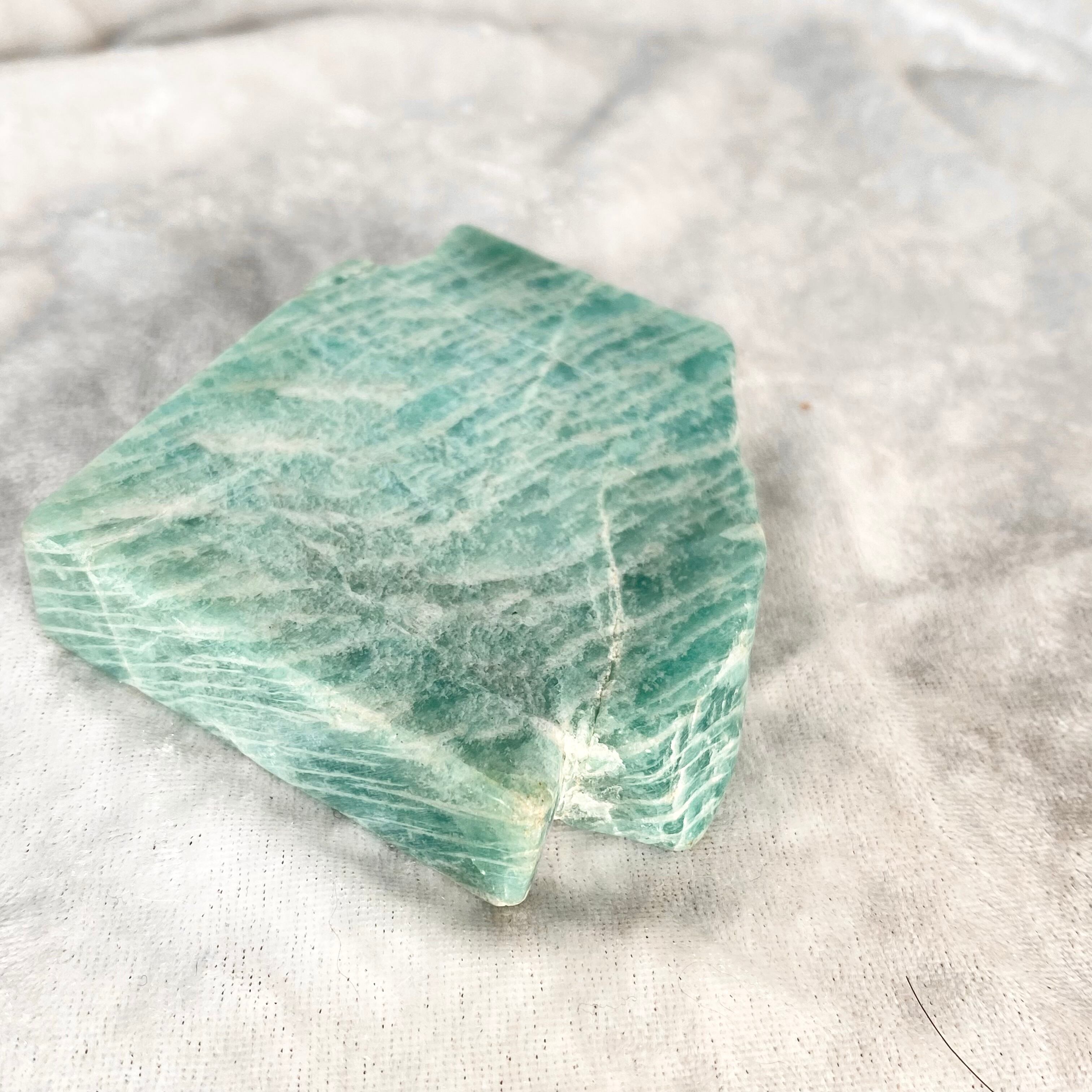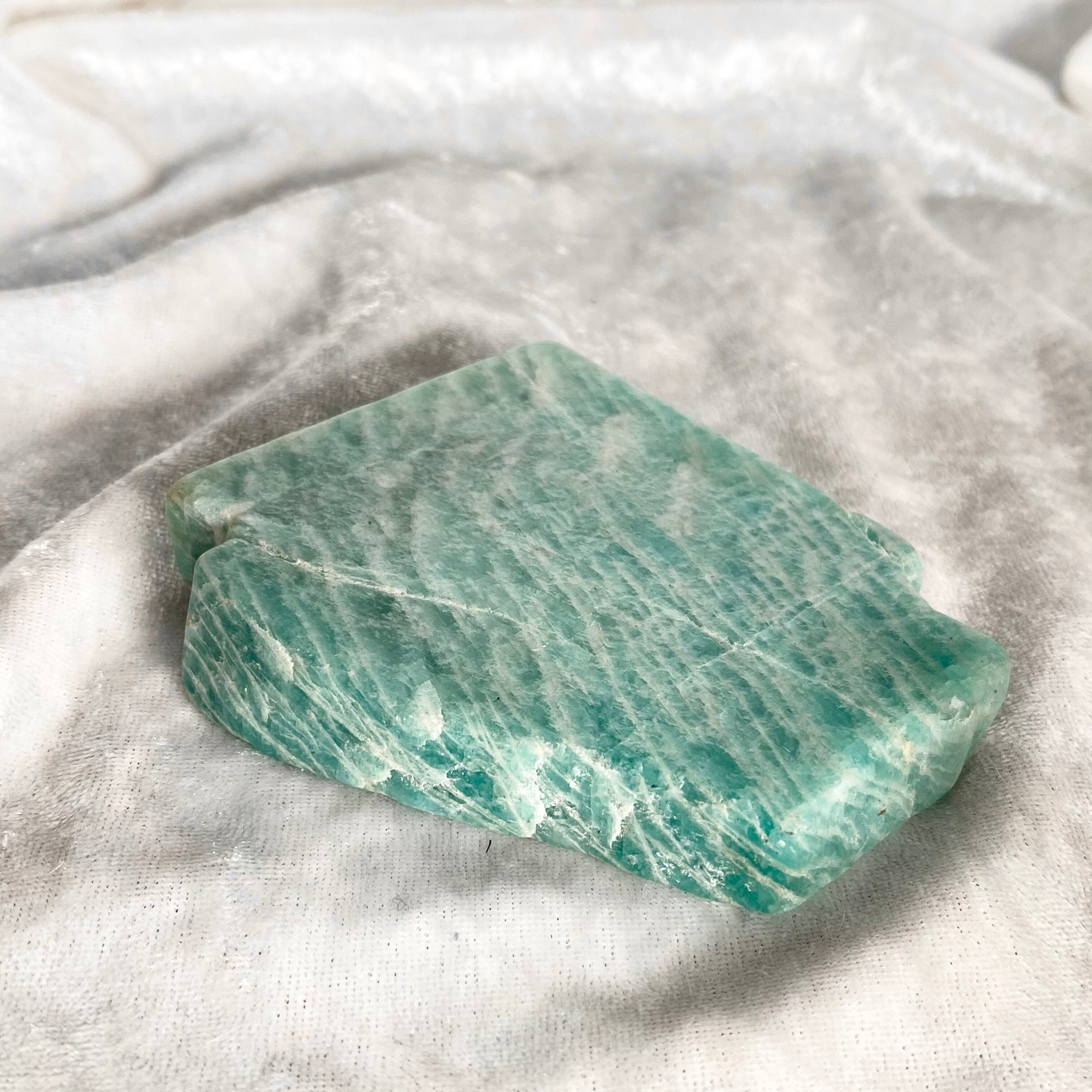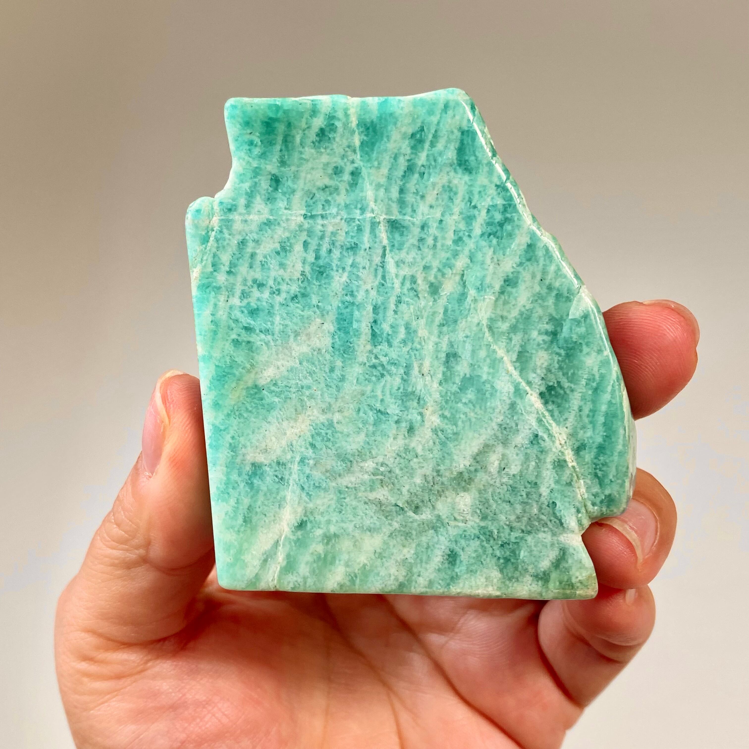 淡いブルーグリーンが美しいアマゾナイトを、大きなスライス状に仕上げた一点もののプレートです。