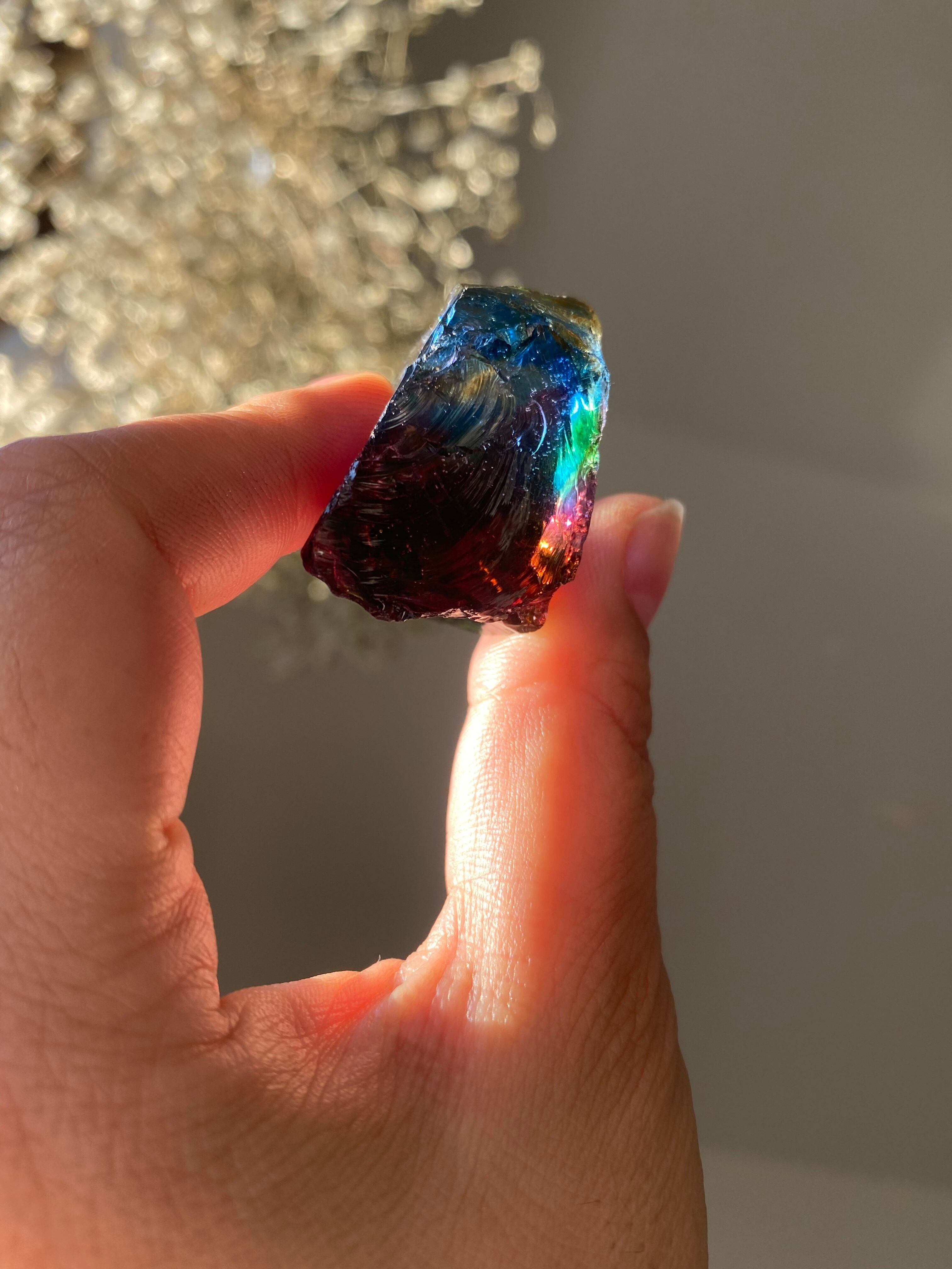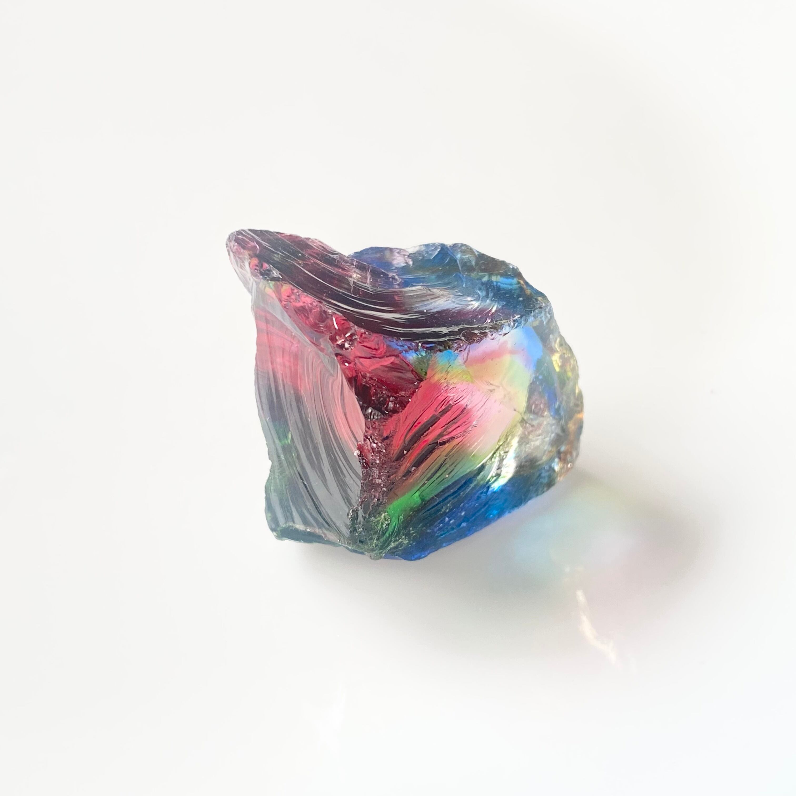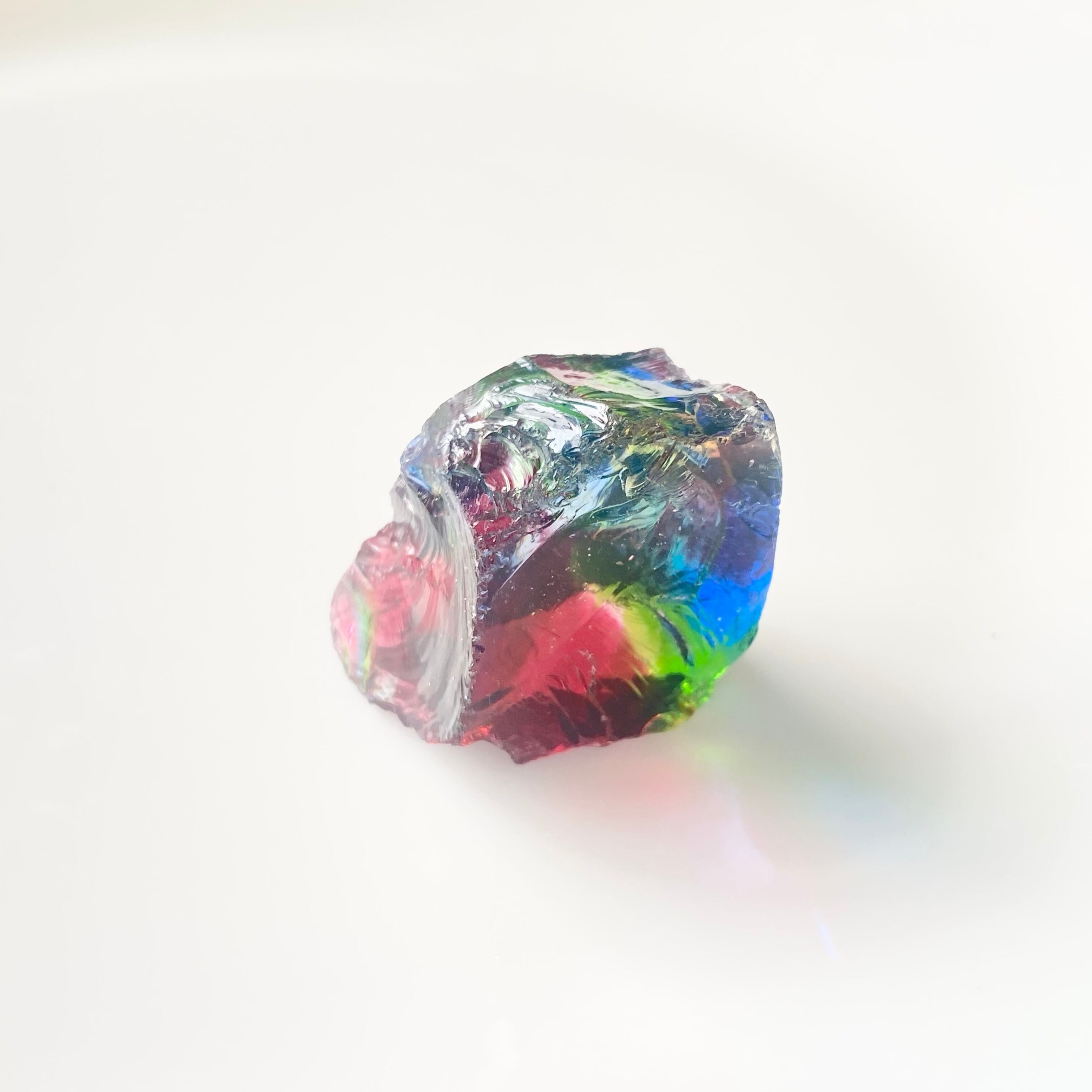 光を通すたびに赤・青・緑のグラデーションが現れ、まるで魂の奥に眠る光を思い出させるような存在感を放ちます。