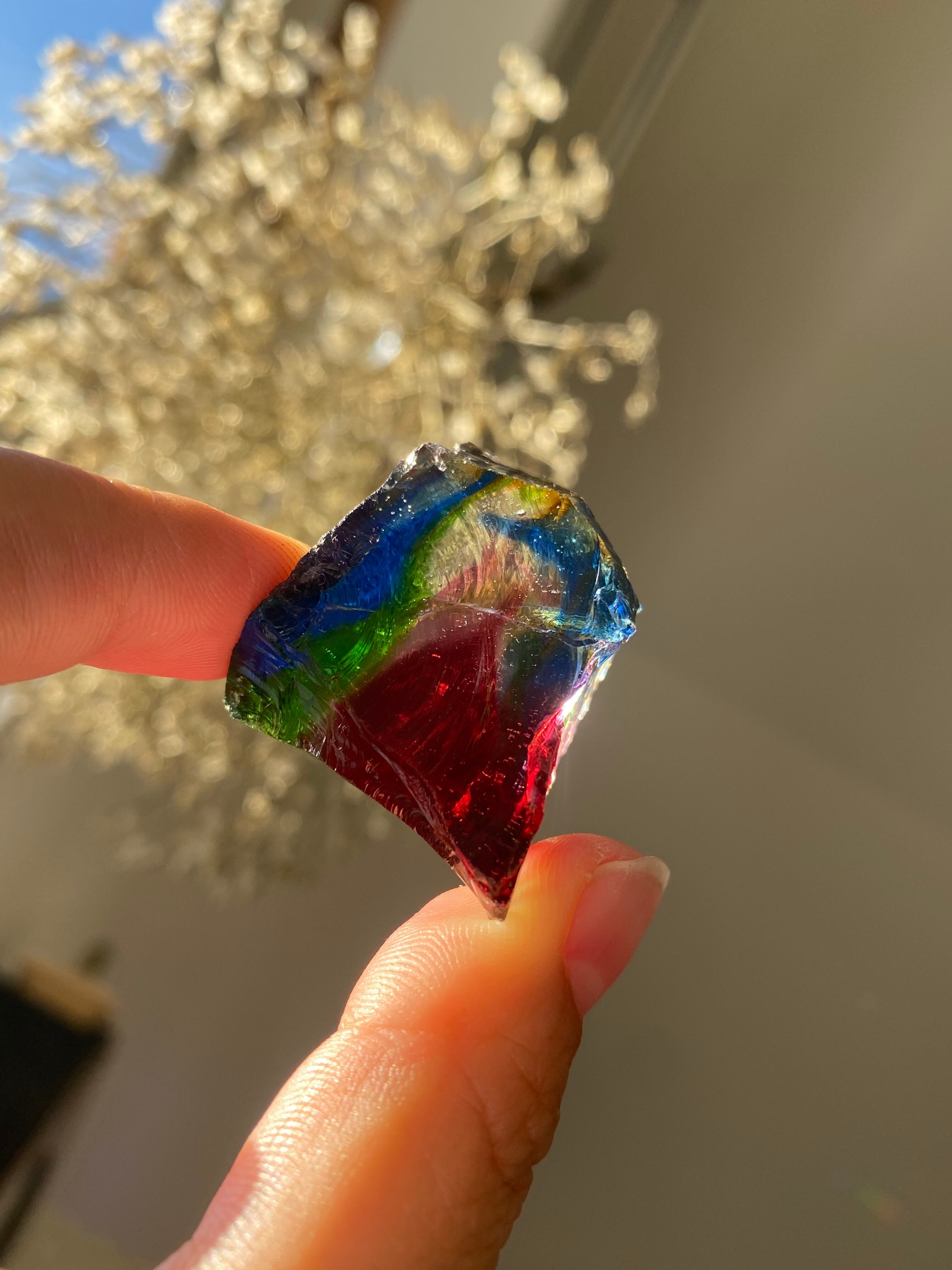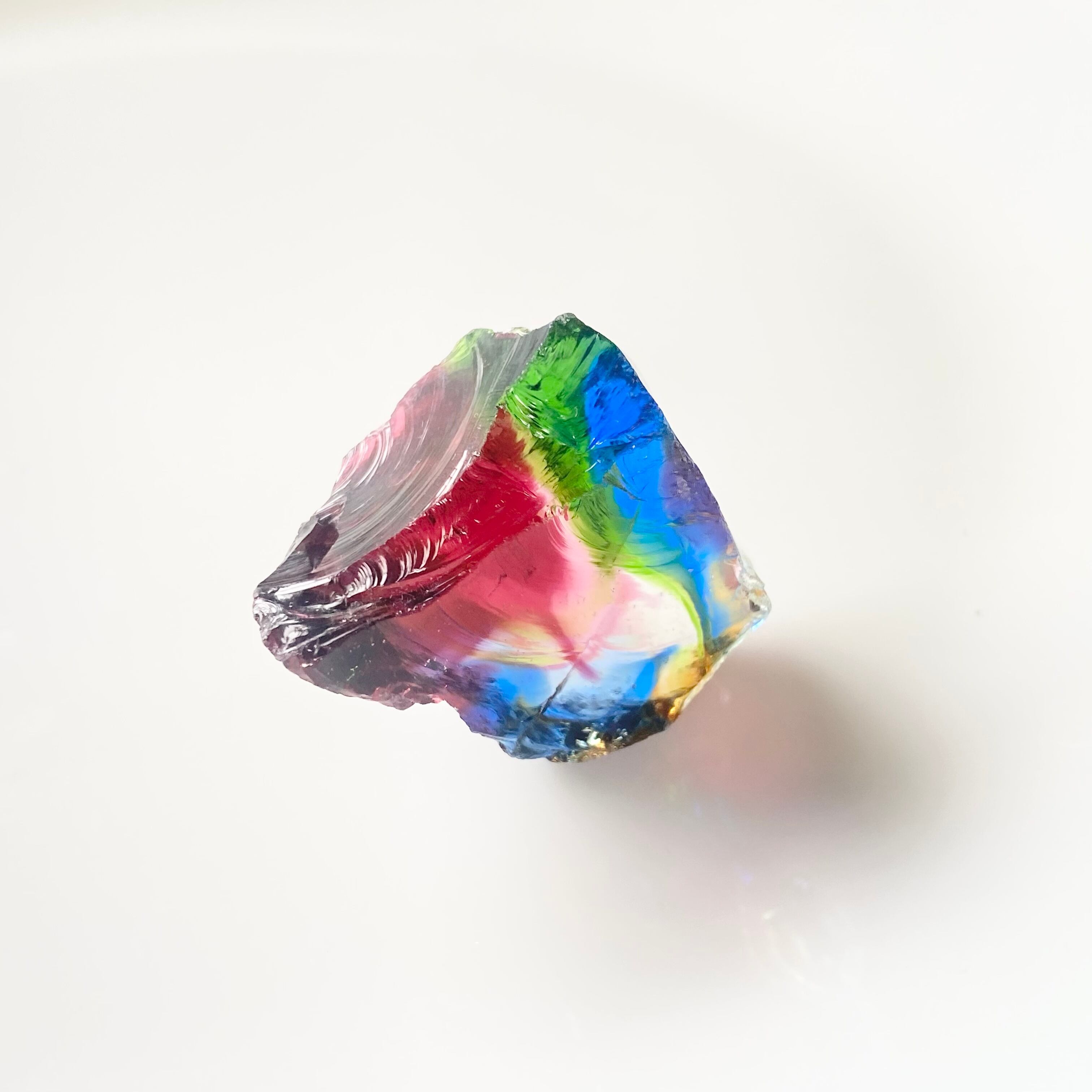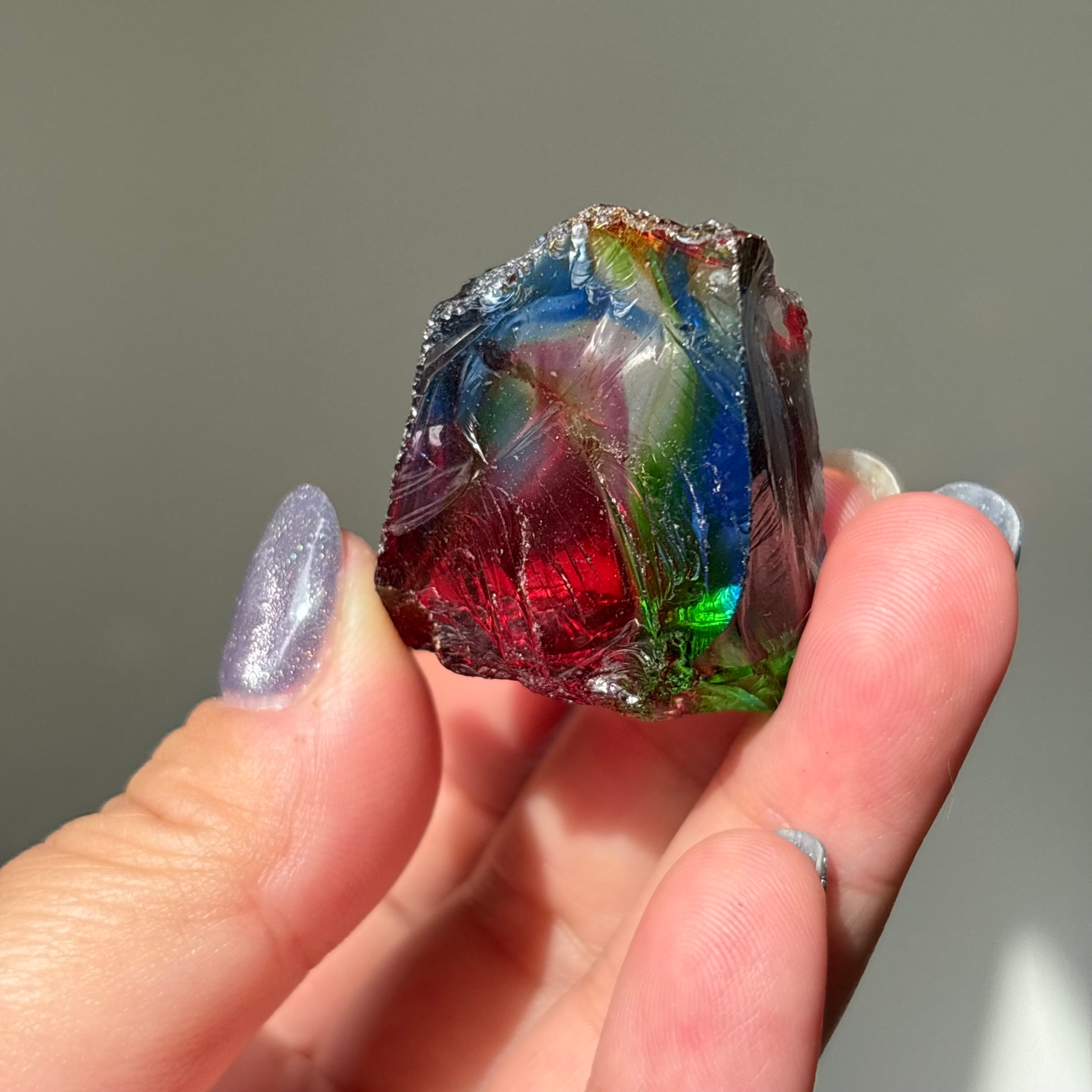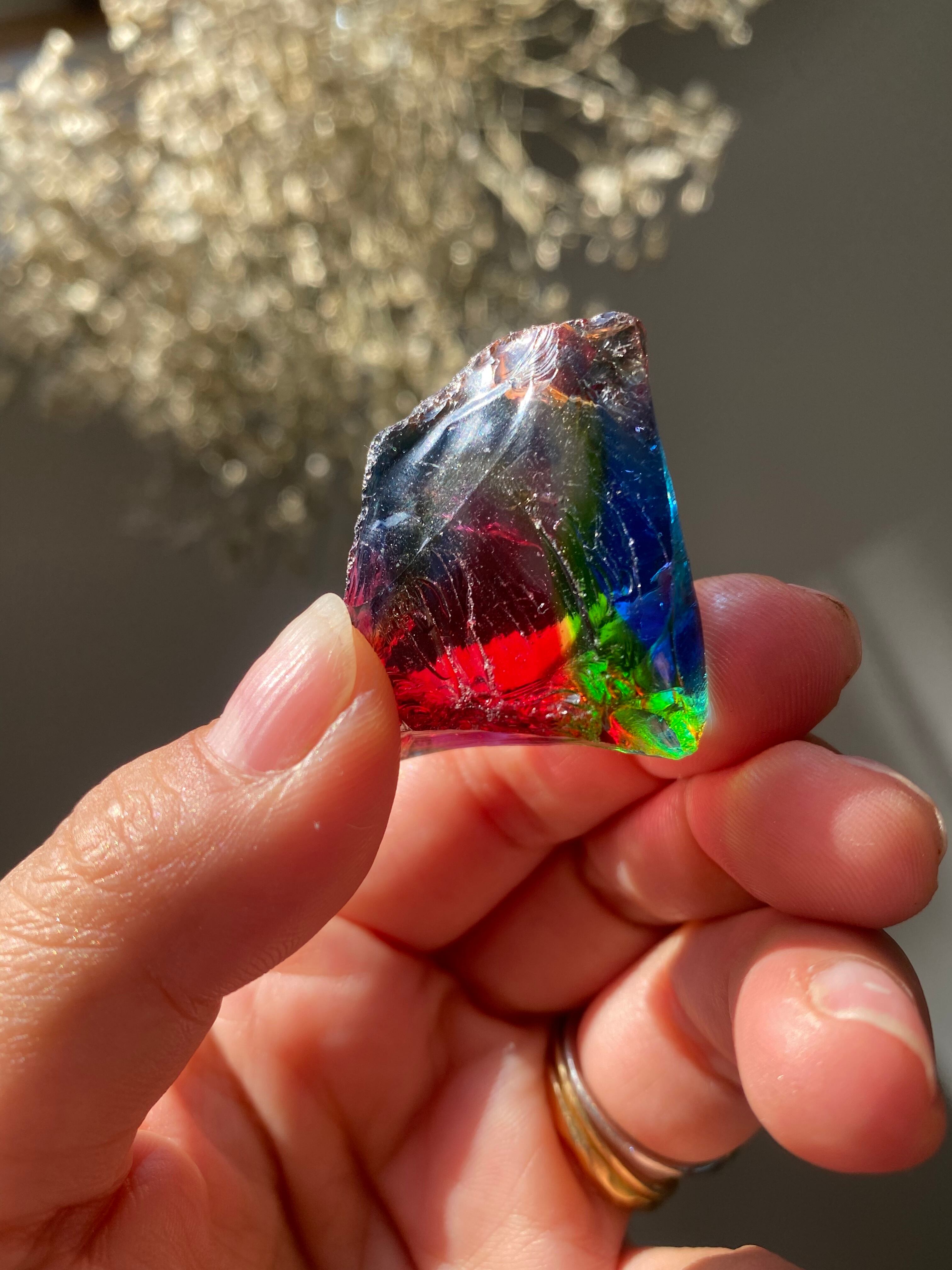 光を通すたびに赤・青・緑のグラデーションが現れ、まるで魂の奥に眠る光を思い出させるような存在感を放ちます。