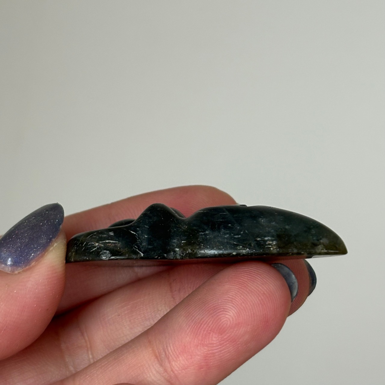 深く静かなグレーの中に、青や金の光が神秘的にきらめくラブラドライト。
