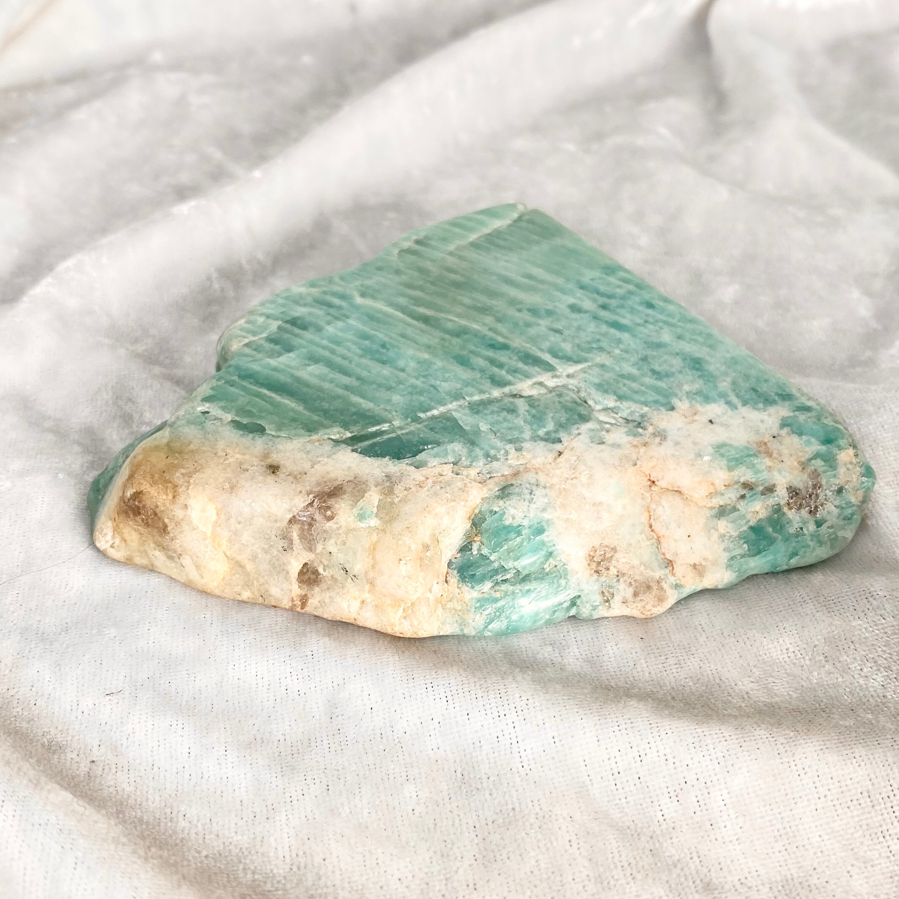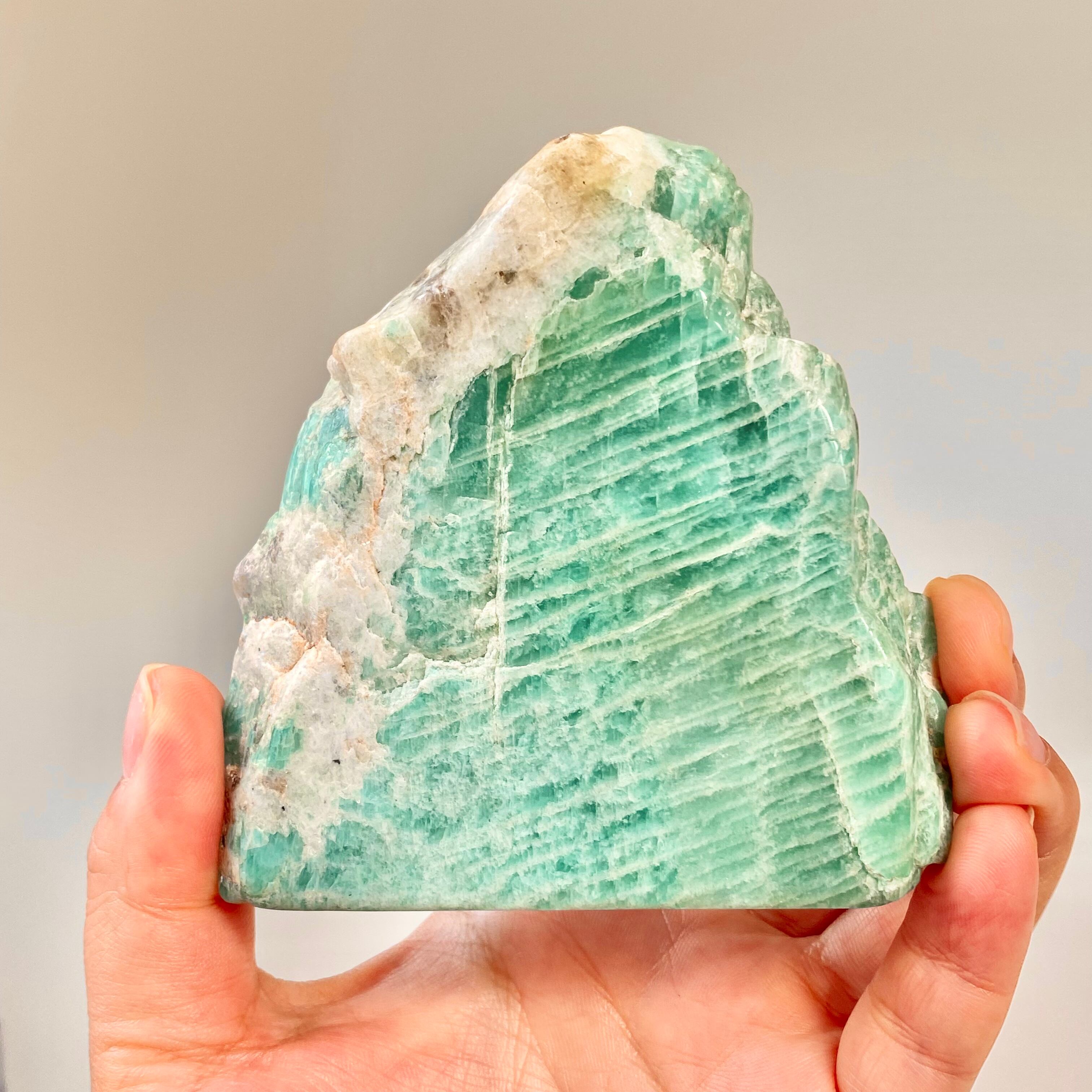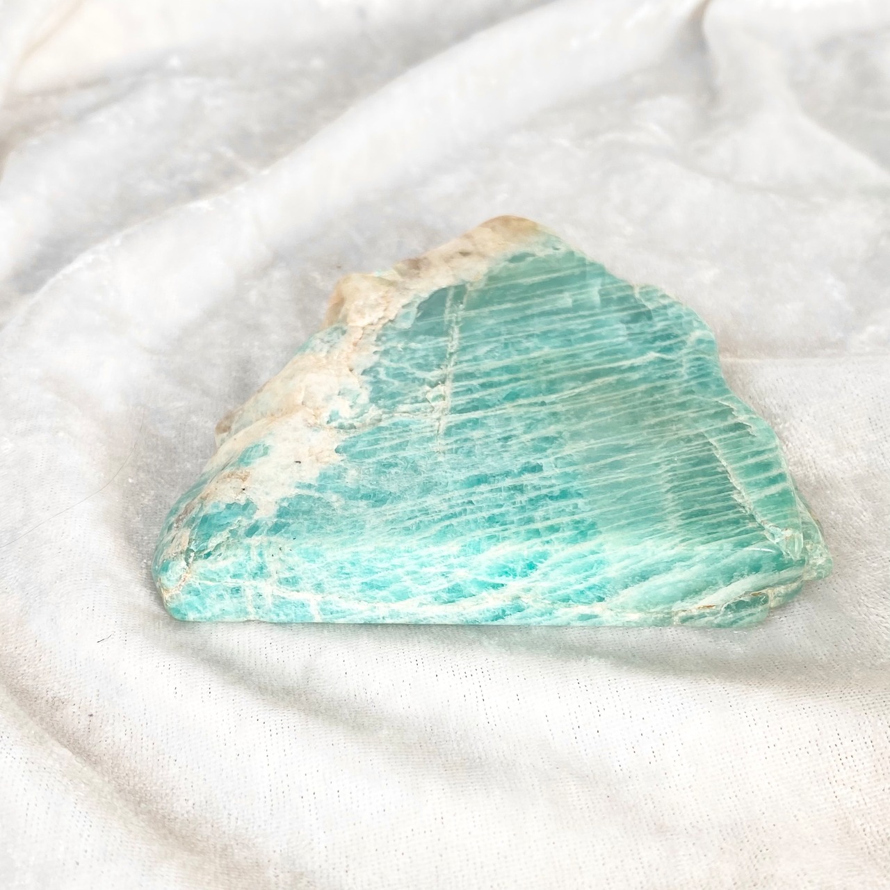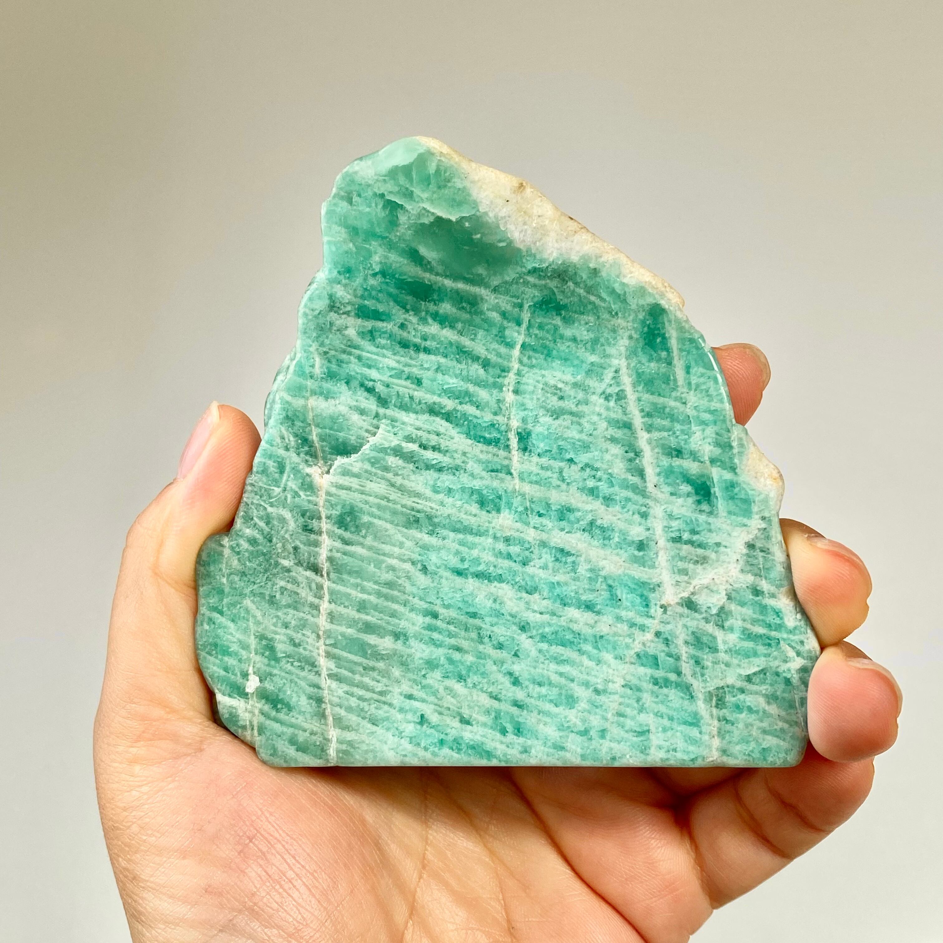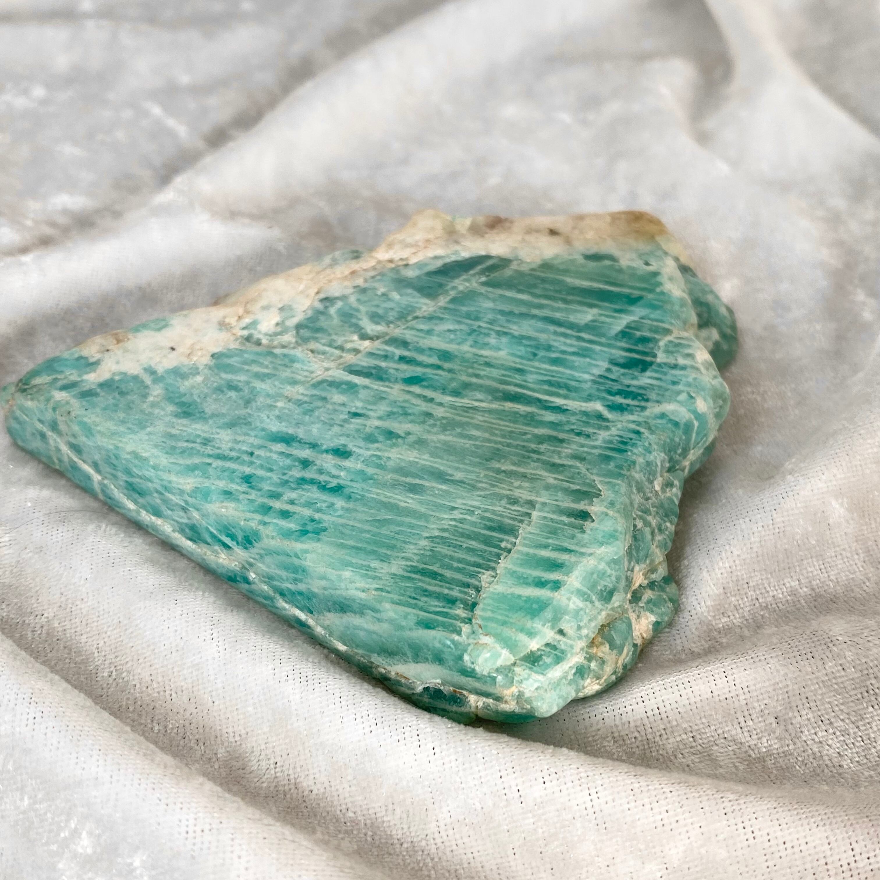 淡いブルーグリーンが美しいアマゾナイトを、大きなスライス状に仕上げた一点もののプレートです。