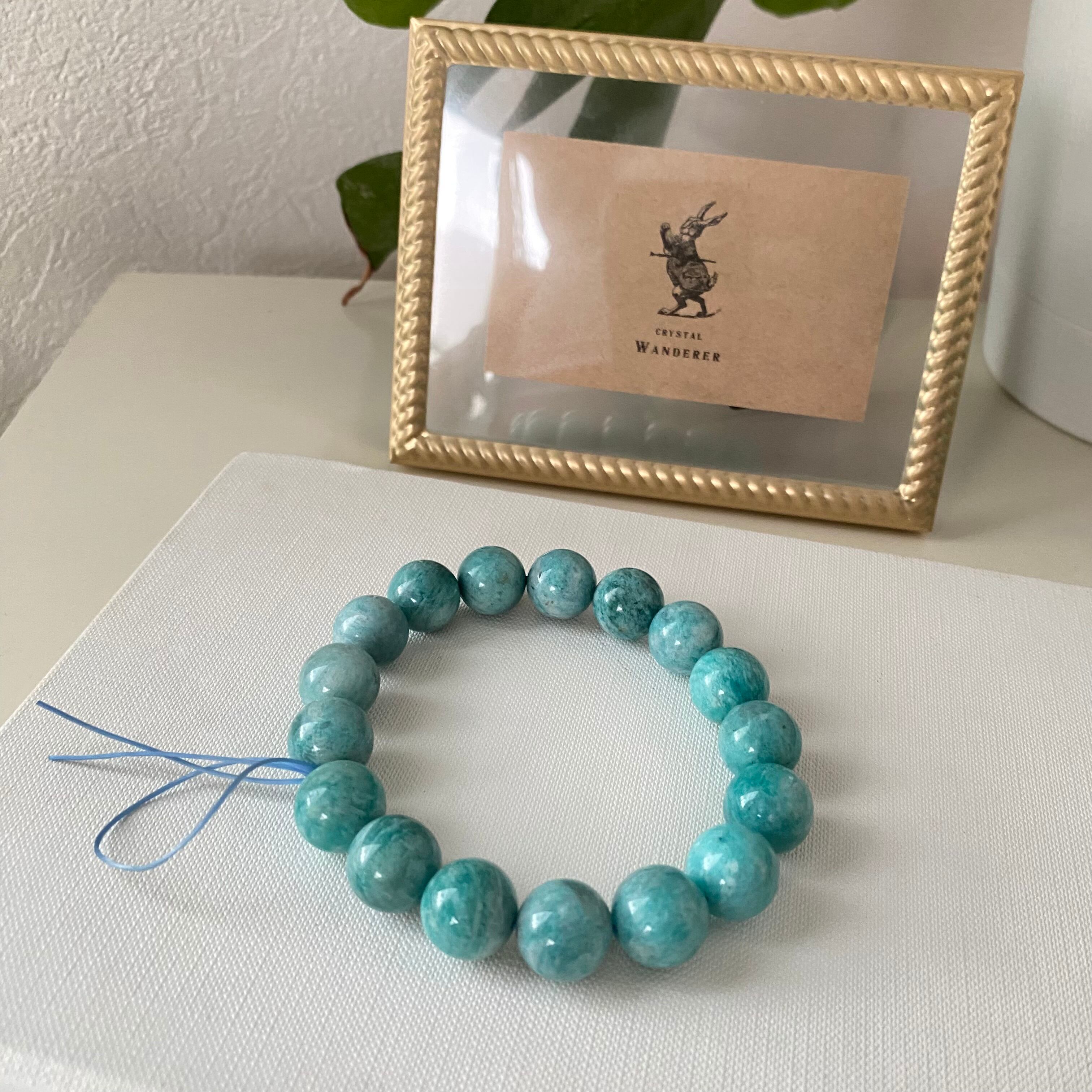 淡いミントブルーが手元を清らかに照らす、上質なアマゾナイトのブレスレットです。