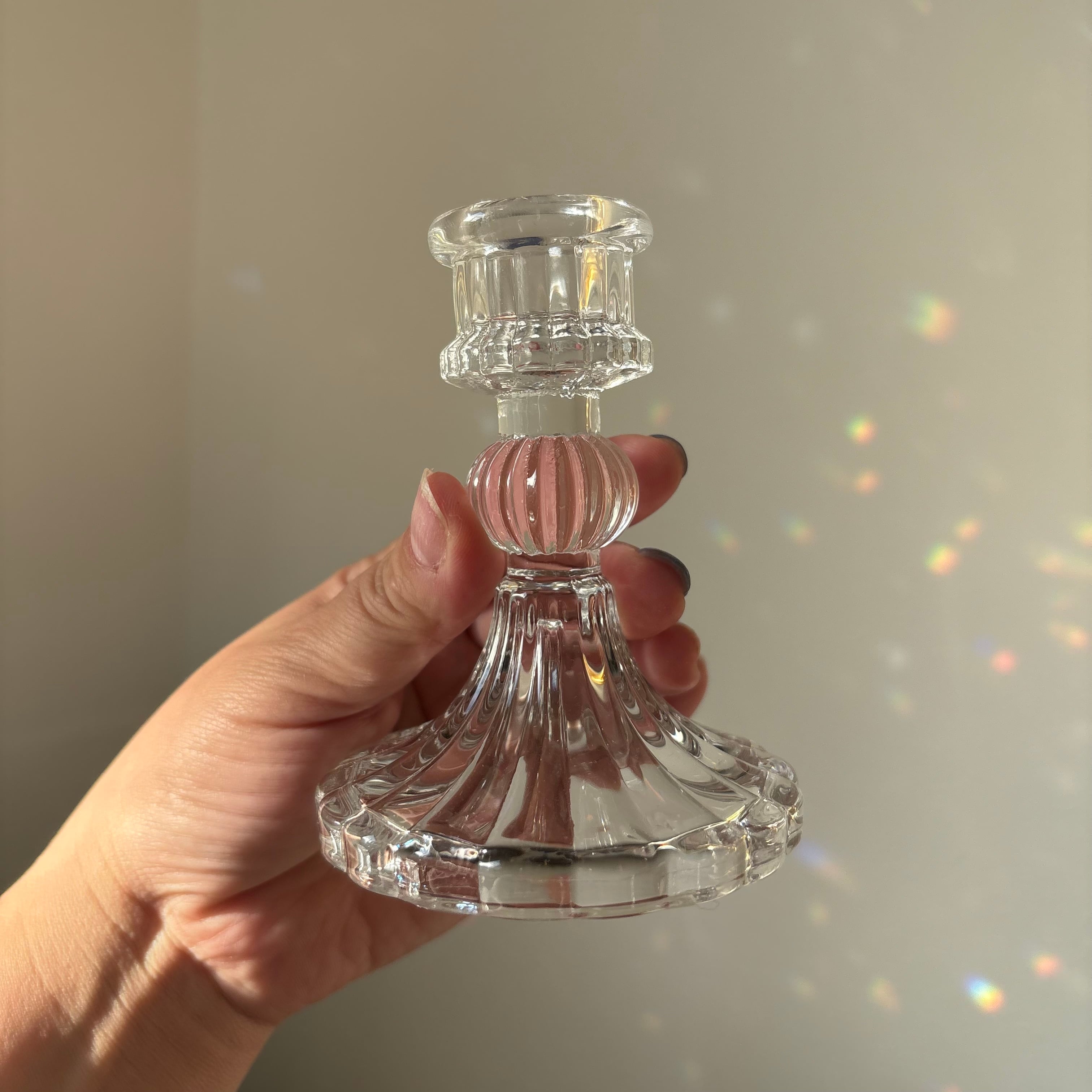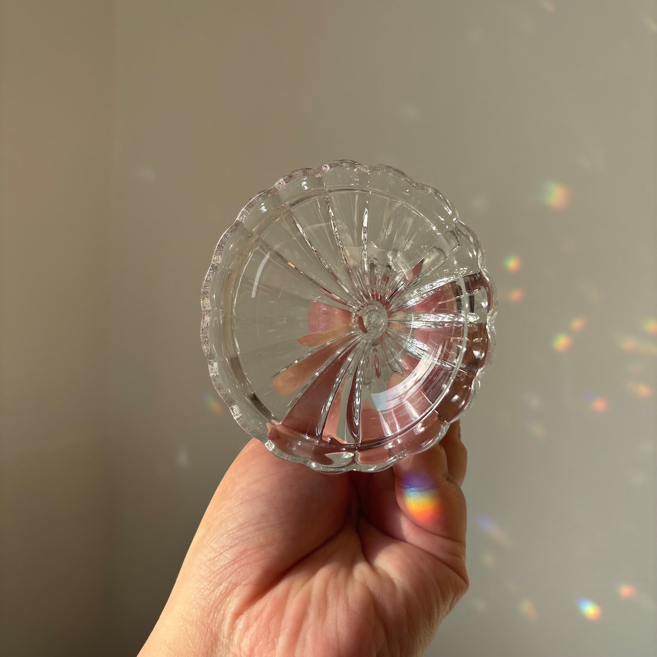 本来はキャンドルホルダーですが、スフィアを優雅に飾る台座としても相性抜群。透明感のあるガラスが、光を受けてスフィアの内包物や虹を美しく引き立ててくれます。