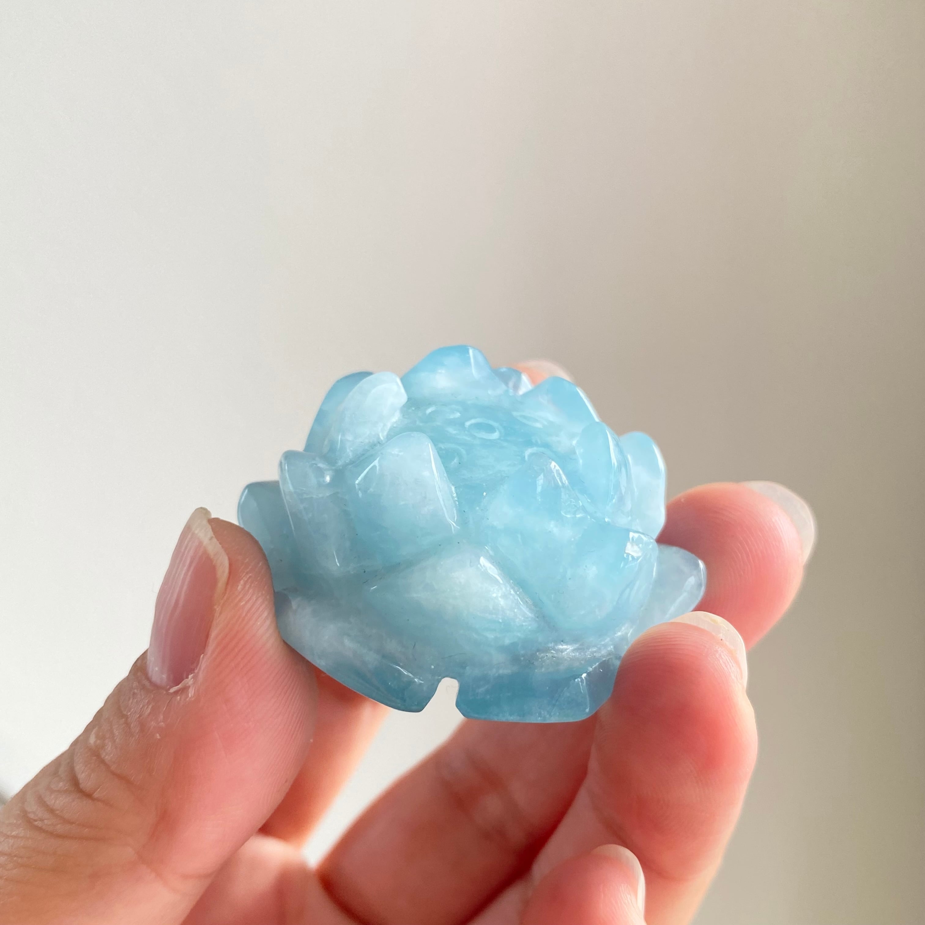 澄んだ水色のアクアマリンを、繊細な蓮の花のかたちに彫刻した美しい一点。