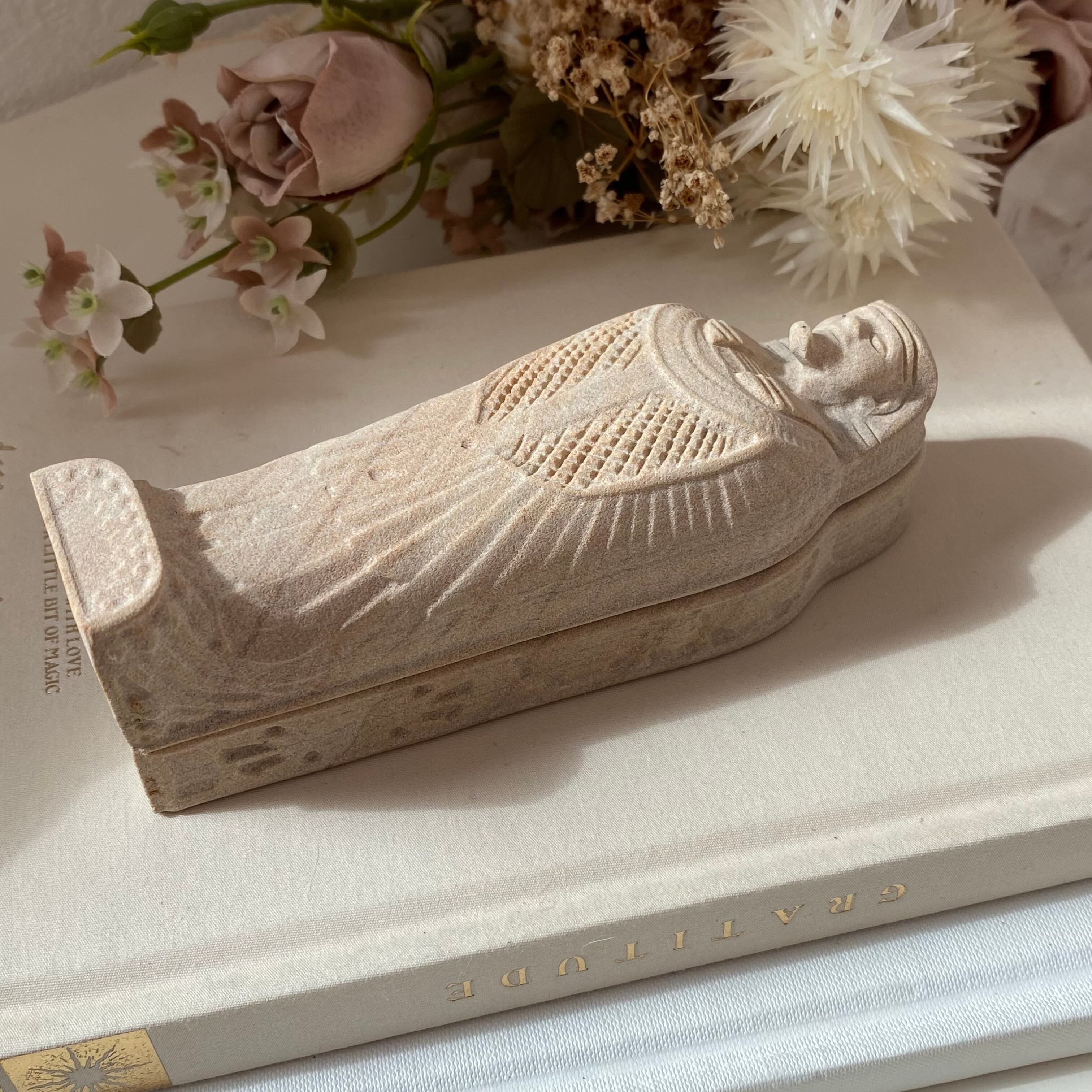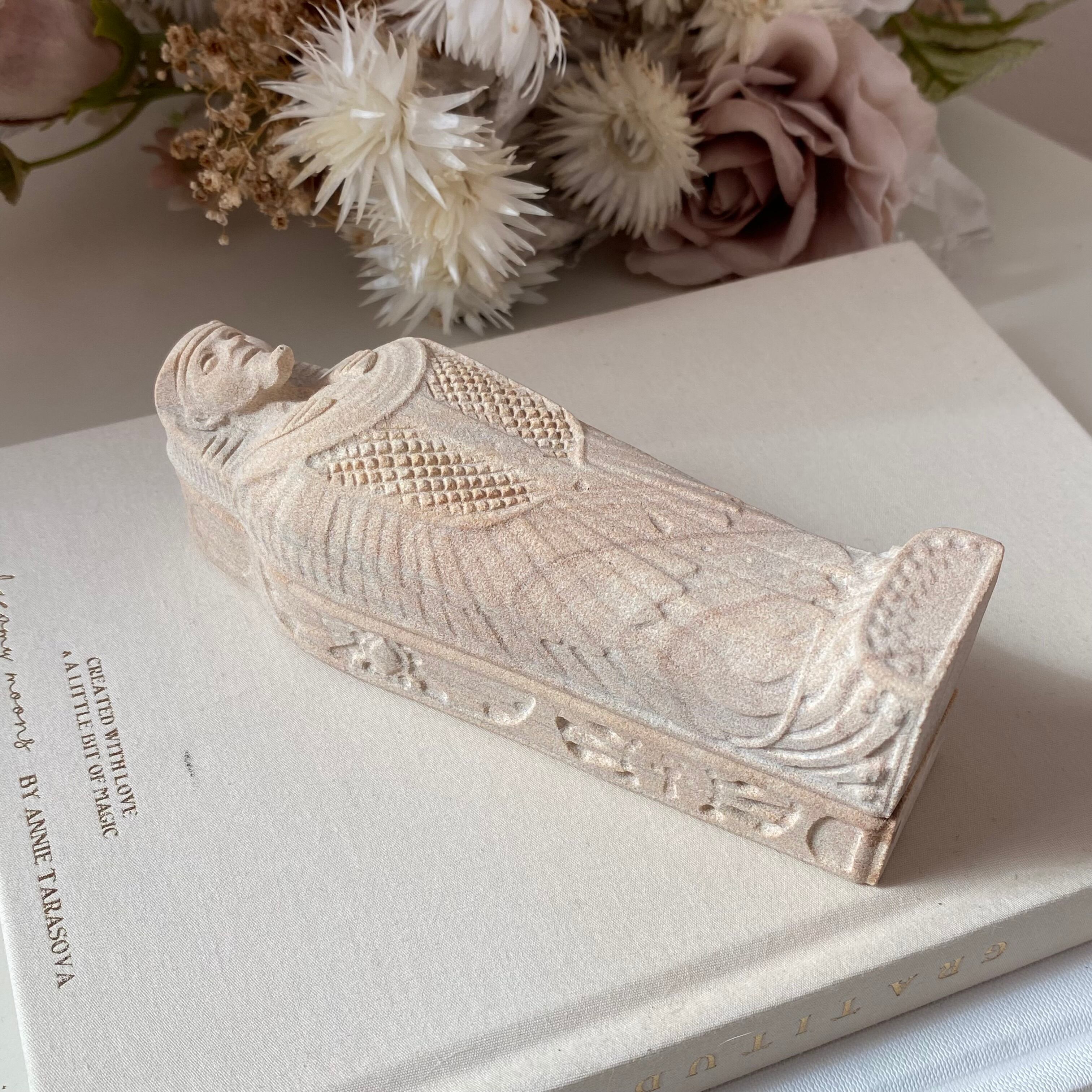 エジプトのミイラをモチーフにしたサンドストーンのカービングです。