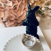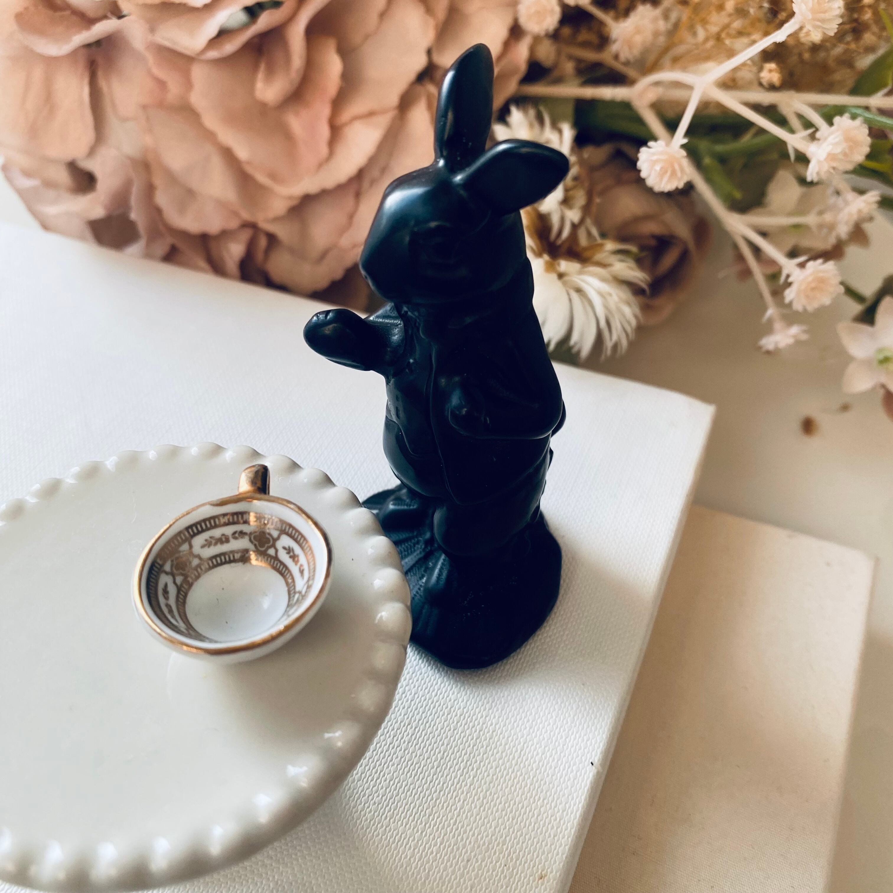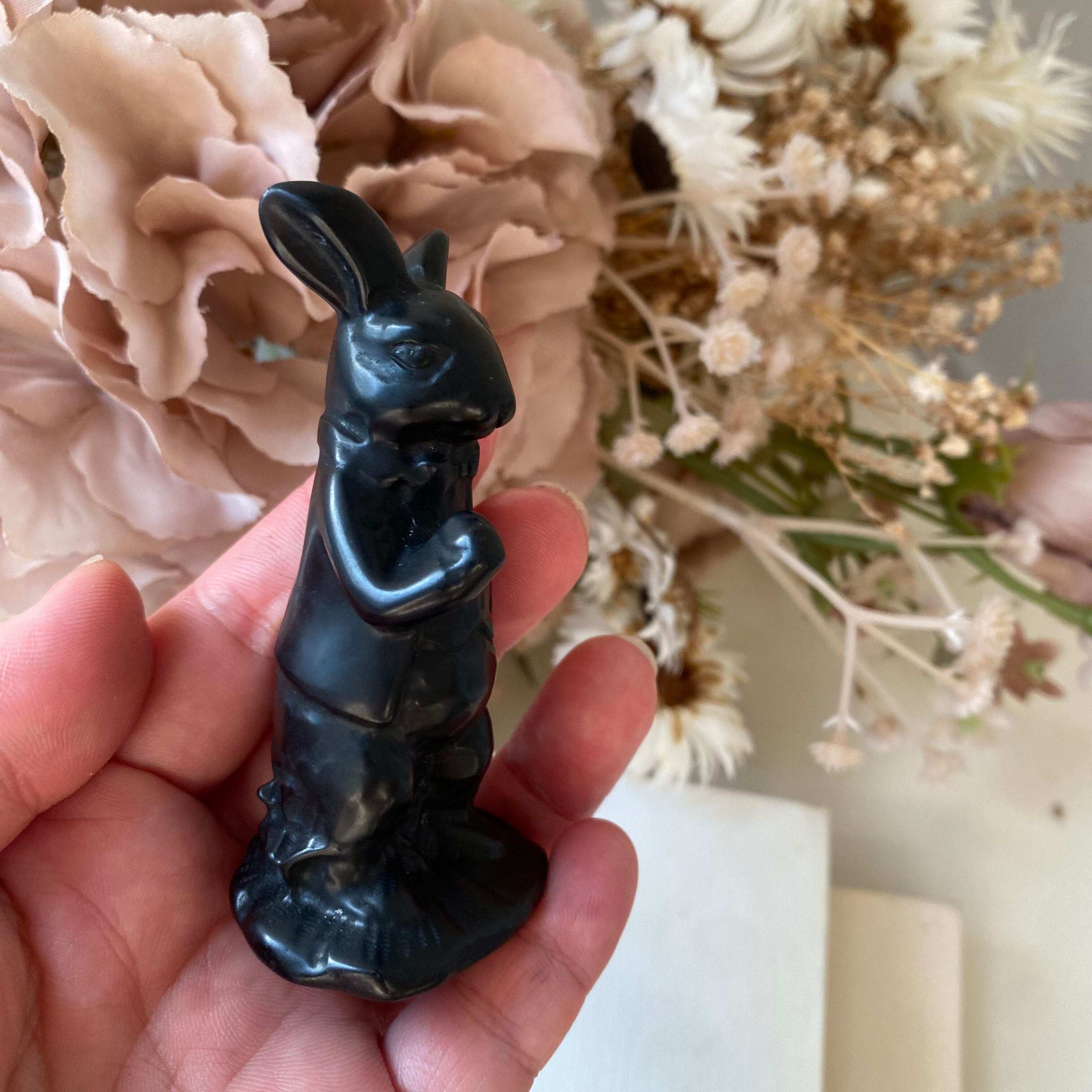 漆黒の輝きを持つブラックオブシディアンで彫られた、神秘的なうさぎのカービング。