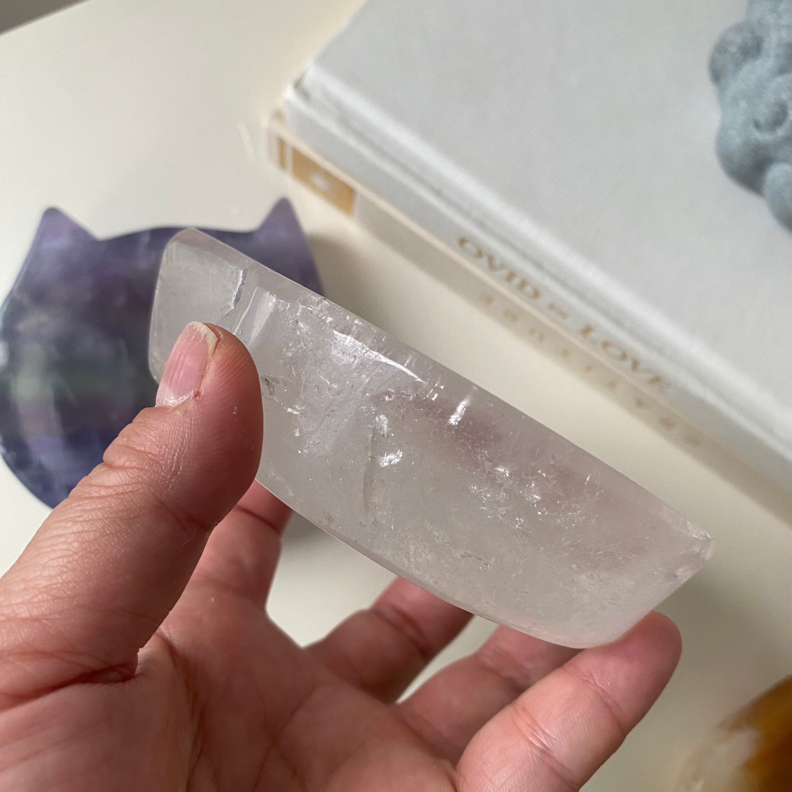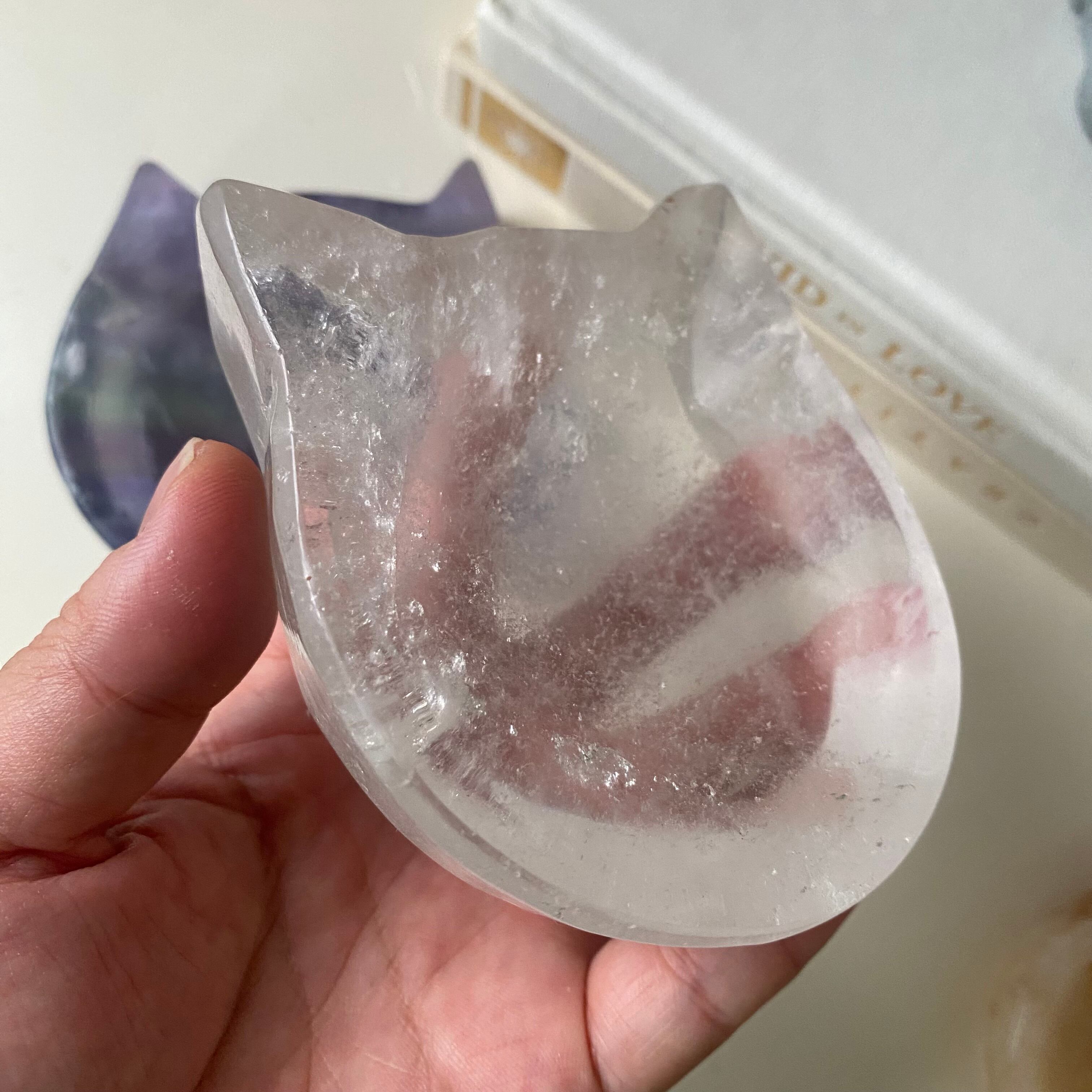 透明感のあるクリアクォーツで作られた、猫モチーフの美しいボウル。