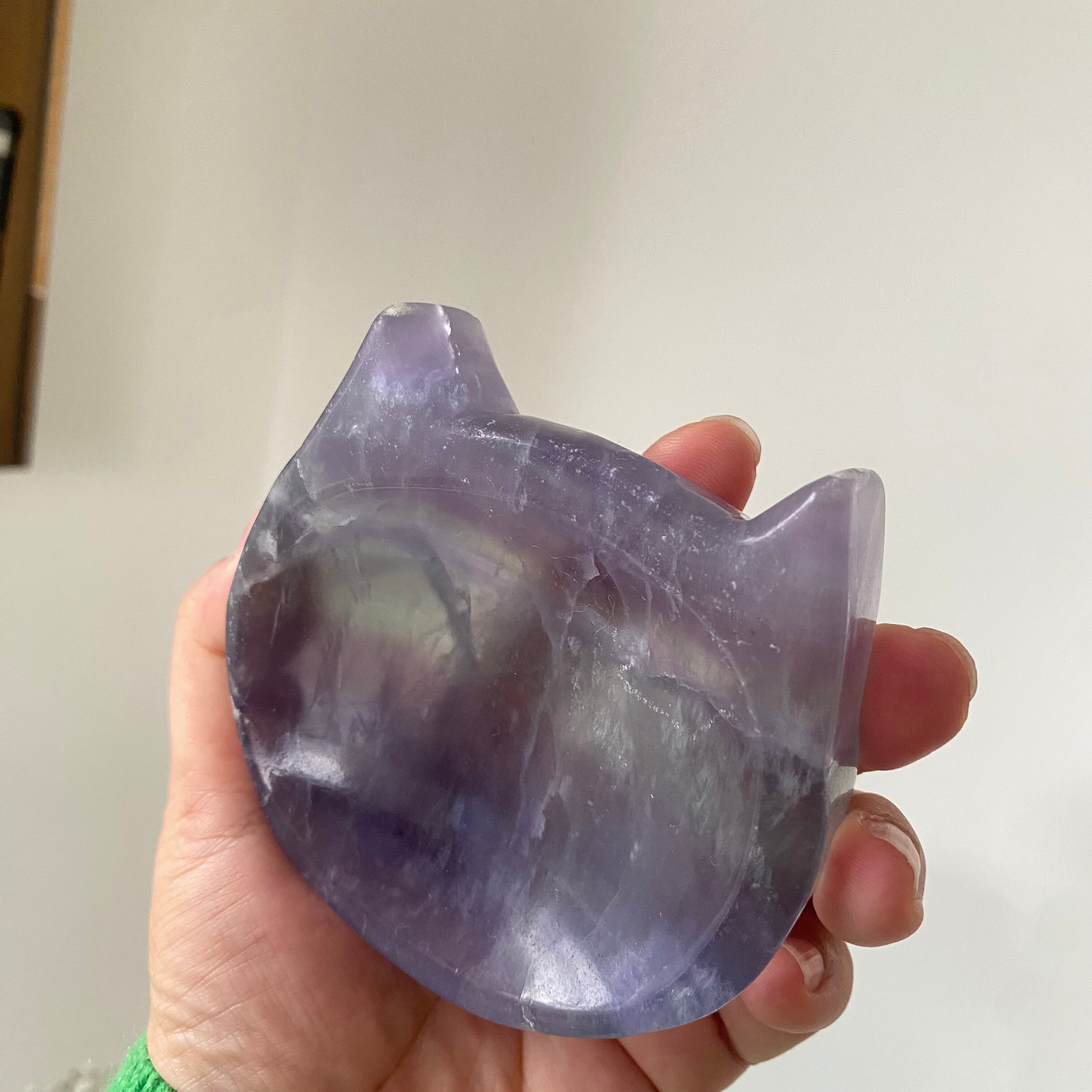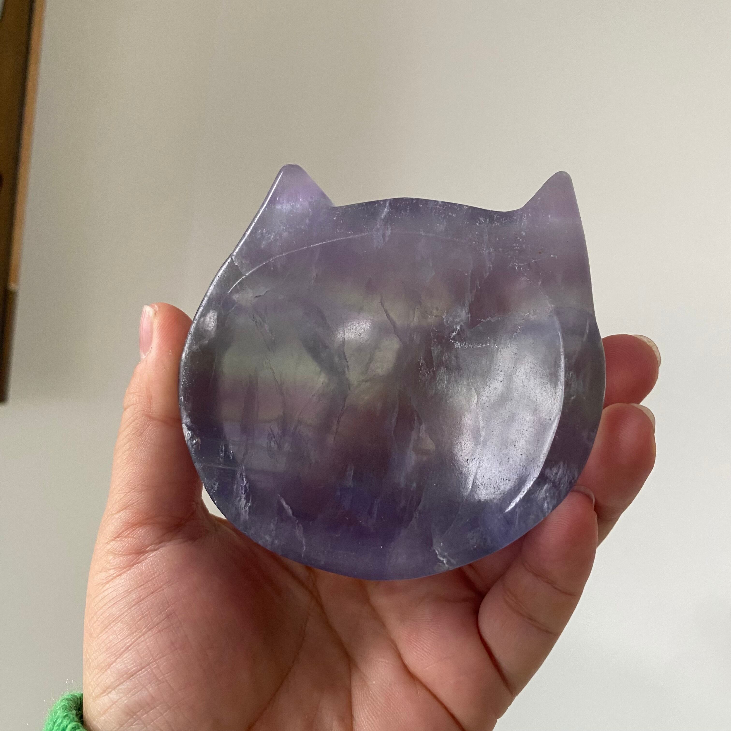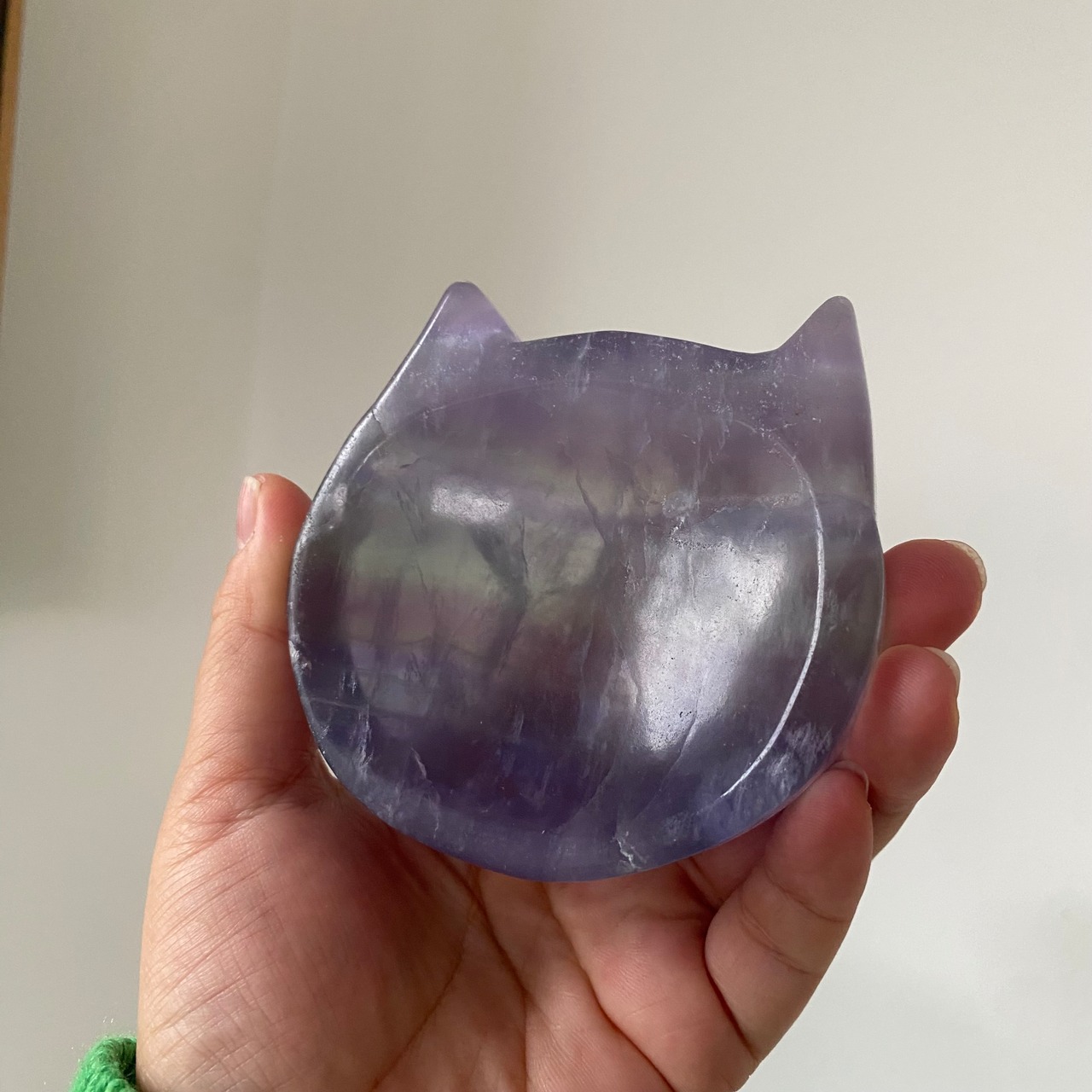 カラフルなフローライトで作られた、猫モチーフの美しいボウル。