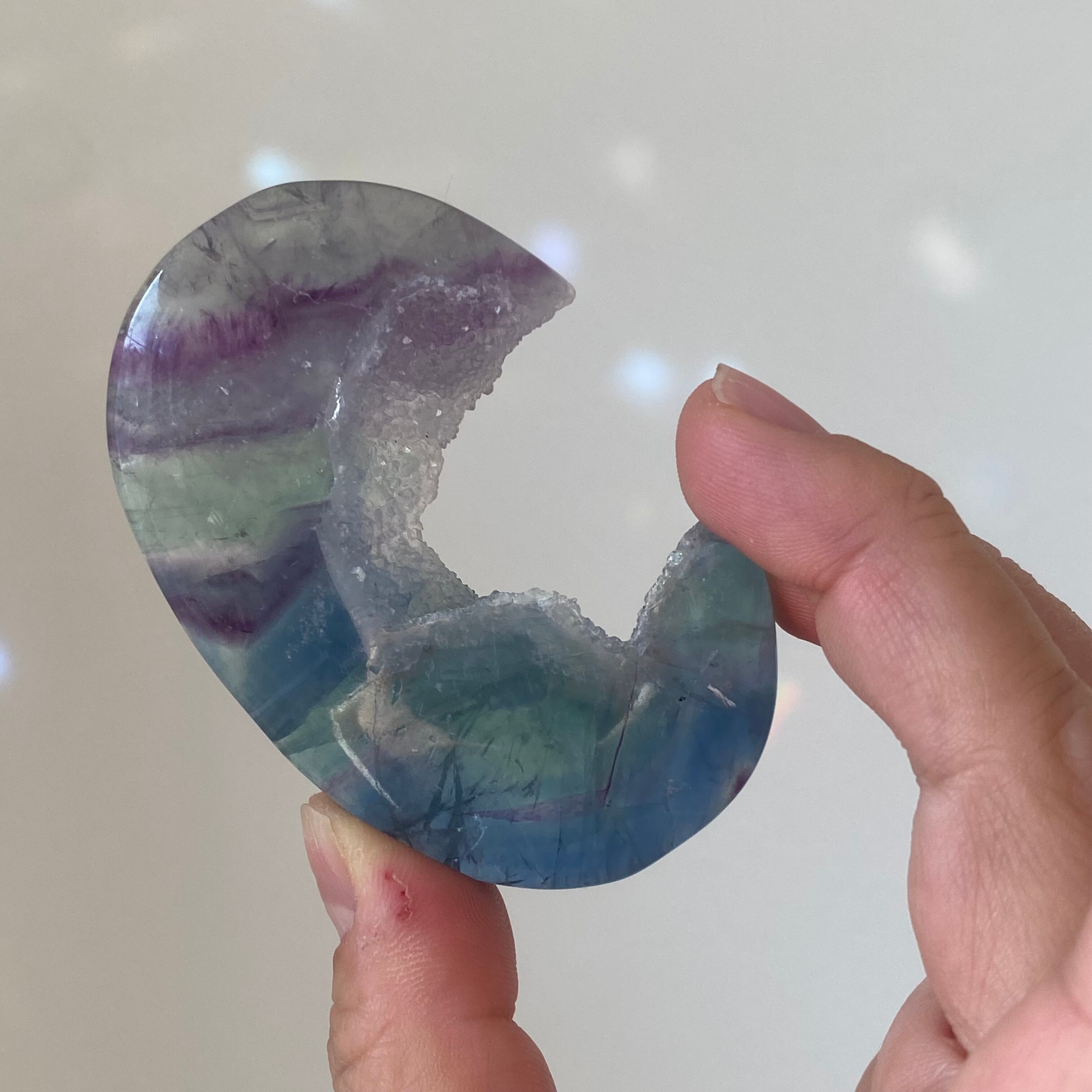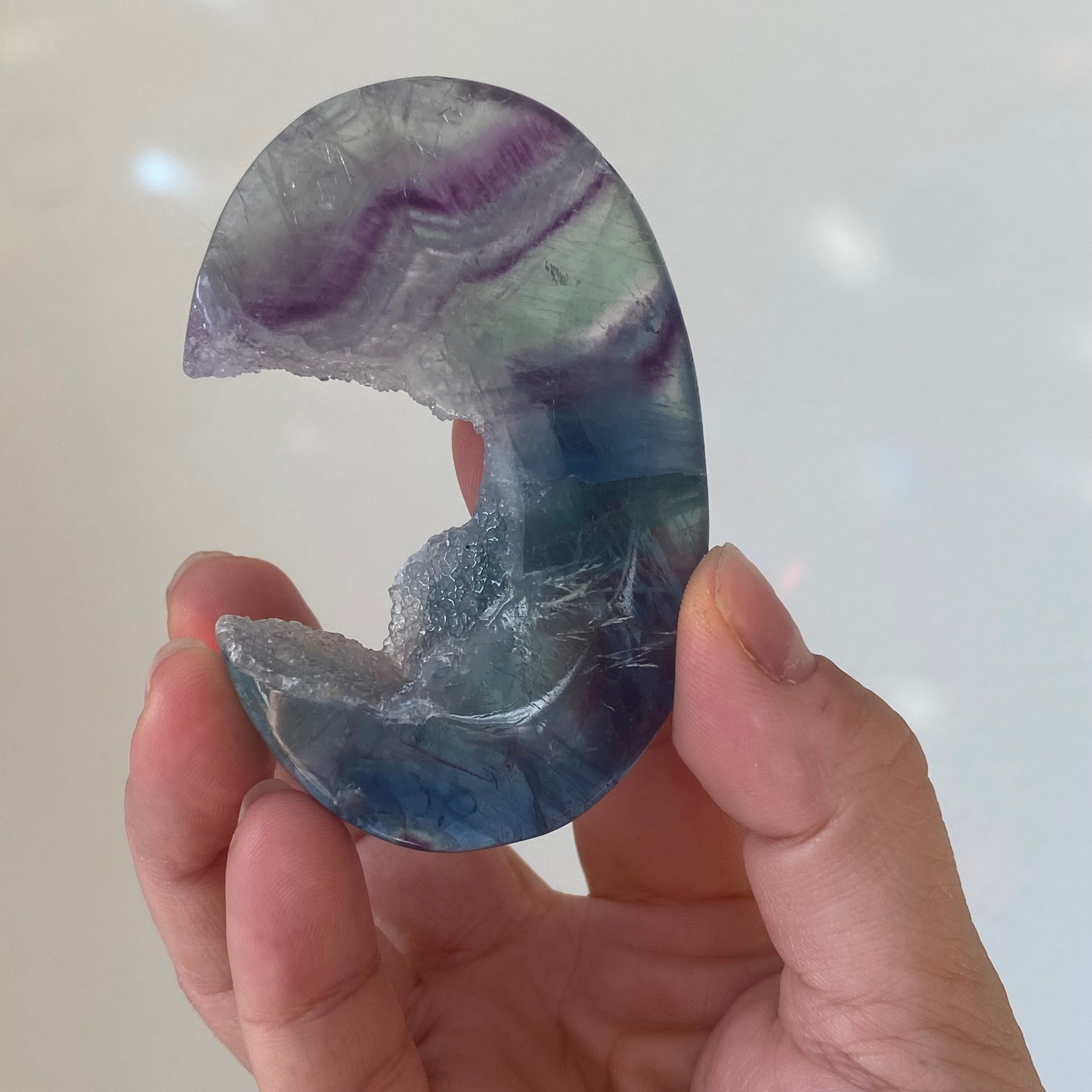 繊細な羽のような内包物が美しいフェザーフローライトのパームストーン。